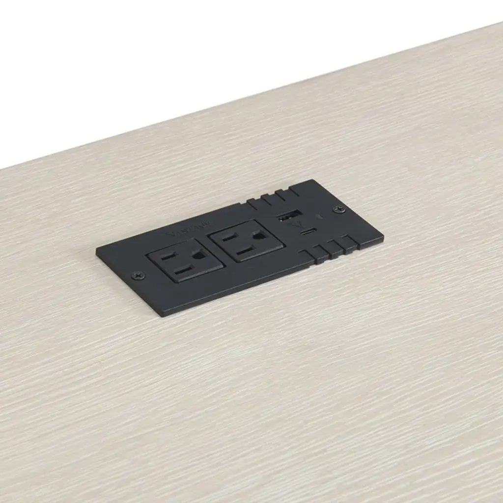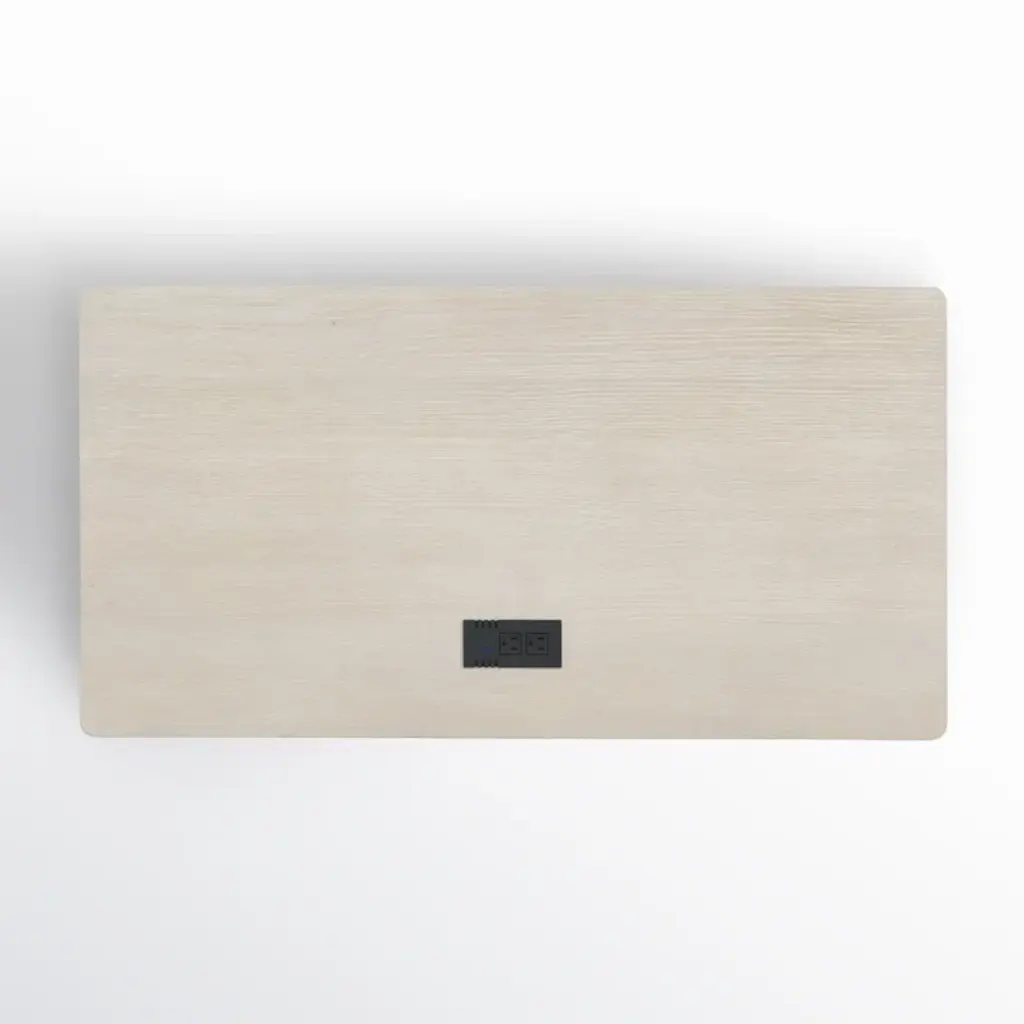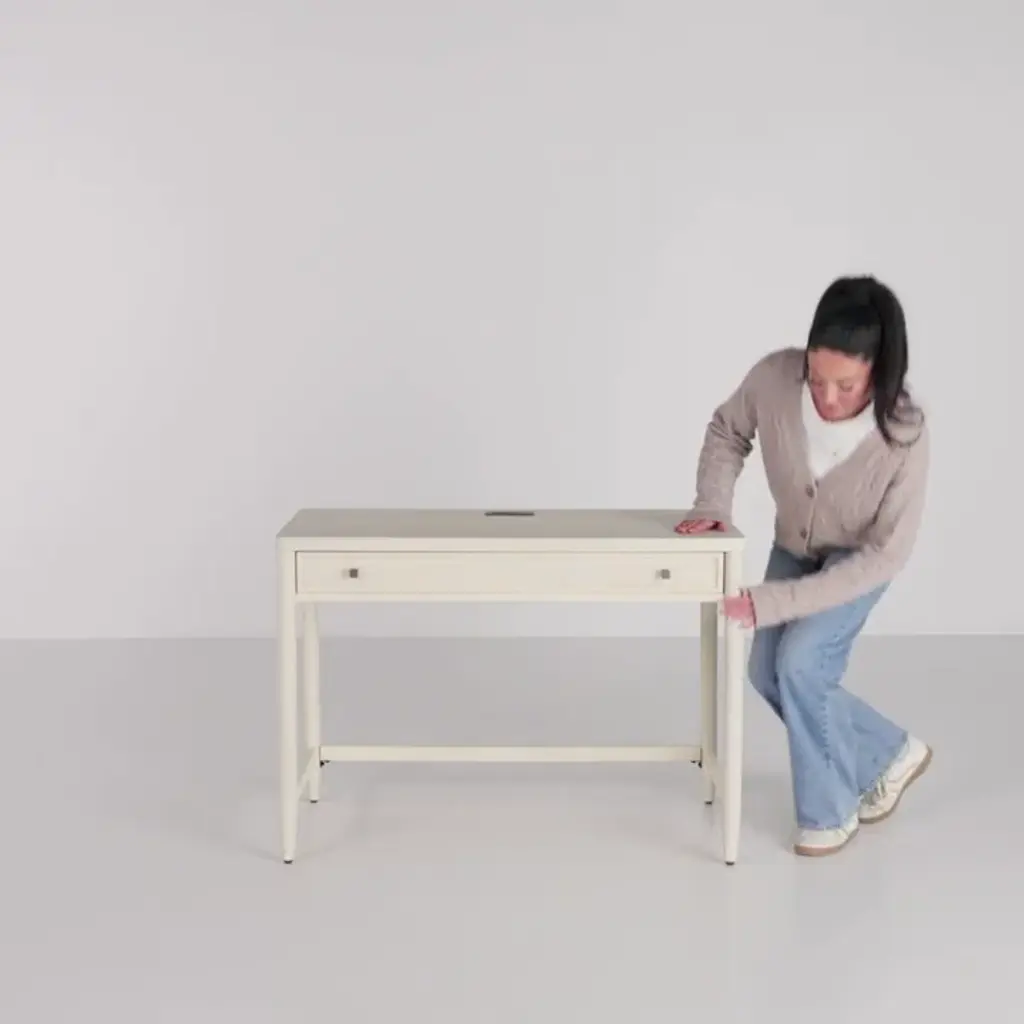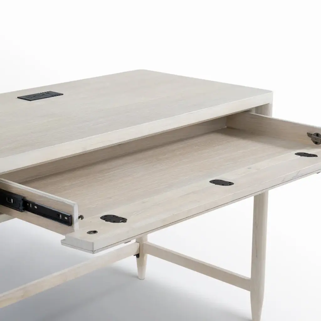 We love the clean lines and breezy grasscloth drawer front of this writing desk. It's made from wood with a white-sand finish that adds a certain brightness to your home office. The drawer runs the width of the piece, giving you room for supplies and making it easy to keep the surface clear for your laptop and coffee mug. Plus, outlets and USB ports keep your devices fully charged and at the ready.