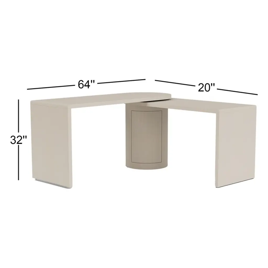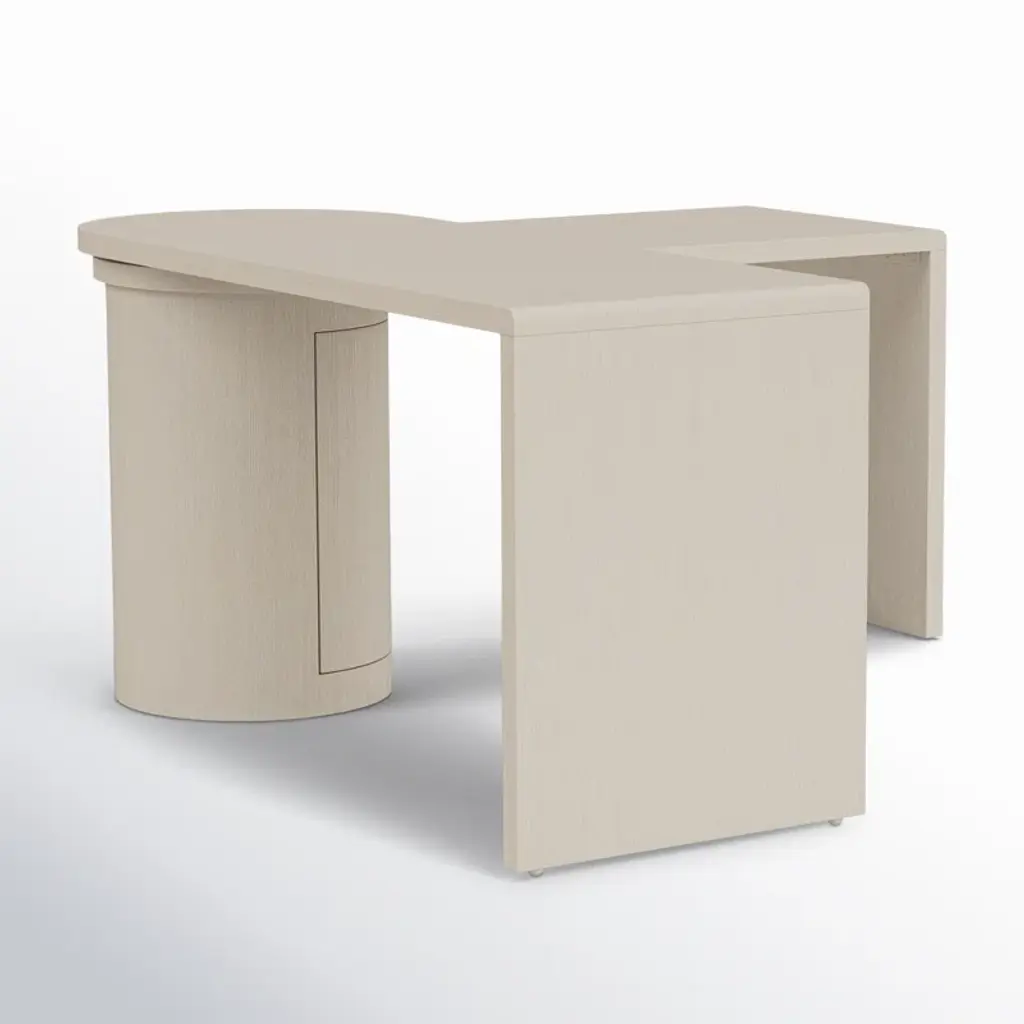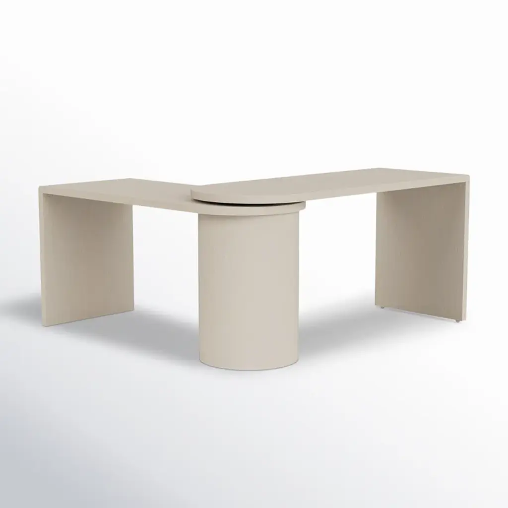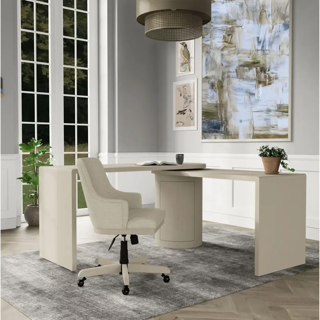 Our adjustable executive desk features an L-shaped design that's just right for any corner in your home. A wooden frame, pedestal base, and a white-sand finish lean into coastal cottage vibes. Plus, a cabinet nested within the central column post is the perfect spot for office supplies so you can leave the desktop free for your laptop and mug of coffee.