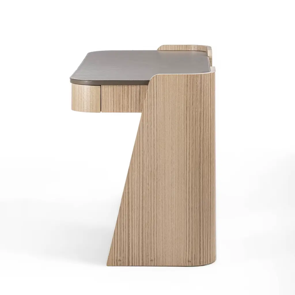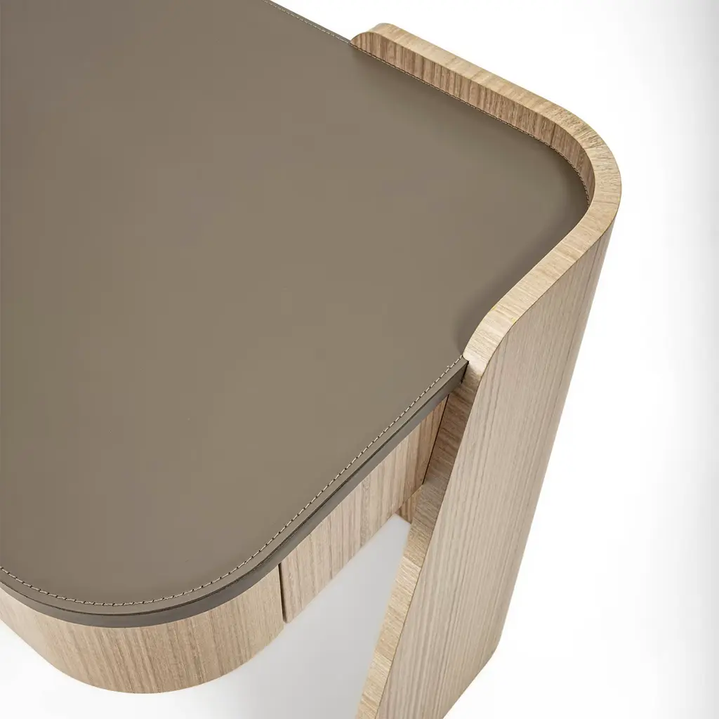 A sculptural silhouette defined by dynamic slanted cuts and enveloping curves marks this eye-catching desk from the Shape Collection. Offered in a luminous beige tone, the precious eucalyptus structure features two wide drawers sealed by a smooth top covered in fine leather. Designer: Giuseppe Carpanelli. Luxurious and unmistakably contemporary, the desk can be widely customized upon request to the Concierge.