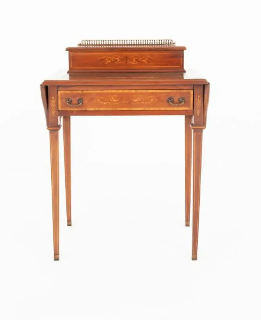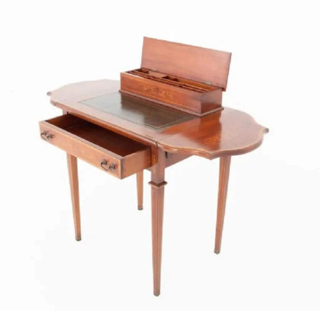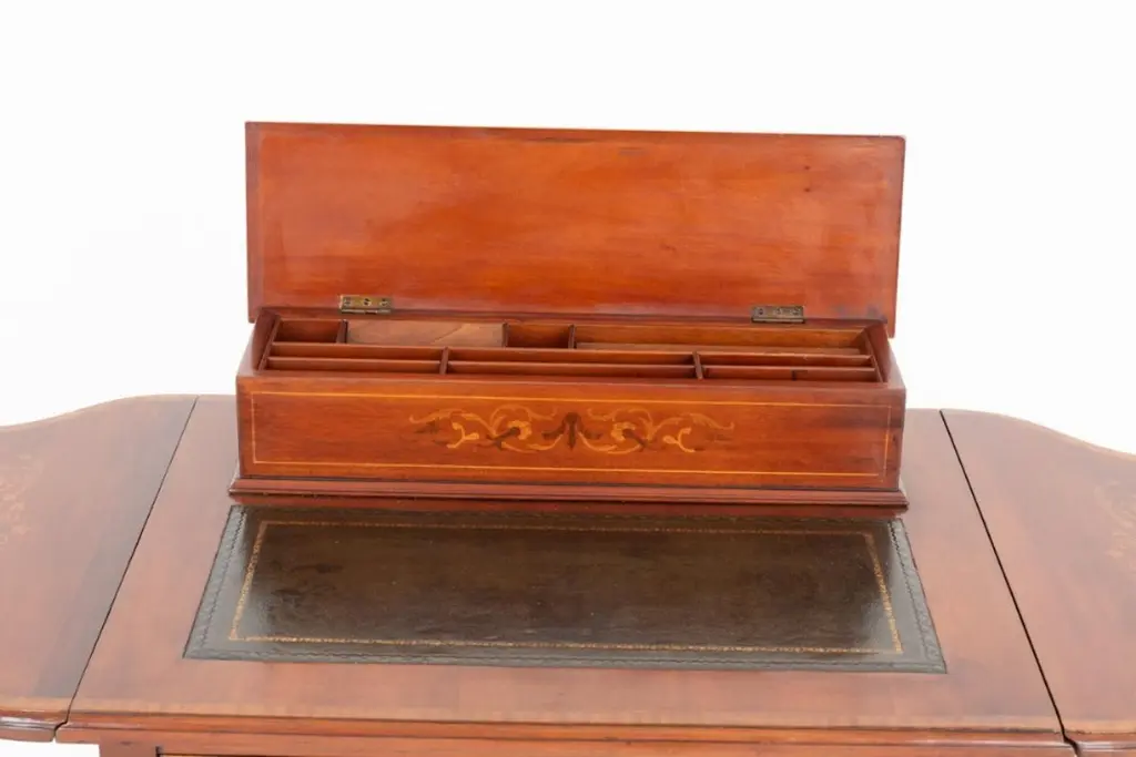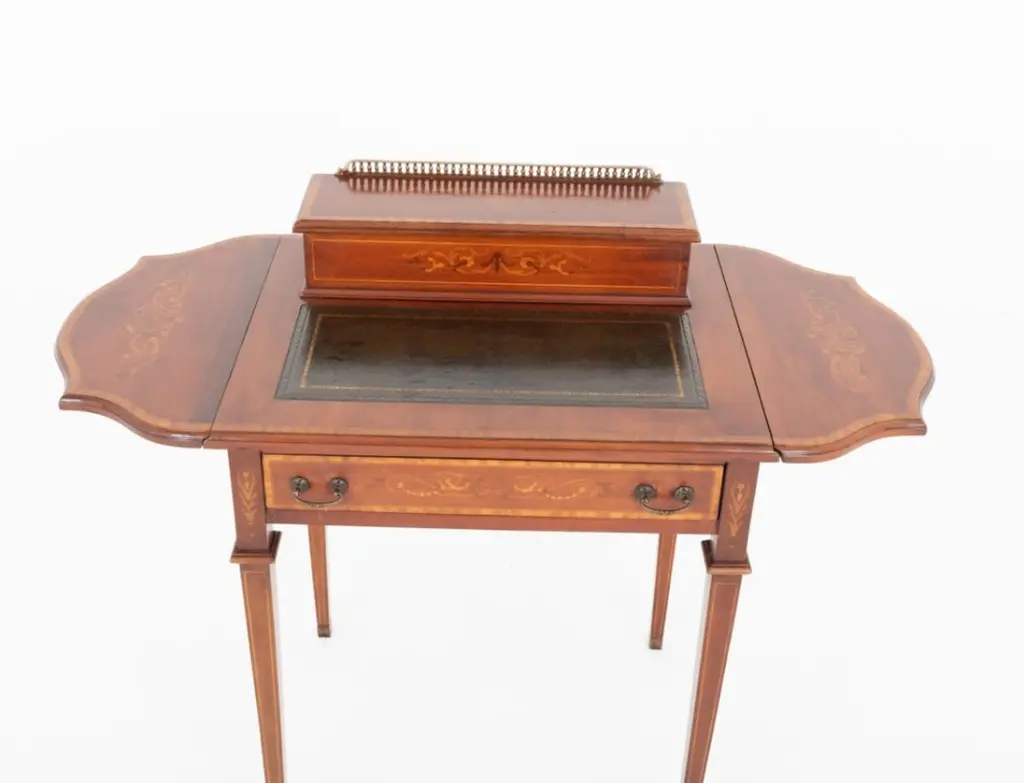 Pretty Sheraton revival mahogany ladies writing tableThis elegant writing table is raised upon tapered legsHaving 2 drop flaps, a leather writing surface and a stationary box to the topCirca 1920Will ship to anywhere in the world - including US - so please get in touch for a shipping quoteThe drawer retains its original decorative handlesThe writing table features marquetry inlays, satinwood crossbanding and boxwood line inlays, Size:Height 33'' (84cm)Working height 27 1/2'' (70cm)Width 42'' (107cm)Depth 19'' (48cm)