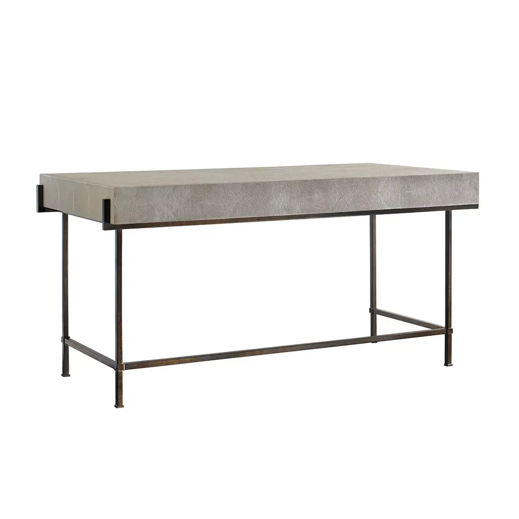 This box on stand design offers a stylishly contemporary flair combining the three drawer taupe shagreen top with the square iron base in a wonderfully textured bronze finish. Ships In 4-5 Weeks Three drawers Taupe Shagreen top Textured Bronze legs This image is for illustrative purposes only. The colors shown are accurate within the constraints of lighting, photography, and the color accuracy of your screen.Due to the nature of shagreen, the coloring may vary from one piece to another; these differences add to the natural beauty of the product. The color may also vary with time.