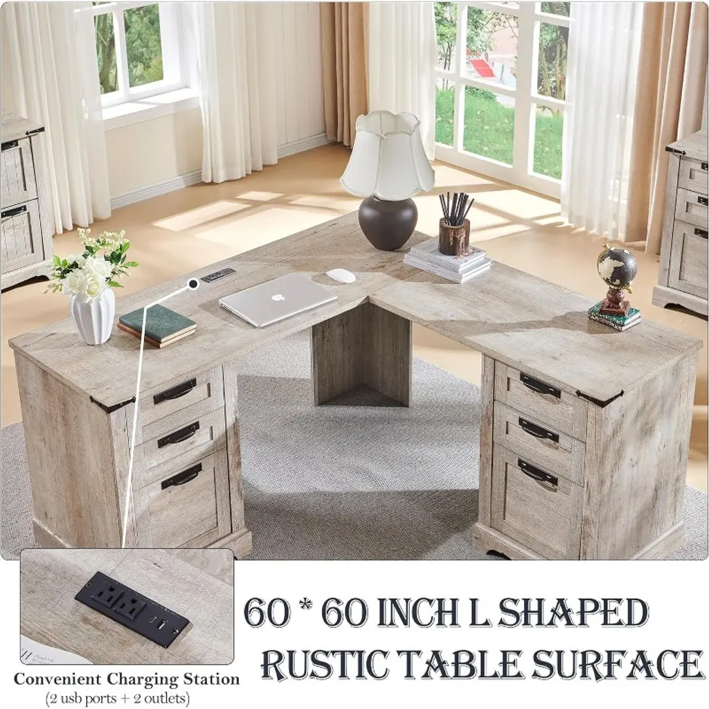 Vintage Farmhouse Aesthetic The 60" L shaped executive desk has a solid, atmospheric appearance with a classic double base structure, and the smooth linear borders of the drawer panels and hand-polished polished hardware give the furniture exquisite architectural details. The warm antique finish is soft and pleasant to the eye, and the natural color and texture changes make each product unique and inject a warm and rustic farmhouse style into the home and office space. 60" Large Countertop The spacious 60" x 60" desktop offers plenty of space for laptops, files, decorations and coffee mugs. With a built-in power outlet, electronic devices can be easily charged at any time, so that the daily needs of busy work are within reach. Three standard drawers can store common items such as sticky notes and calculators to keep your desk clean and organized, helping you focus and work efficiently. Smart Partition Storage Equipped with file drawer, easily classify and archive important documents, say goodbye to rummaging troubles; The locker with door can accommodate the vertical host (need to open the door for heat dissipation), and the built-in adjustable shelf supports personalized storage and adapts to different sizes of office supplies. From stationery to electronic equipment, full-scene storage solutions meet diverse office needs. Durable Material & Flexible Layout Design Built from high-density engineered wood (MDF/particleboard/plywood) with a solid wood texture and excellent load-bearing capacity, 150 LBS for desktops and 30/50 LBS for drawers.The delicate appearance of the four sides supports any space placement, whether it is corner layout or independent display, it can show elegant shapes from all angles, adding highlights to the room. Comfortable Office Experience The double base structure provides stable support, the farmhouse aesthetics do old finishes to create a warm atmosphere, and the large operation area is compatible with multi-screen equipment and creative work scenes. From file classification to device charging, from space utilization to visual aesthetics, every detail is designed to enhance office comfort, creating an ideal home office hub.