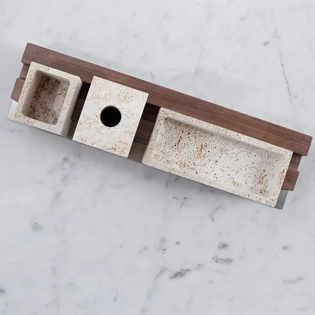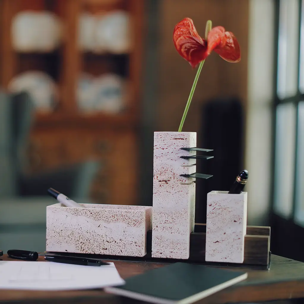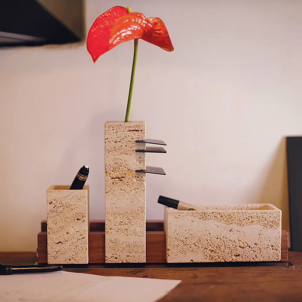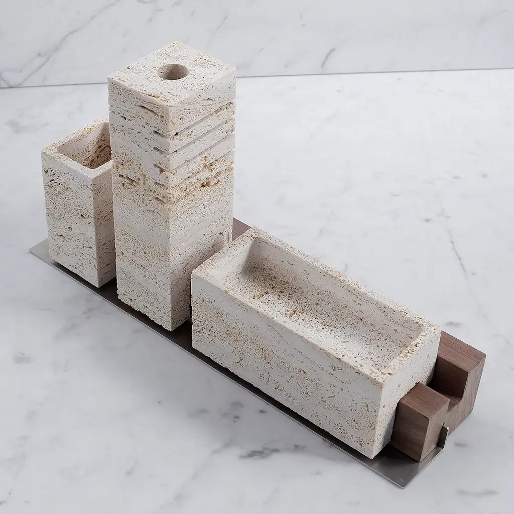 This exceptional desk set designed by Giuseppe Venuta features three interlocking and supporting pieces that trace the skyline of a modern metropolis. The travertine modules, which can be positioned as desired, can serve as containers for pens, pencils, and other desk accessories. Business cards can be inserted in the appropriate slots of the tallest element, seemingly forming terraces resembling a flower.