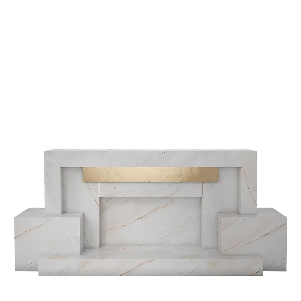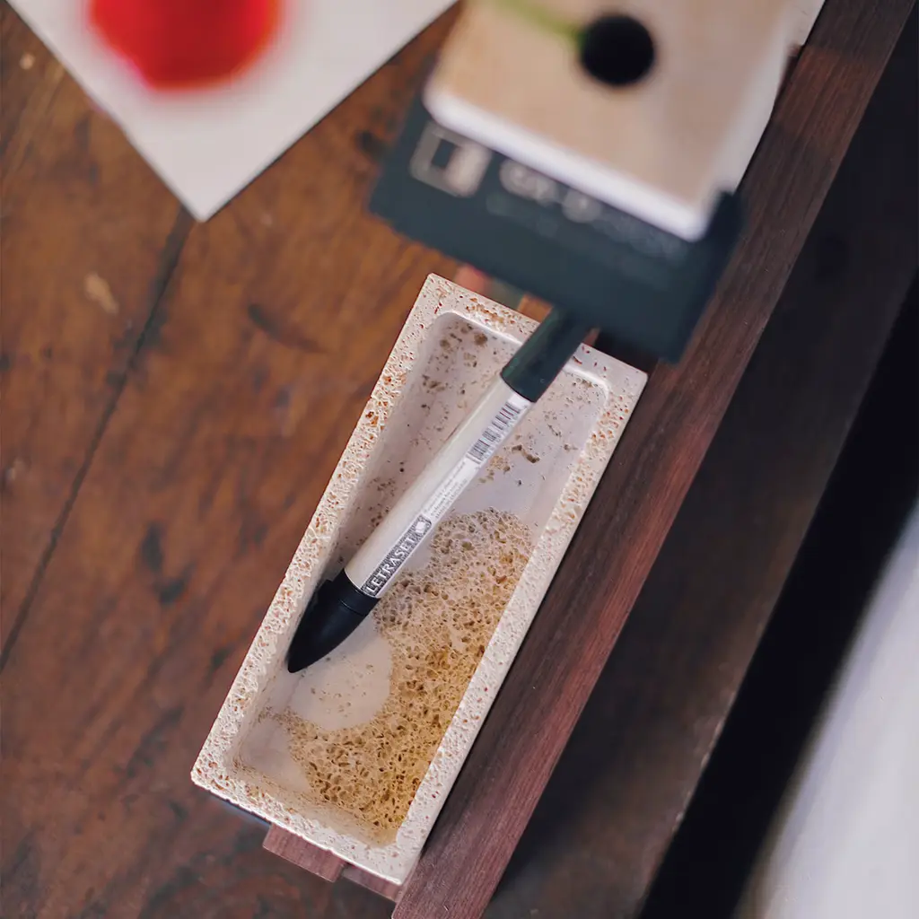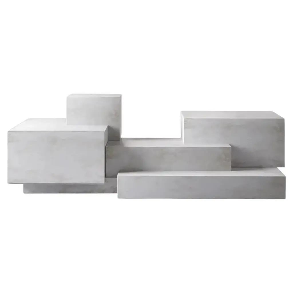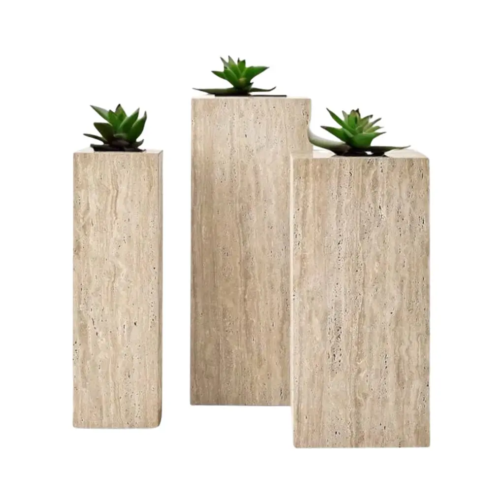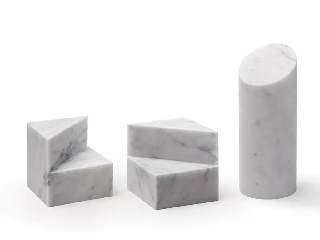 This exceptional desk set designed by Giuseppe Venuta features three interlocking and supporting pieces that trace the skyline of a modern metropolis. The travertine modules, which can be positioned as desired, can serve as containers for pens, pencils, and other desk accessories. Business cards can be inserted in the appropriate slots of the tallest element, seemingly forming terraces resembling a flower.