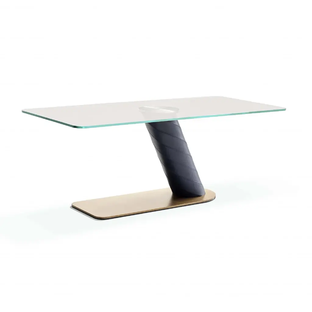 Rolling Desk is a rectangular office table featuring a central steel column, inclined and wrapped in spiral-processed full-grain leather with visible stitching. The base is made of steel available in various finishes. The top of the column is made of exposed stainless steel, and the tabletop is available in transparent or smoked tempered glass.