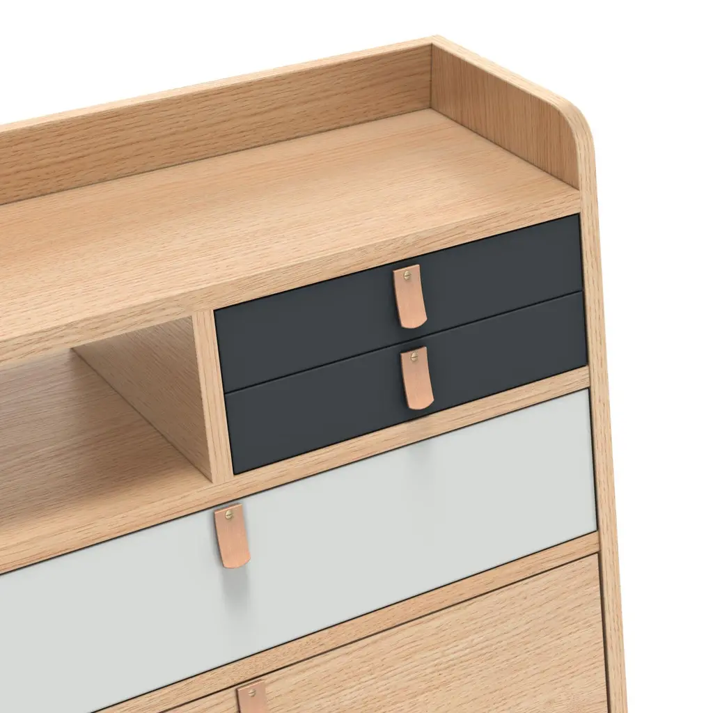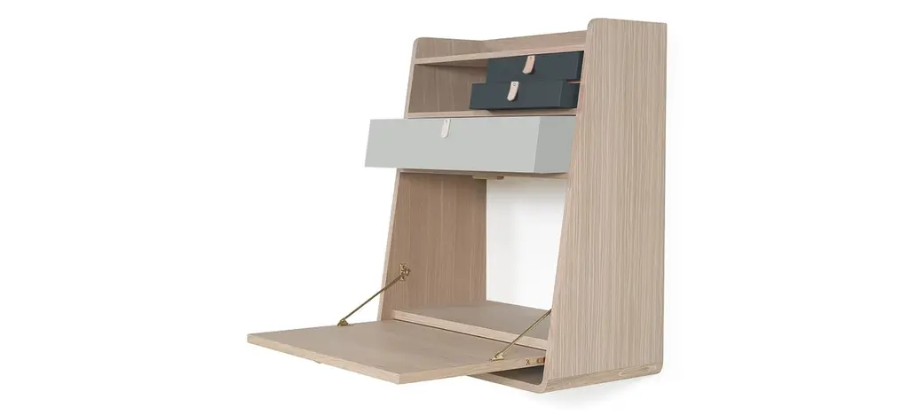 Slate Grey Drawers Gaston Floating Writing Desk 60 cm Natural Oak by HARTODimensions: W 60 x D 32 x H 72 cm. Materials: MDF wood veneer, Lacquered MDF, Leather.Weight: 22.0 kgGaston has everything a big boy needs and yet it takes up so little space! A wall-mounted secretary, to free up floor space while having everything at hand, and to hide what you don't want to show. 3 drawers, a spacious niche for a computer, leather handles for style: Gaston is perfect for creating an office corner in a living room or bedroom. Gaston is made in Portugal, in oak veneered MDF, lacquered MDF and leather handles. Gaston is a creation of Florence Watine.About: Hartô, a French furniture brand, was born in 2012 from the desire of its founders to offer a different design, less elitist, which combines the useful with the beautiful. A light, joyful design, as if to say "I'm fed up" (with boring furniture): this is the meaning of the word harto in Spanish. The first pieces of the collection, the desks offer a new vision on a market that was then quite sparse, and offer functional tips and a joyful, colorful design, out of step with the archetypes. The foundations of the Hartô spirit are laid: a free spirit, a design of the useful, curved shapes, colors. In a word: creativity! And of course, from the beginning, this translates into collaborations with talented designers. This spirit crosses the years and the collections, evolves, refines itself, without ever denying itself. Today, audacity and creativity are still there, and are translated in a subtle way, all in elegance. At Hartô, the freedom to create is also based on strong commitments to quality and durability: the furniture is made by the best local craftsmen, who use noble materials to give life to pieces that will last through the ages.