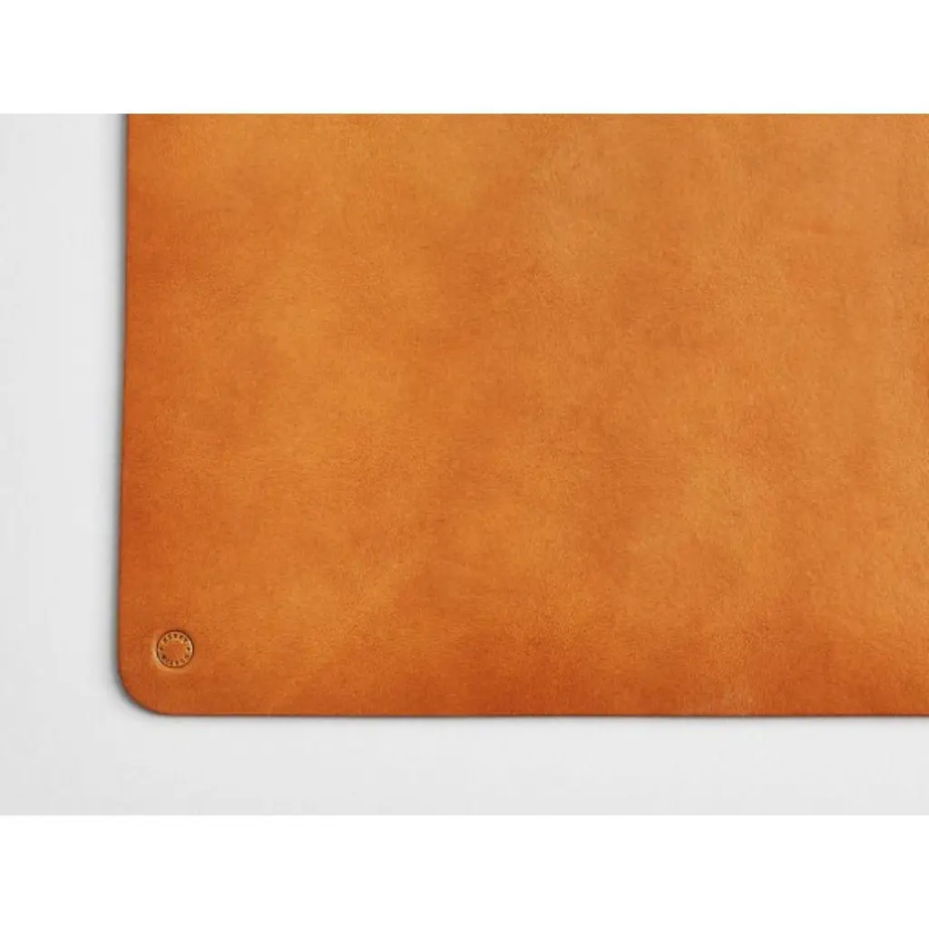 Small Tan Leather Desk Mat by Henry WilsonDimensions: W 32 x D 22 x H 0.4 cmMaterials: LeatherOur leather desk mats are made of vegetable tanned saddle leather imported from Italy. This type of leather is thick and durable, and its ‘half-dressed’ state develops a new character and patina over time.In a search to find the most minimal way to introduce this ‘living’ material into daily life, the desk mat is a warm, inviting element that very simply elevates the experience of sitting at a desk.Leather marks easily and needs to be treated carefully but once it’s in place, it can take lifetimes of use. Try to keep it from dust and use it. If you have to store it, keep it flat in an acid proof envelope.Henry Wilson's work combines a rational, democratic utility with an element of sculptural expression. There is a clear form and function in our products, but it’s important they also have feeling. We are interested in the awkward beauty that comes from something made by hand. We like to explore how imperfection can be introduced into an industrial process, to make something at scale that retains a sense of individual charm.