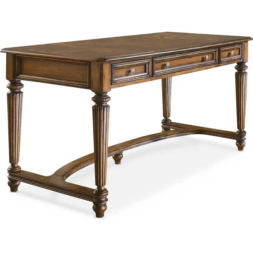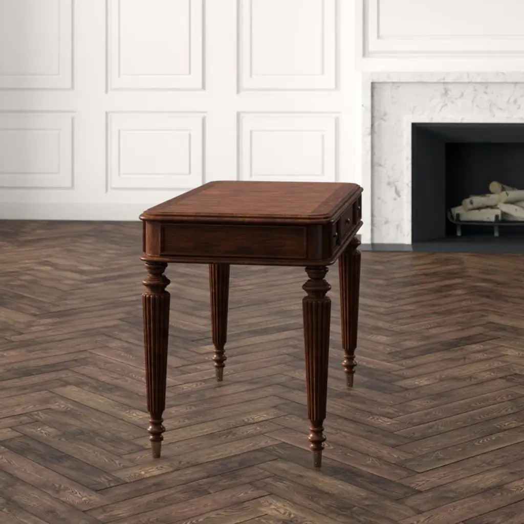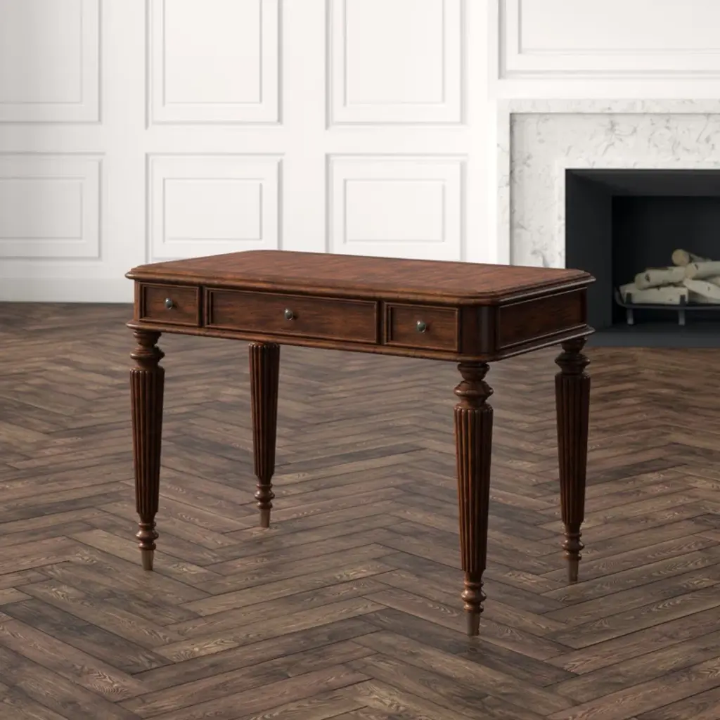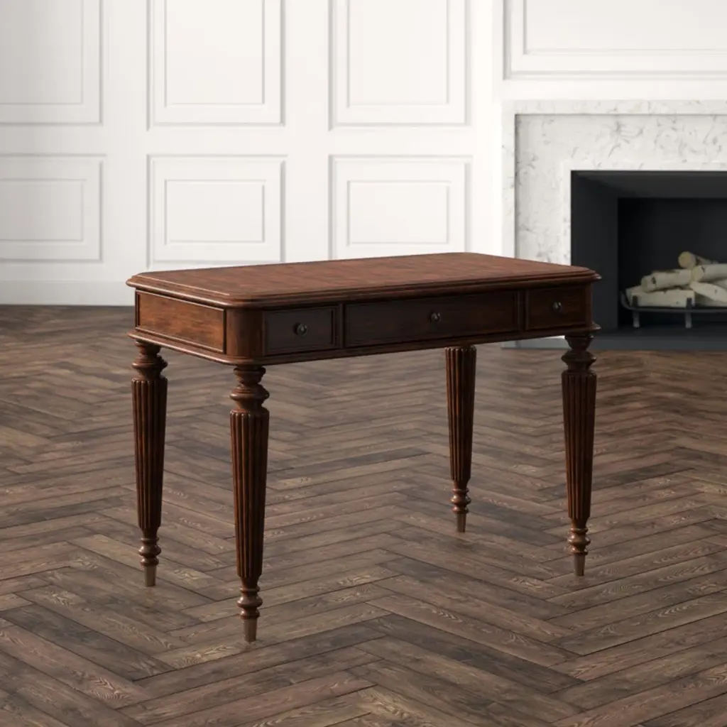 This traditional writing desk combines functionality and classic design, perfect for any home office. Made from solid wood with a dark wood finish, it features a dark brown base and a rectangular shape. The desk includes three drawers with metal glides and a keyboard tray, offering plenty of storage options. Whether used for work, study or as a versatile table in your living space, this desk blends seamlessly with any decor. The finished back adds to its polished look, making it a standout piece that looks just as good up against a wall as it does in the center of the room.