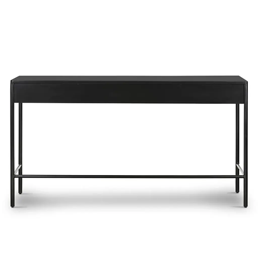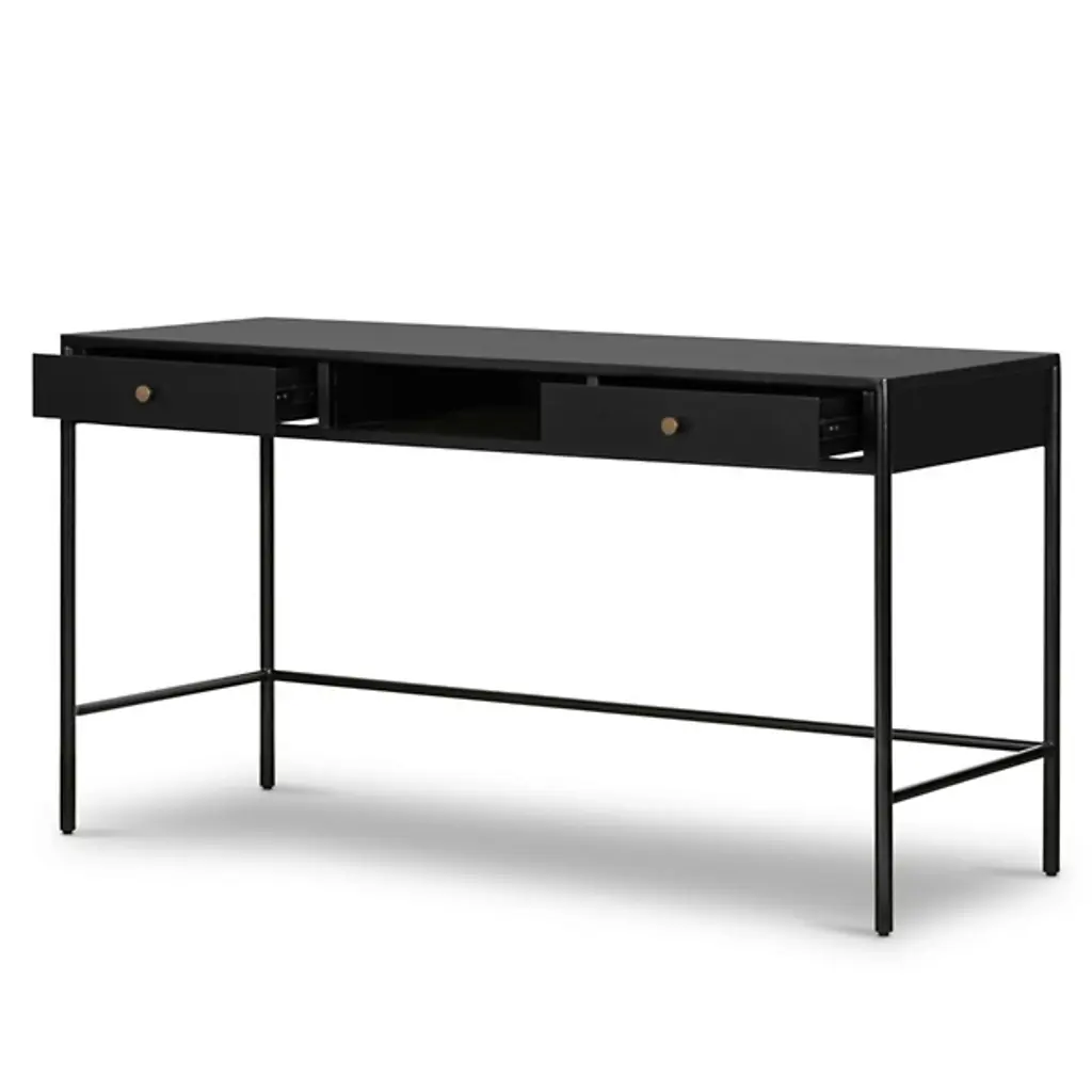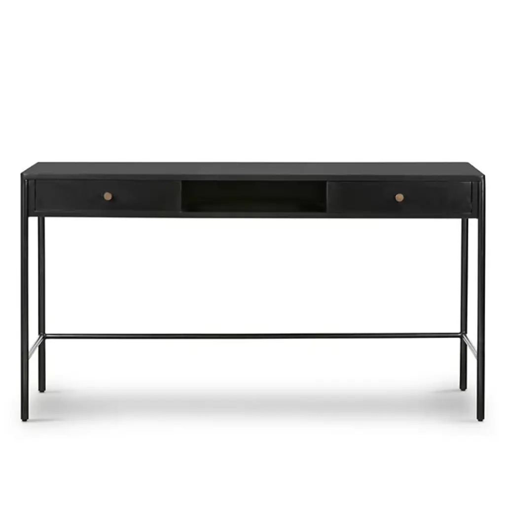 The Soto Desk from Four Hands seamlessly blends industrial edge with modern elegance. Crafted from black-finished iron and accented by bronze-finished hardware, this slim and streamlined desk offers dual drawers for convenient storage. Its clean lines and transitional style make it a versatile addition to any workspace. Made in Vietnam, the desk adds a touch of vintage refinement and authority equally suited to a home or corner office.