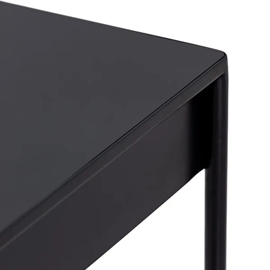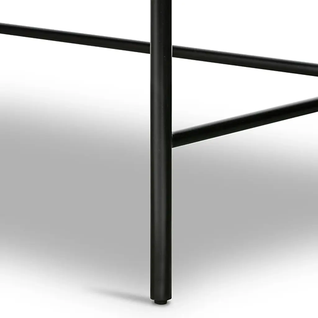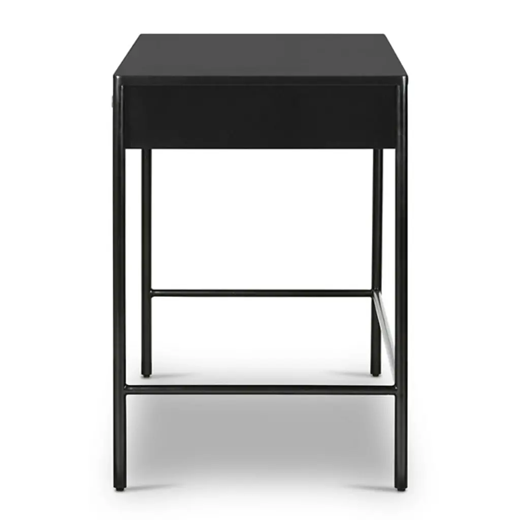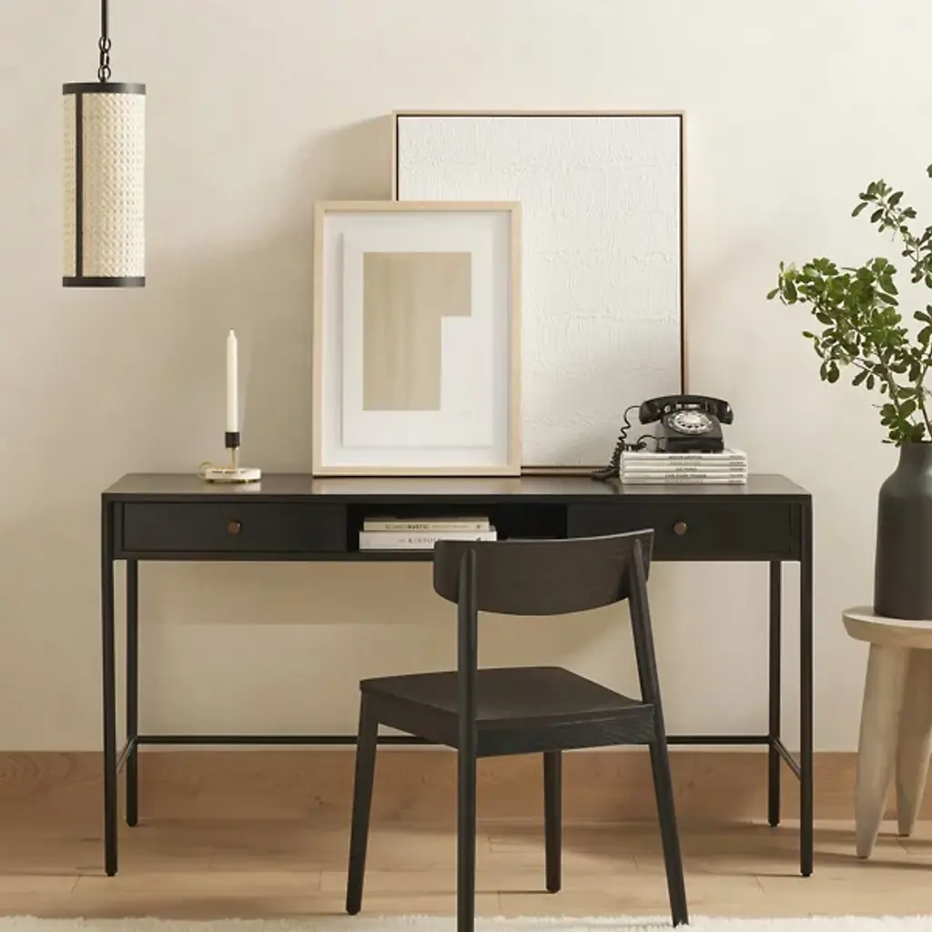 The Soto Desk from Four Hands seamlessly blends industrial edge with modern elegance. Crafted from black-finished iron and accented by bronze-finished hardware, this slim and streamlined desk offers dual drawers for convenient storage. Its clean lines and transitional style make it a versatile addition to any workspace. Made in Vietnam, the desk adds a touch of vintage refinement and authority equally suited to a home or corner office.