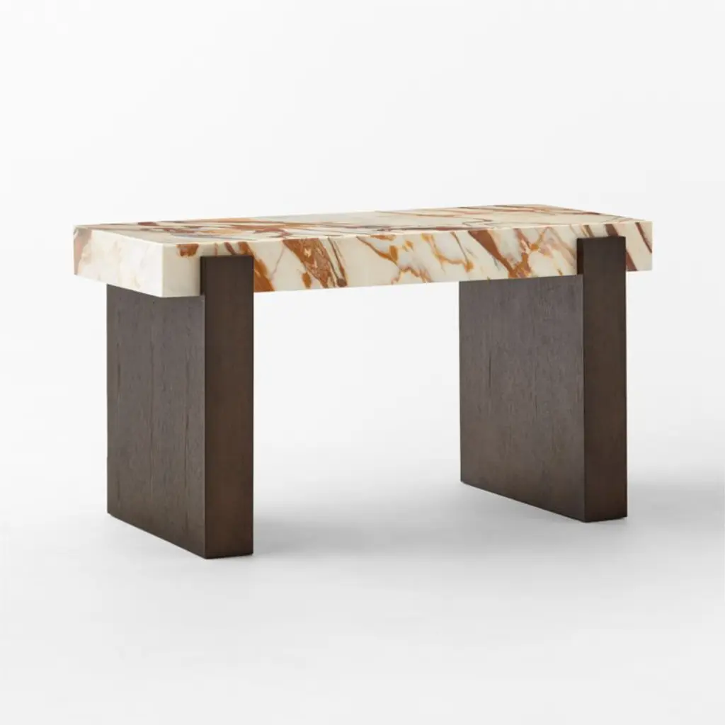 Boldly proportioned desk from Melbourne-based VUUE is distinguished by its striking mix of honed ivory marble and black walnut veneer. Complemented by oversized block legs and two marble-fronted drawers, the desk elegantly balances the dramatic streaks of bronze, gold and grey veining in the marble with the simplicity of the silhouette. CB2 exclusive.