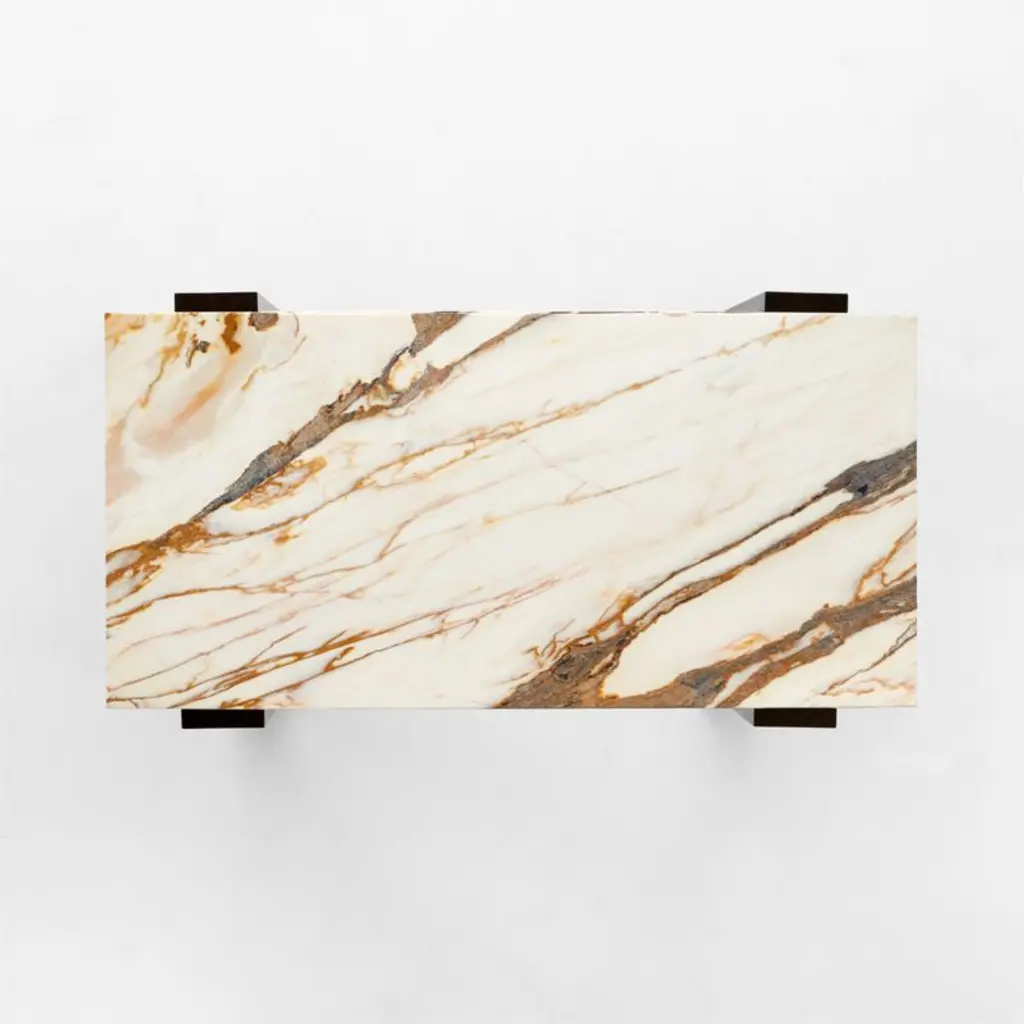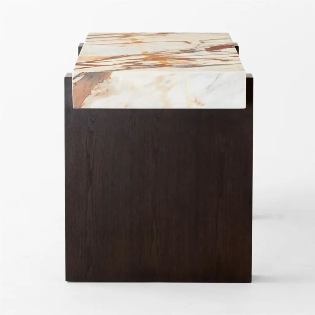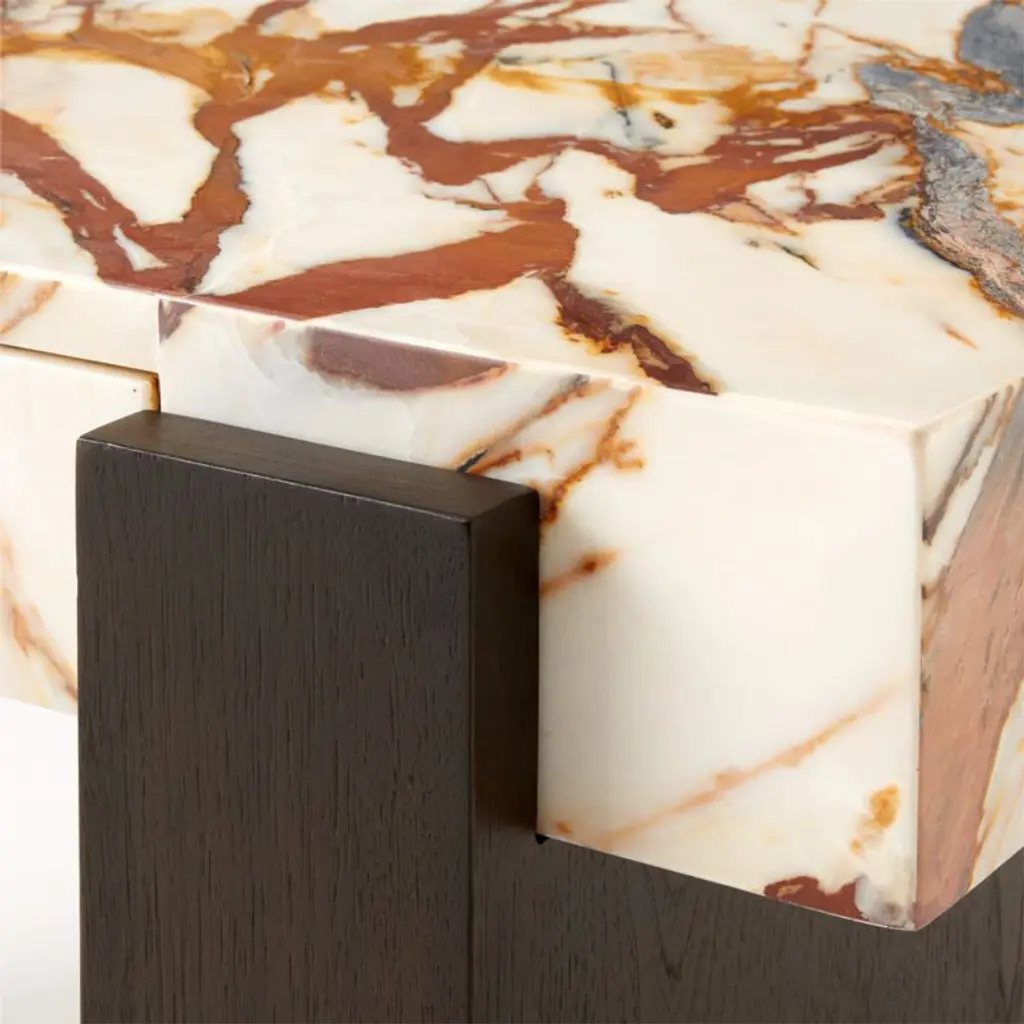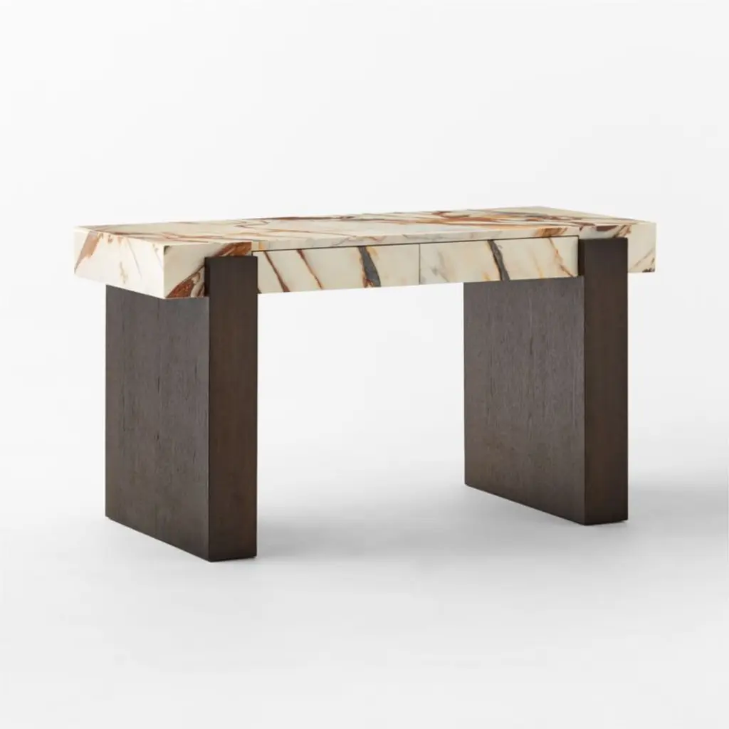 Boldly proportioned desk from Melbourne-based VUUE is distinguished by its striking mix of honed ivory marble and black walnut veneer. Complemented by oversized block legs and two marble-fronted drawers, the desk elegantly balances the dramatic streaks of bronze, gold and grey veining in the marble with the simplicity of the silhouette. CB2 exclusive.