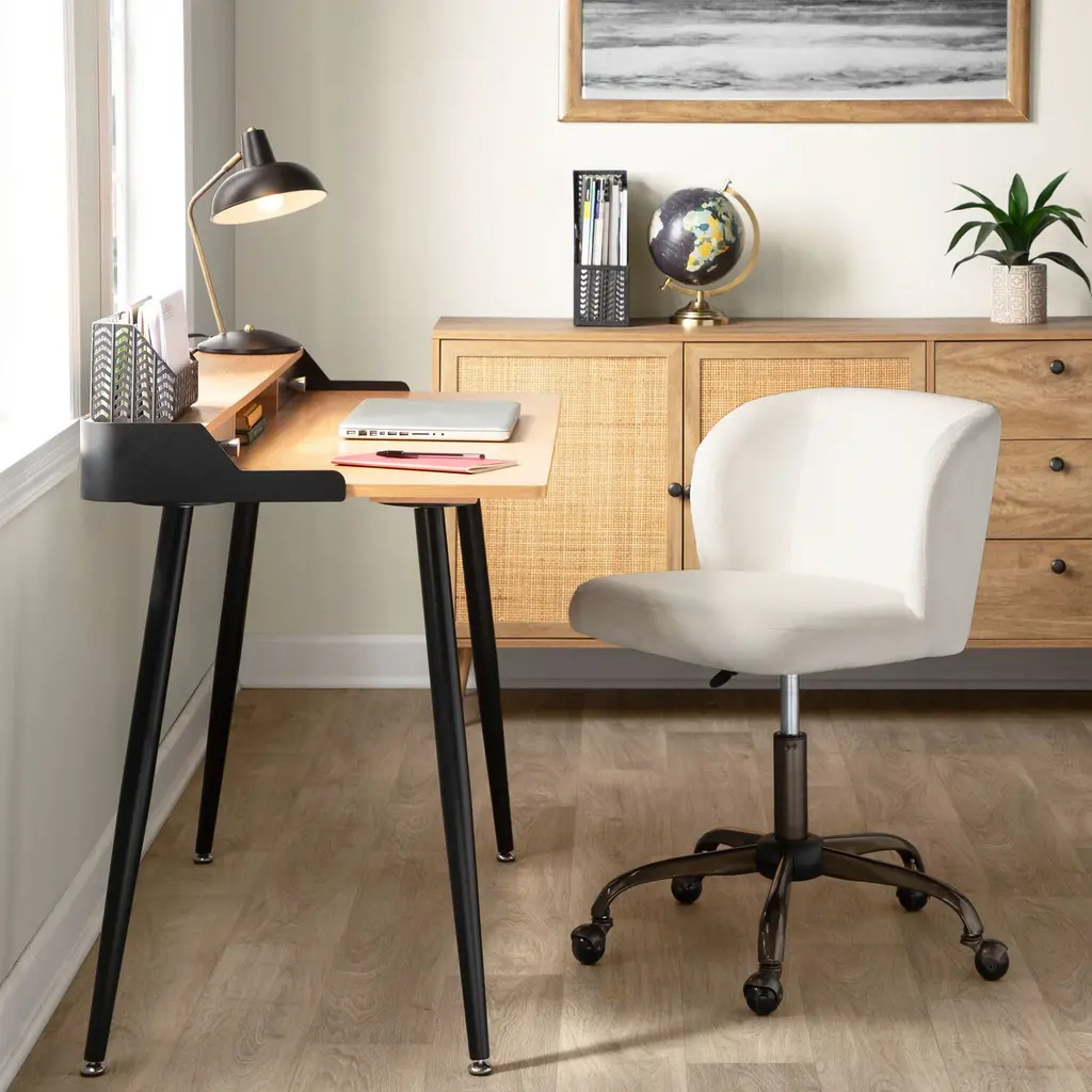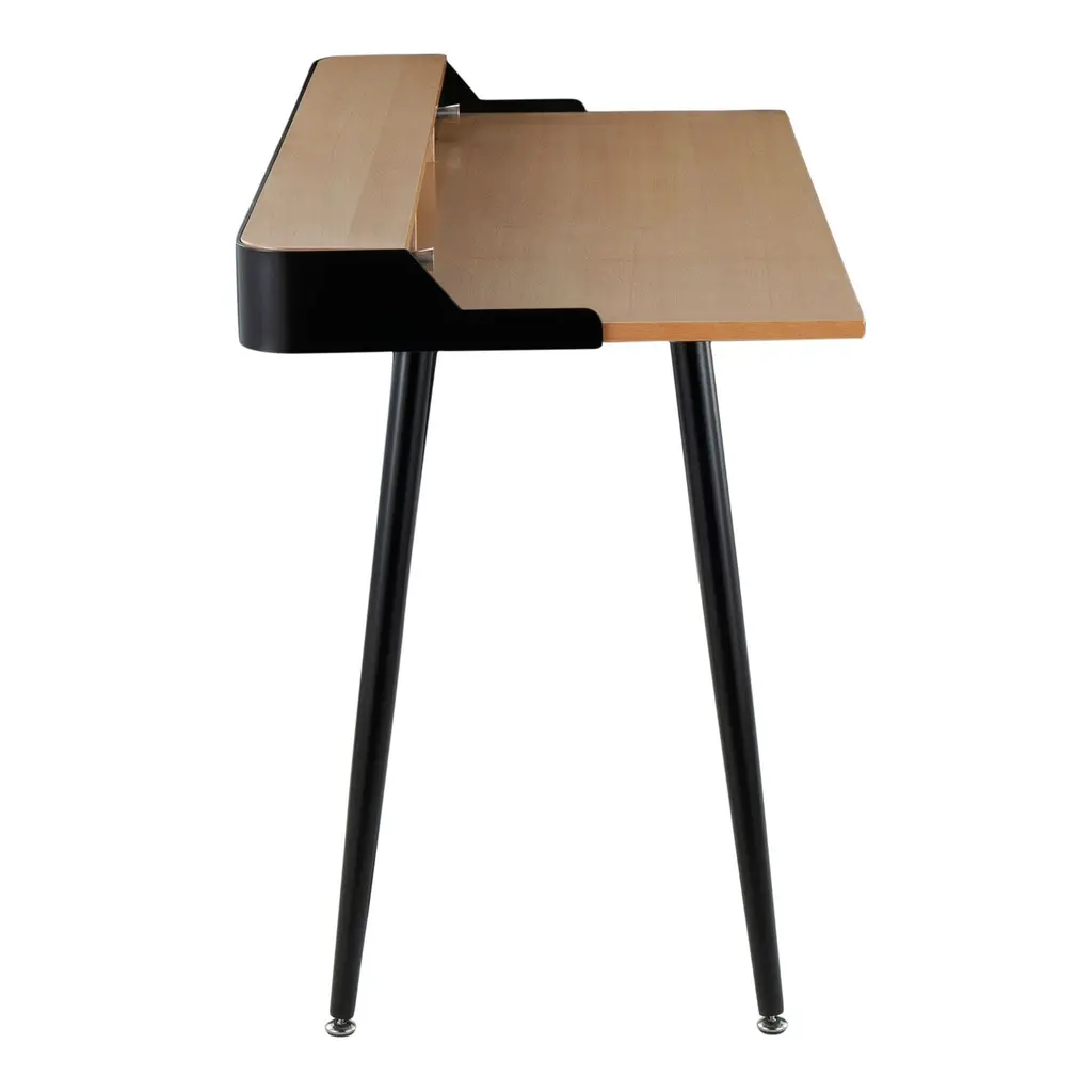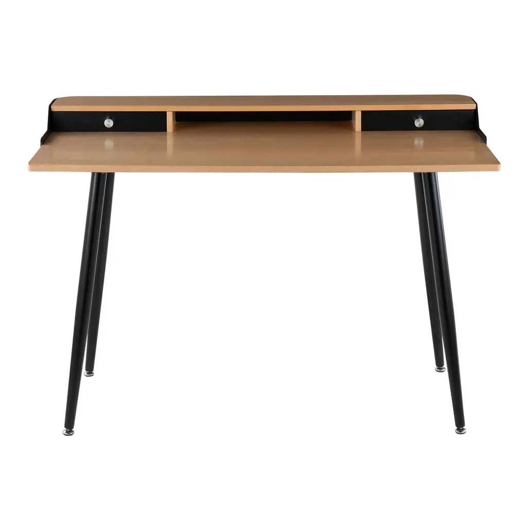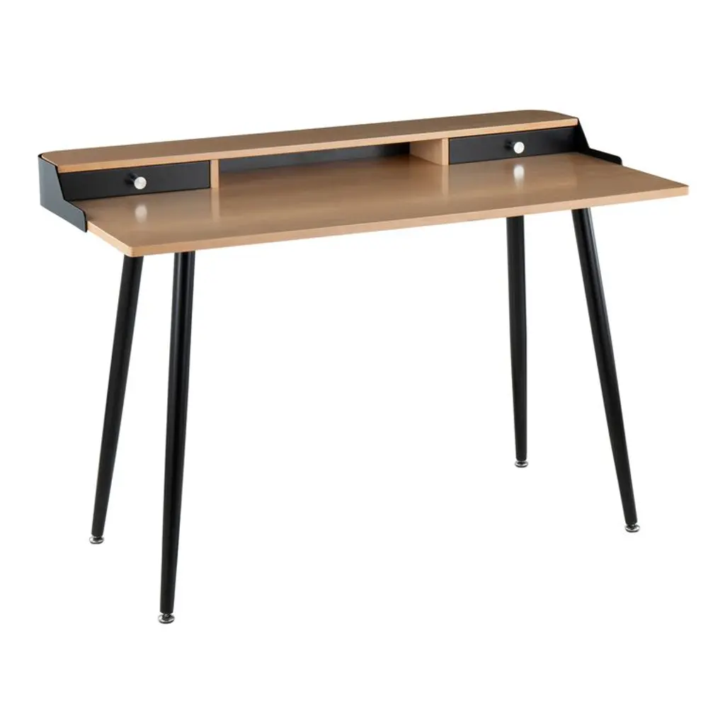 Fusing modern sophistication with mid-century charm, the sleek Stanton desk features a wood tabletop, two drawers, an open compartment and tapered metal legs. Bringing streamlined storage and space-saving style to the home office, it's available in natural wood and classic black or white wood and glam gold.