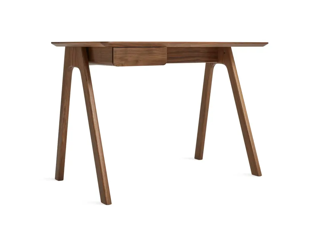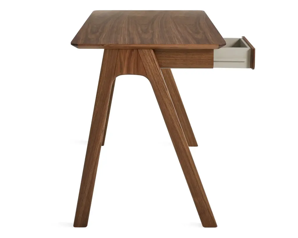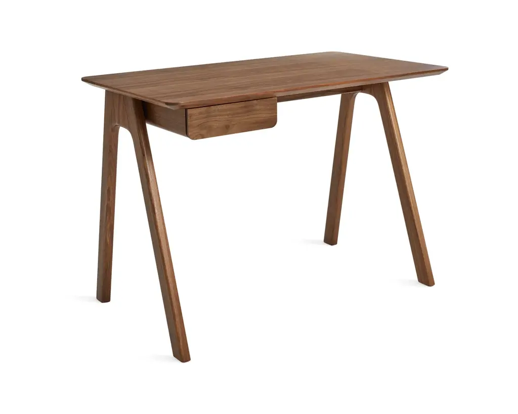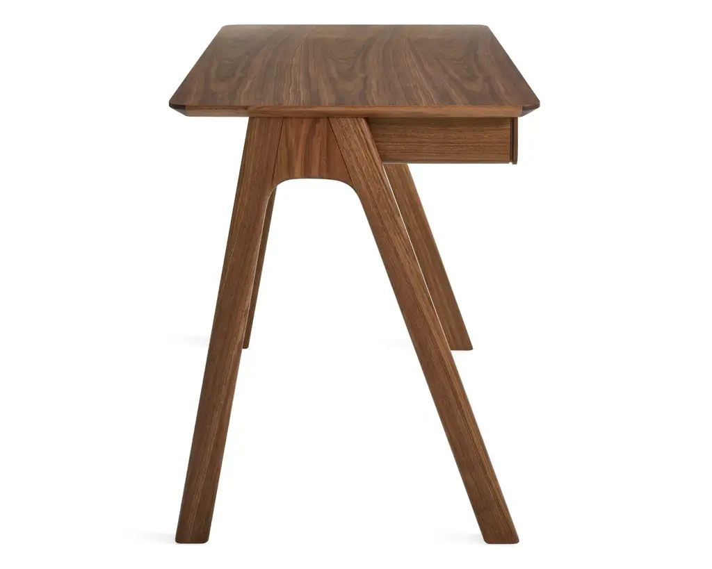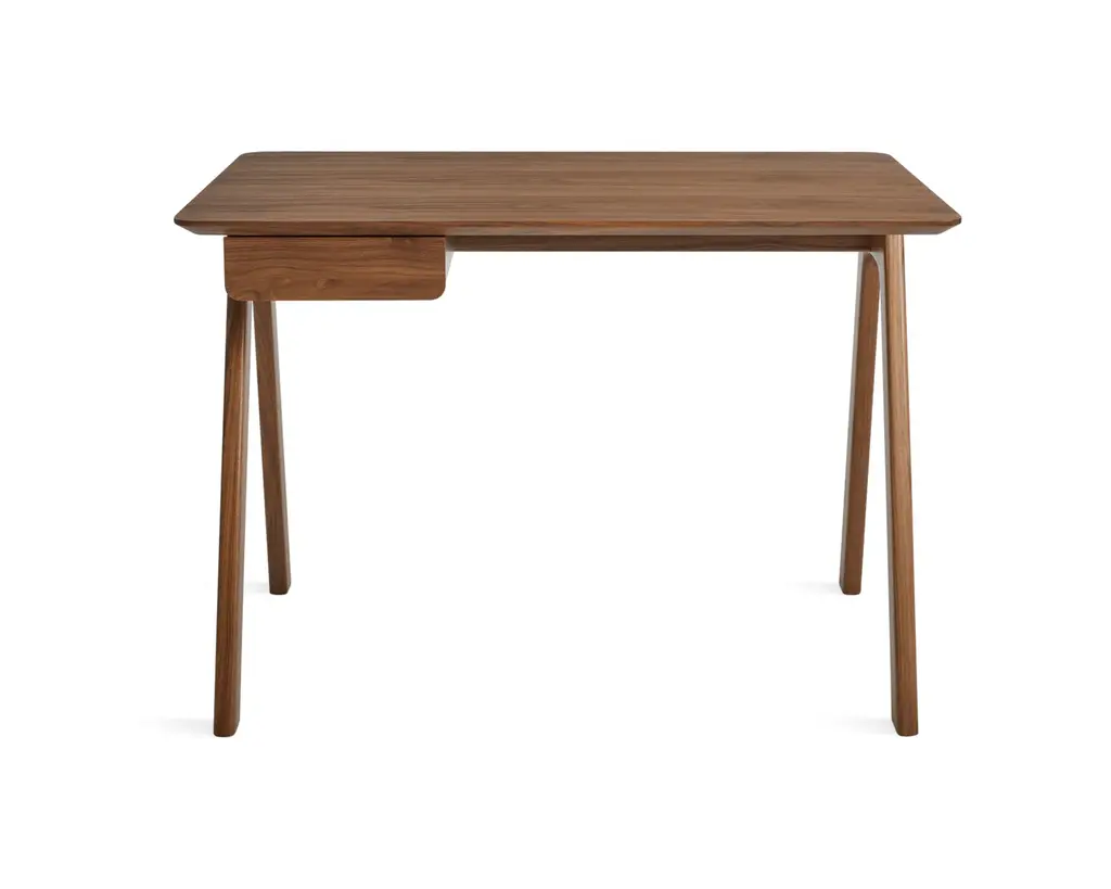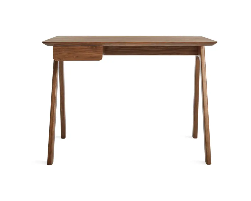 Radius edges and wood couple in this elemental desk. Pencil drawer keeps it tidy and can be assembled to either the left or right side.