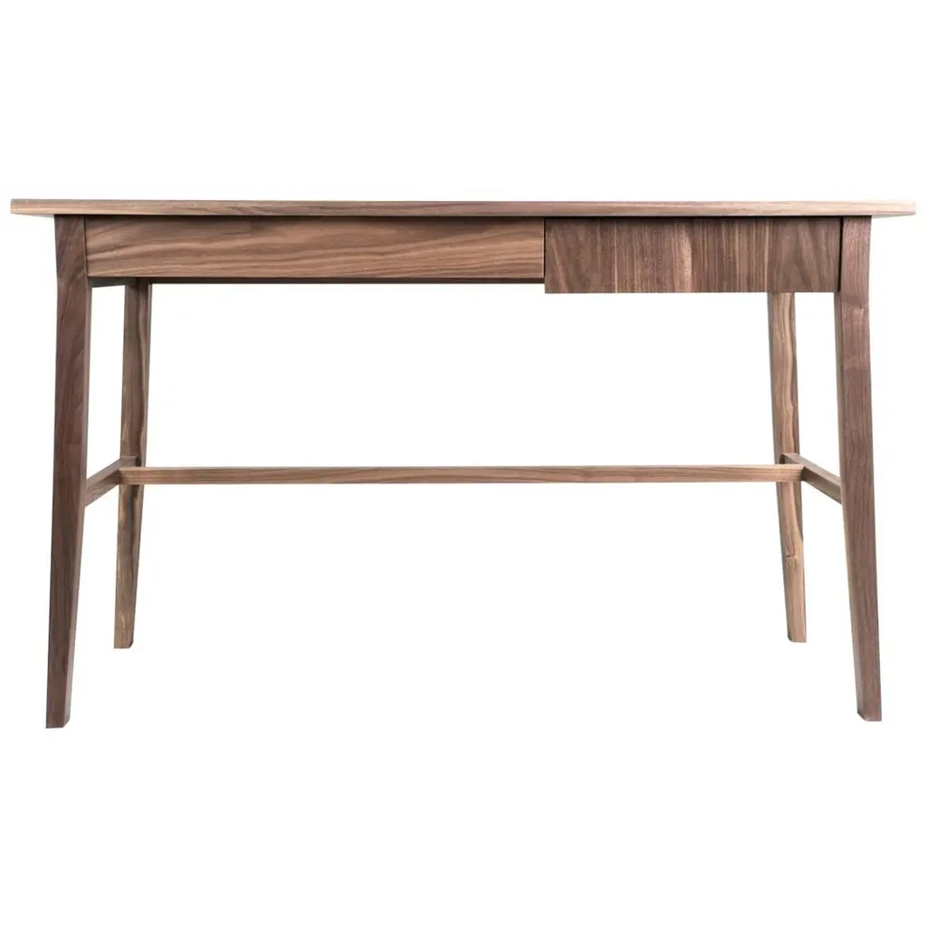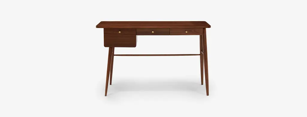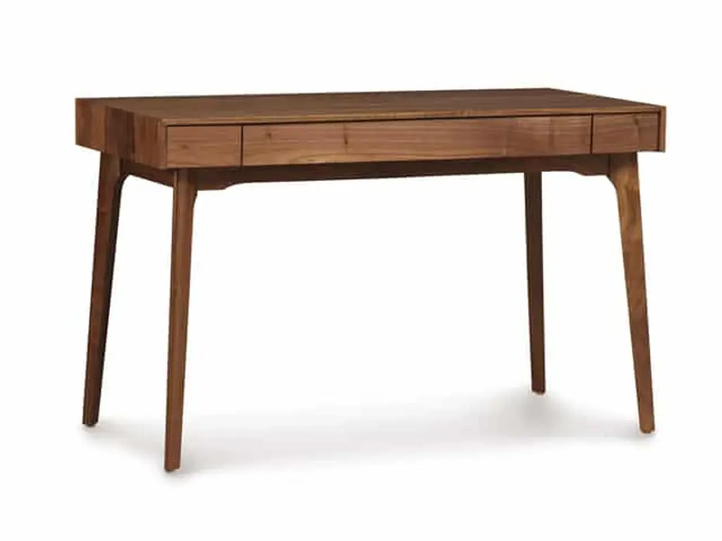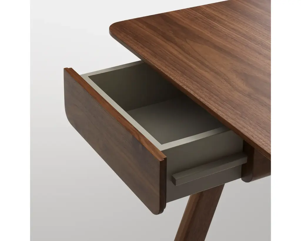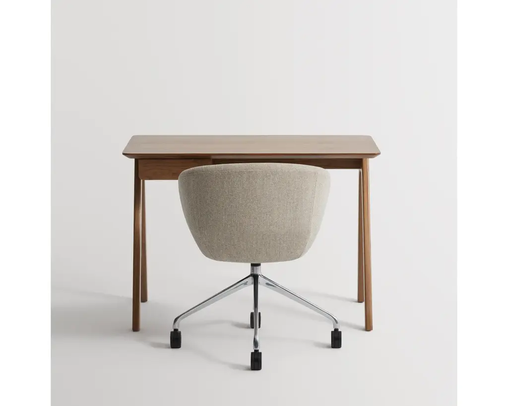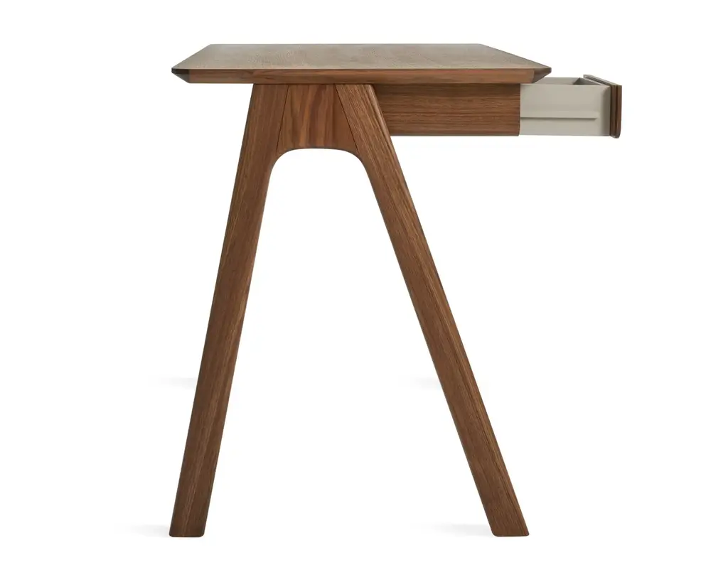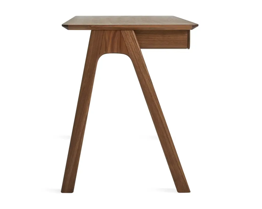 Radius edges and wood couple in this elemental desk. Pencil drawer keeps it tidy and can be assembled to either the left or right side.
