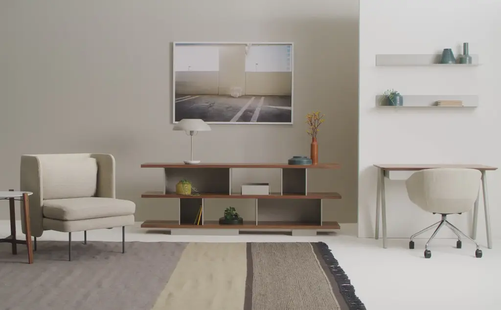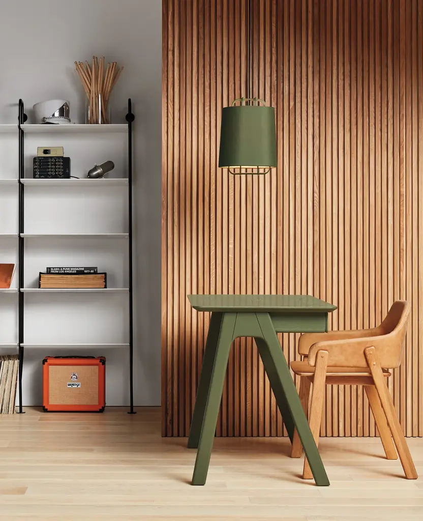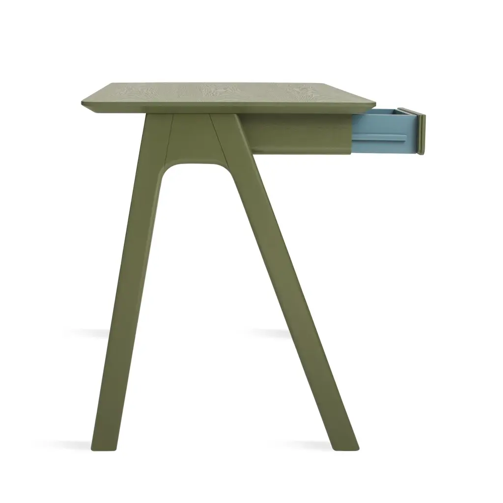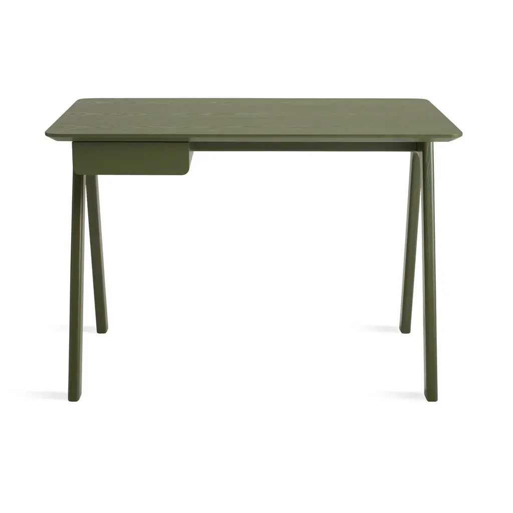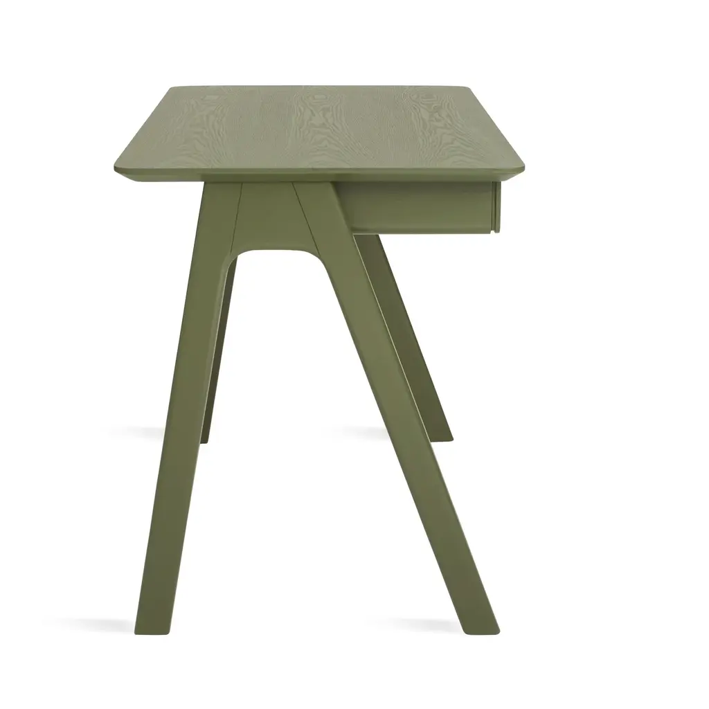 Radius edges and wood couple in this elemental desk. Pencil drawer keeps it tidy and can be assembled to either the left or right side.