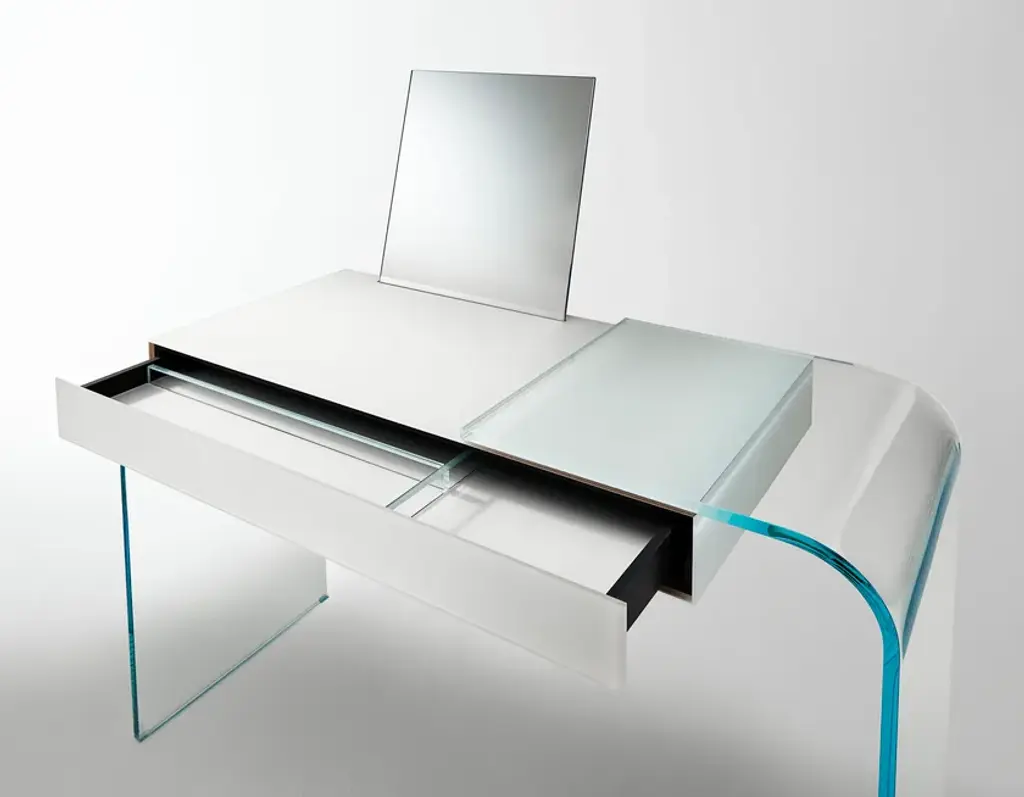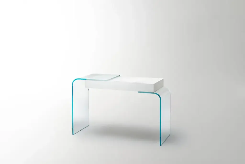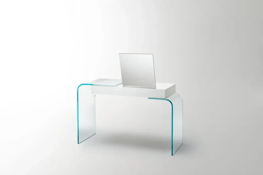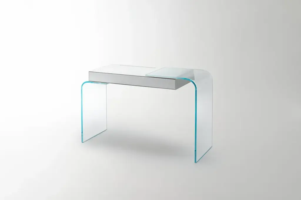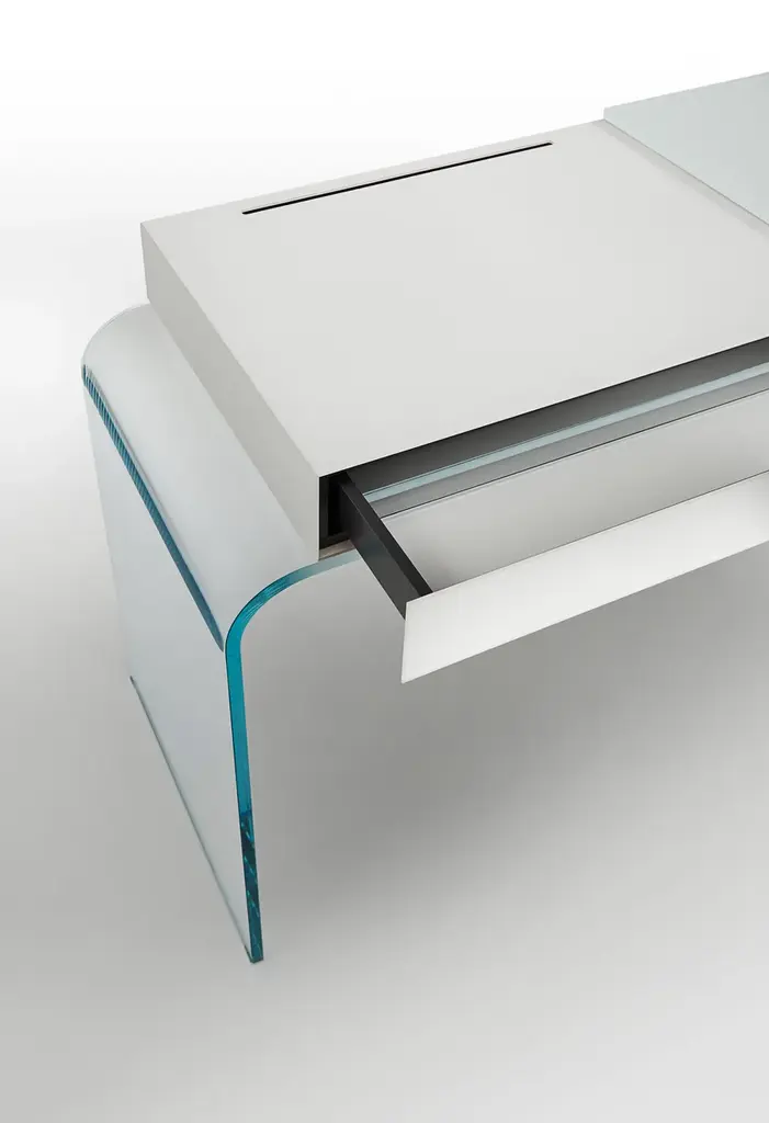Strata is a writing desk in extra light 15mm thick glass with curved glass legs supporting a top with a touch latch (push-pull) drawer, completely covered in tempered glass, lacquered matt or glossy, glued 45°. The bottom of the drawer is in the same glass finish as the desk. On the top of the desk there is a special casing milled to house cables with the possibility of slotting in a double-faced mirror to transform the desk into a modern make-up desk