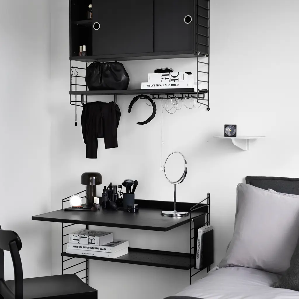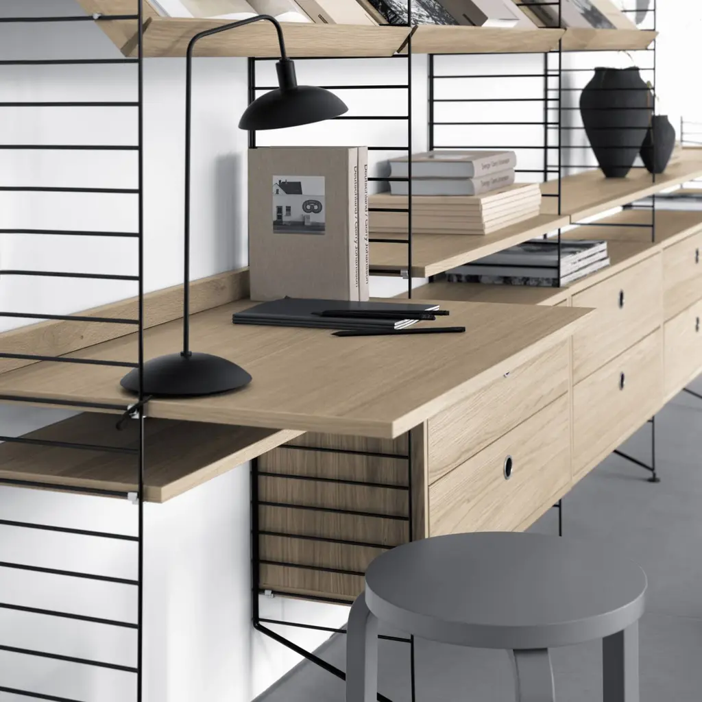 String includes a work desk option in a choice of veneer finish or lacquered MDF. Compatible with the larger 30 cm deep, ladder-like side panels, it can be installed at any desired height. With options like this, Swedish architect Nils Strinning's original 1949 shelf system retains a timeless and efficient standard of versatility.