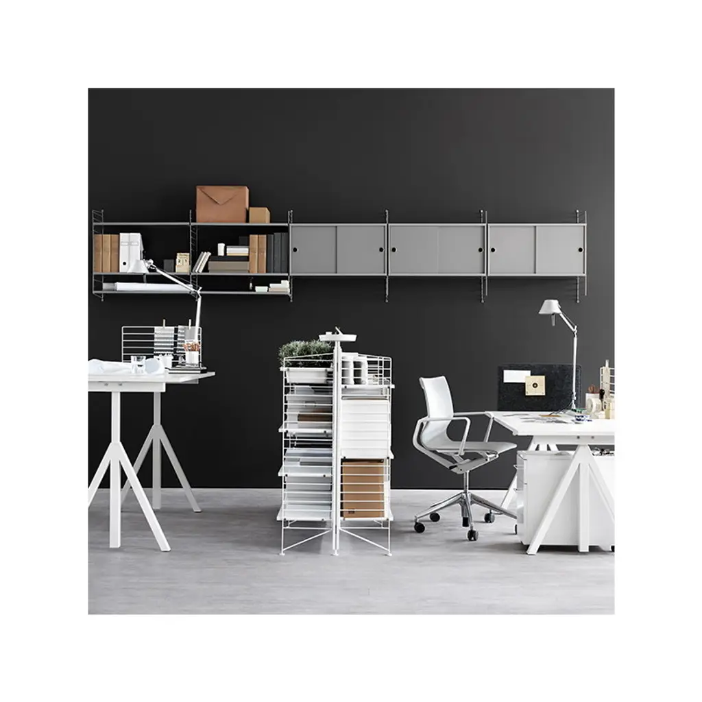 Electronically height adjustable table offers comfort and ergonomics to your workstation by enabling standing up while working. The table has a cable tray where all the wires can be neatly stored. Architect Anna von Schewen and designer Björn Dahlström designed a completely new series of products using the String System as a base. The new series, named String Works, offers flexible and adaptable solutions for modern work environments. The furniture in the String Works series is equally suited for use in the office or at home.