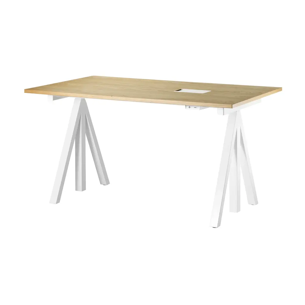If sitting is the new smoking, where do we stand? The height-adjustable desk from Swedish design house String mixes it up during the course of a shift, and all at the touch of a button. Unlike many other desks in this category, String's maintains the signature visually light profile of the rest of this modular line, in this case due to the slim metal tubes that make up the framework. An adjustment range between 715 and 1185mm means the desk height fits a wide range of standing adults. Ample space under the desk, plus the option of cable routing and a small table-top compartment for passing device cables. Ample space under the desk, plus a plethora of attachments and accessories to optimize a clutter-free, yet functional zone, makes this one elegant work horse for office for home use. What's more, the desk comes in 3 sizes, the larger version lending itself to more of a collective or conference application. As the longest-running resource for this Swedish heritage brand in North America, A+R offers the entire String collection. (And p.s., recent studies indicate that it's not so much sitting but a lack of physical exercise that contributes to health issues. So split the time you sit and stand at your desk—and don't skip those all-critical brisk walks at break time!).