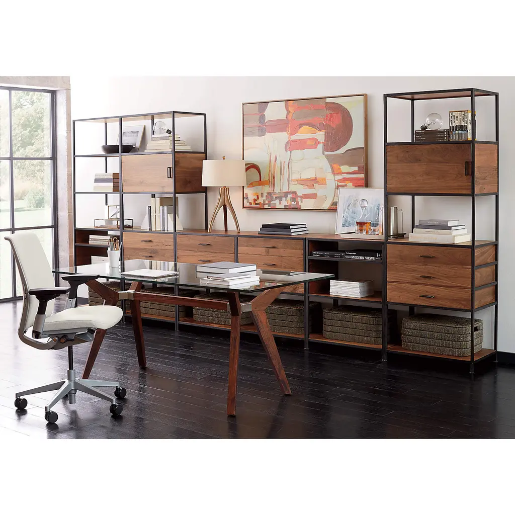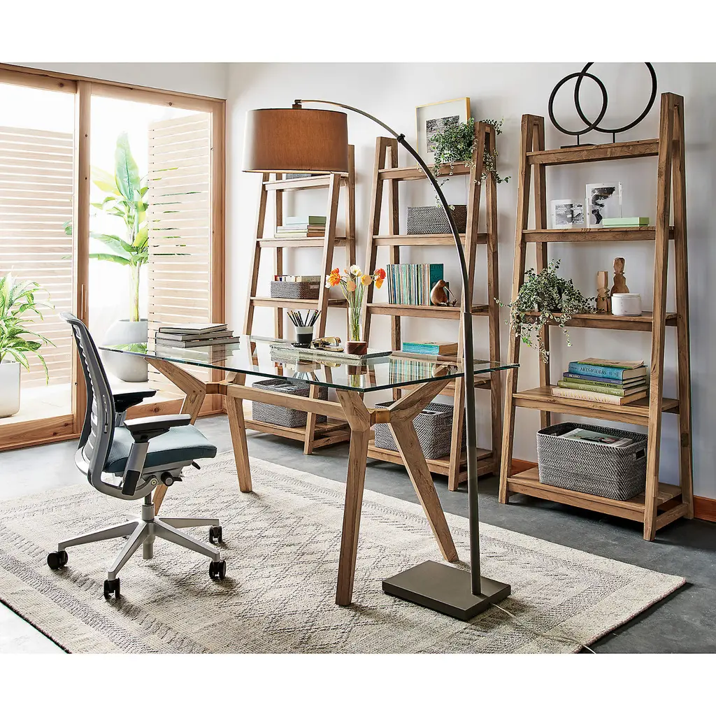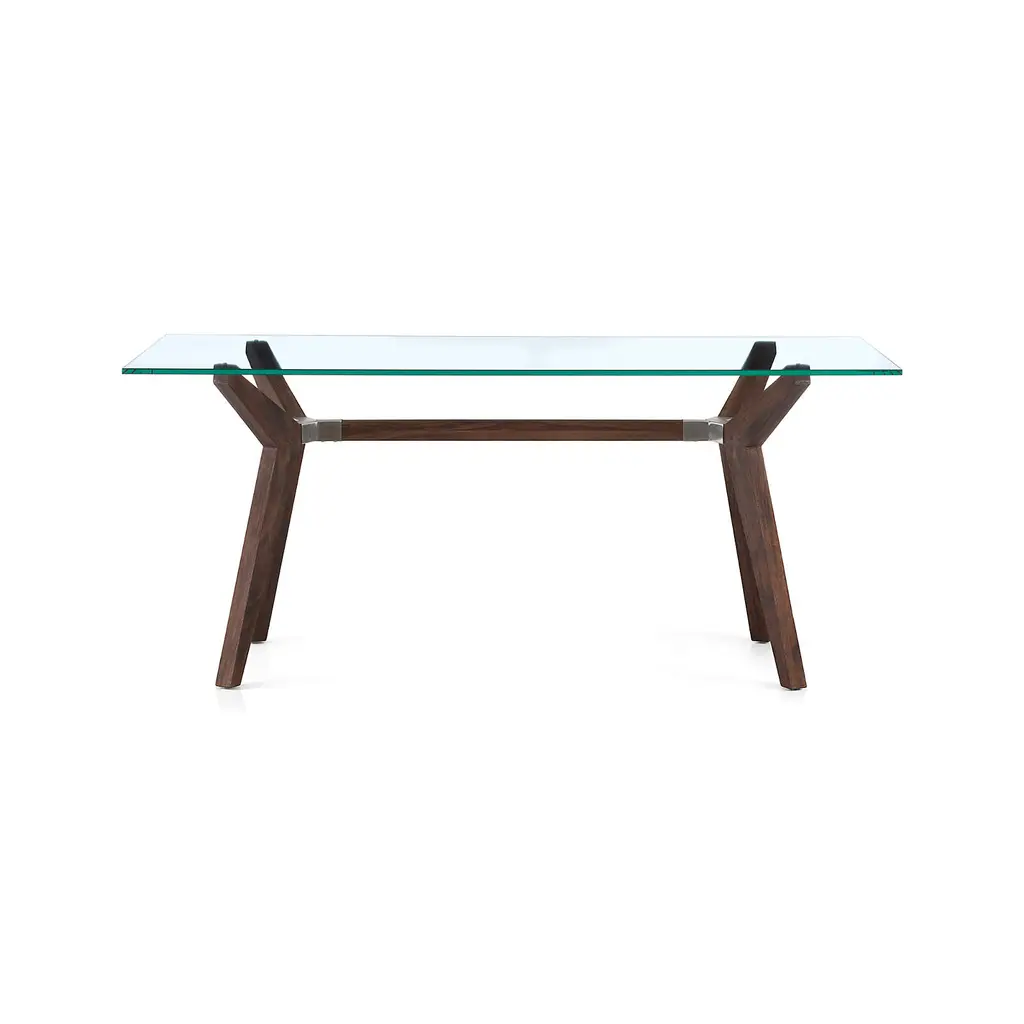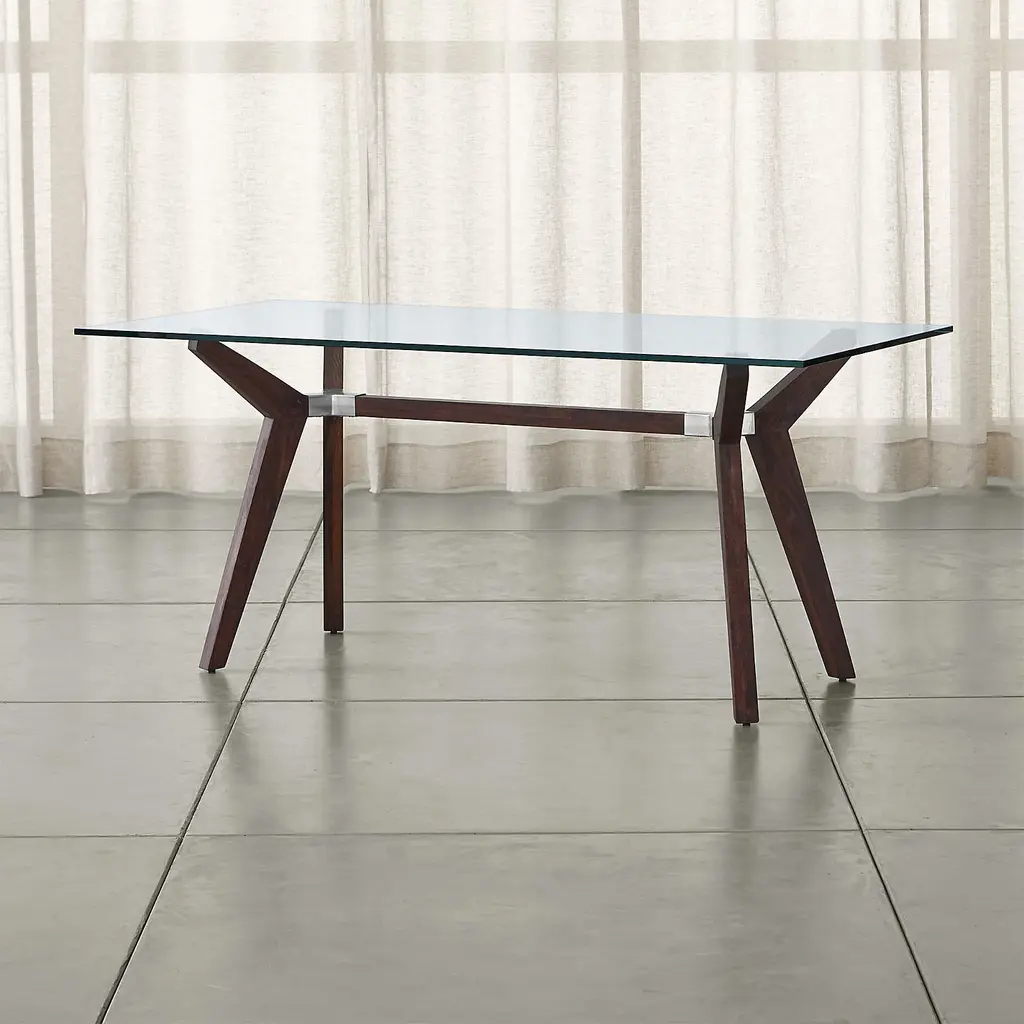 The statement-making Strut table offers clean, modern lines for the home office or dining room. A substantial glass top floats on dramatically-angled hardwood legs with a warm matte bourbon brown stain.