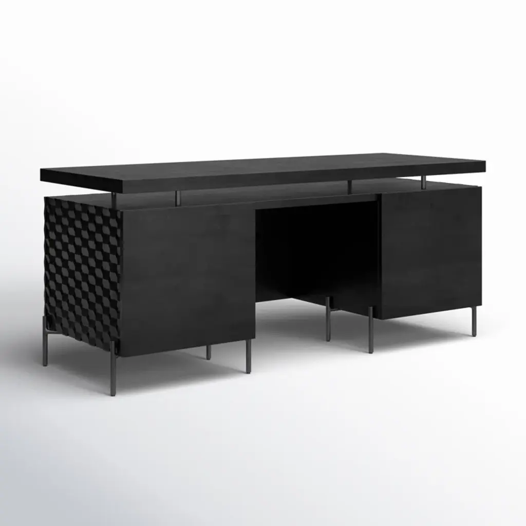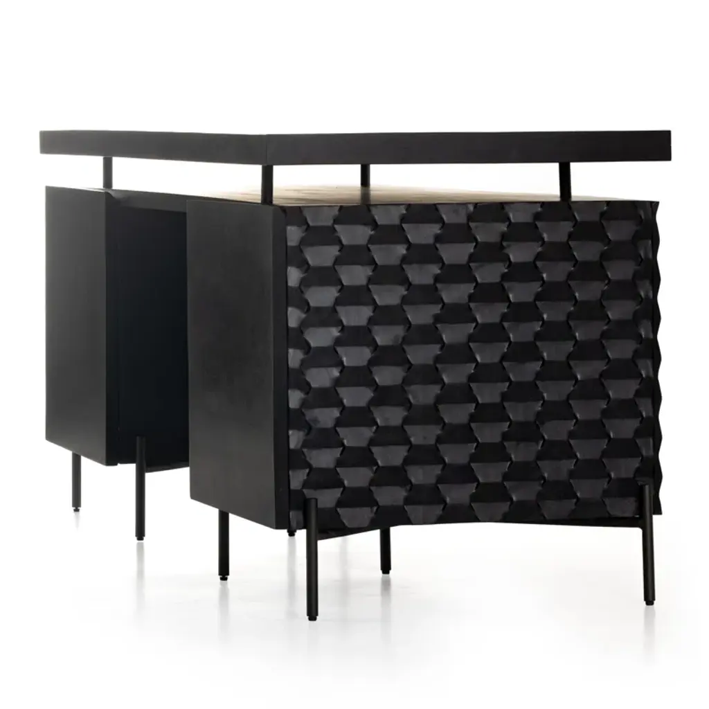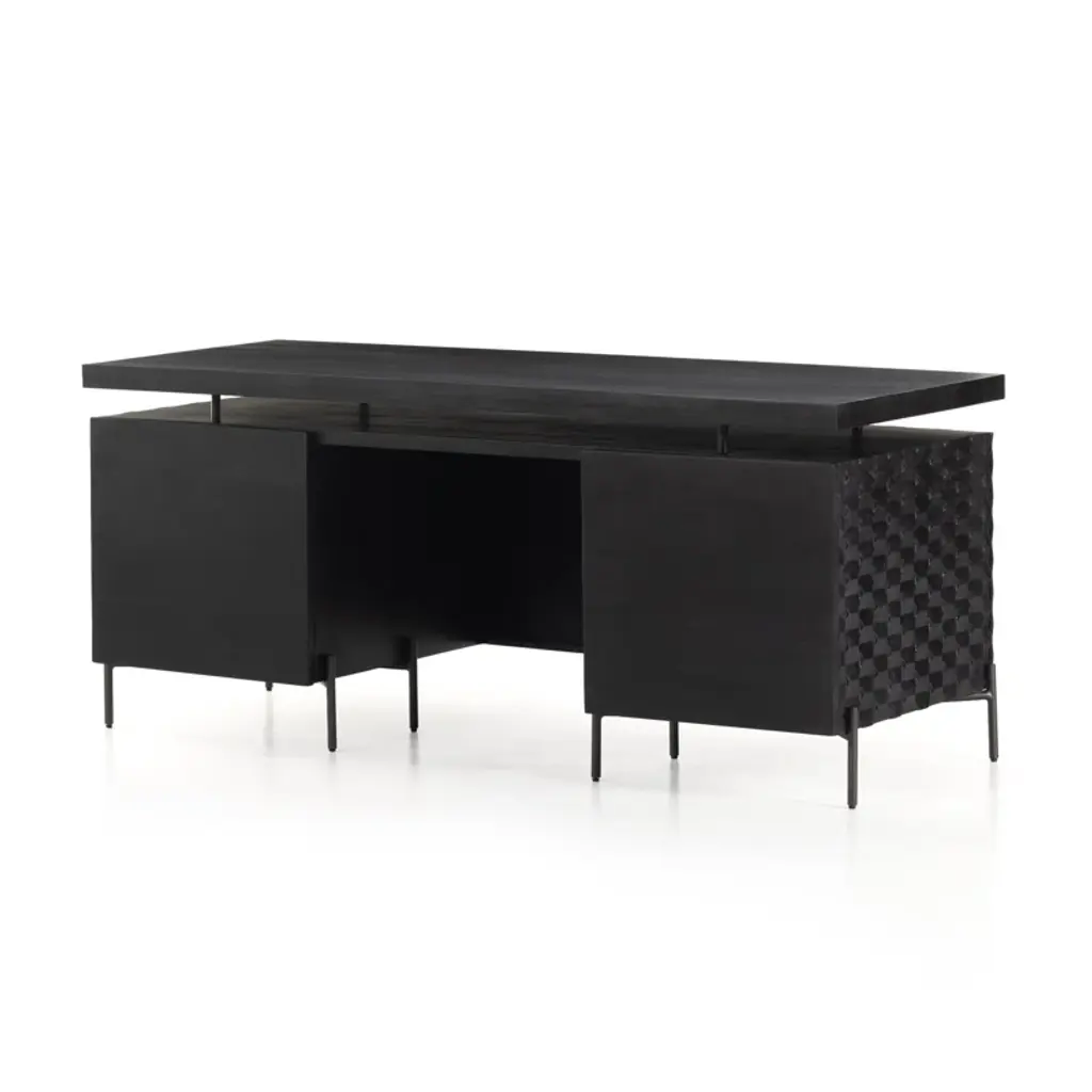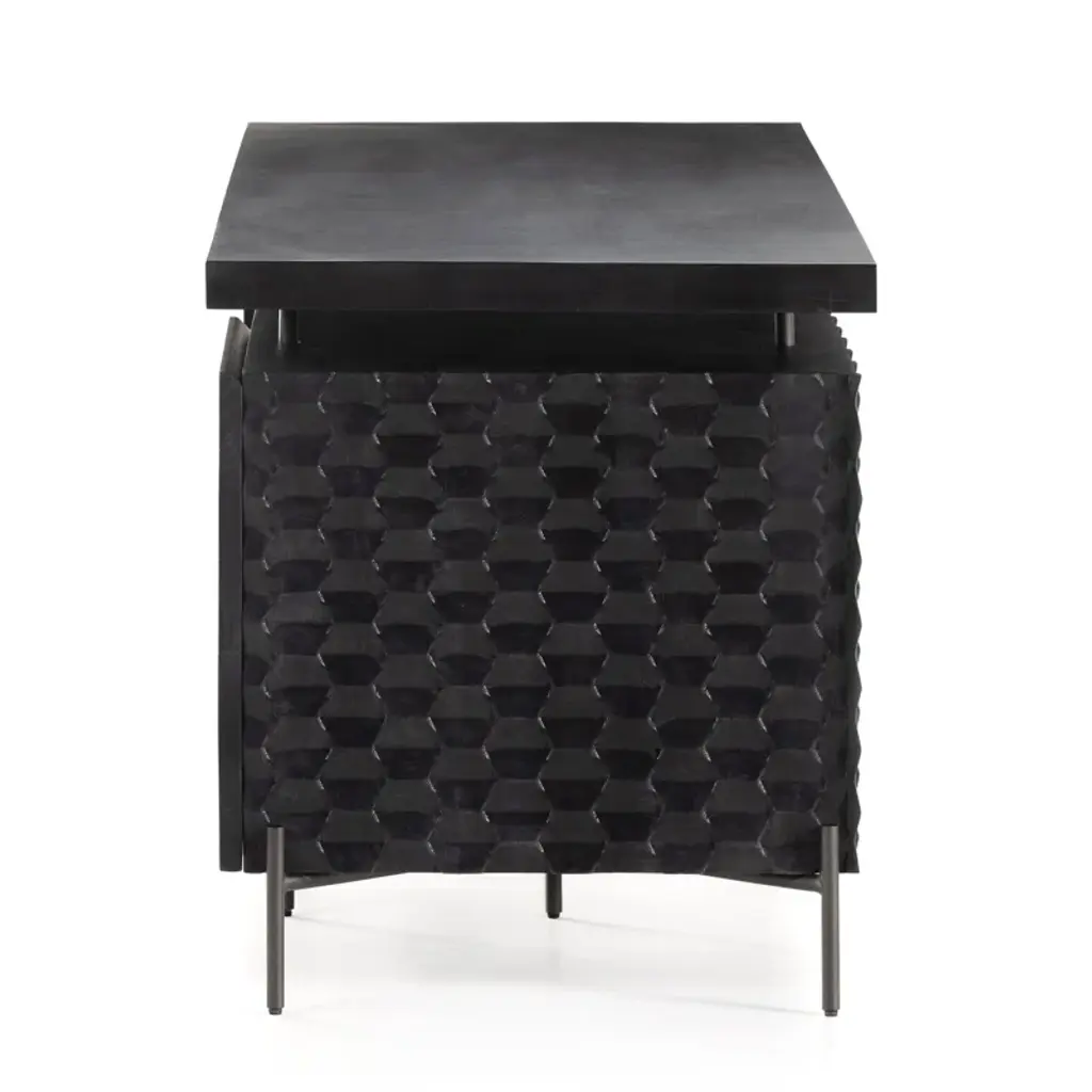 The desk of mango wood features intricate carving for a uniquely textured look and float-like feel. Gunmetal-finished iron legs offer an intriguing material mix with a modern touch.