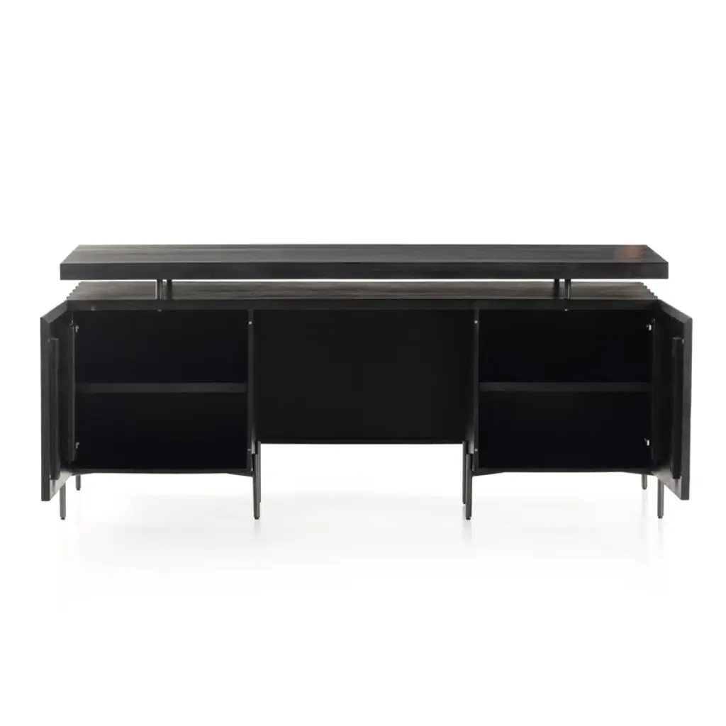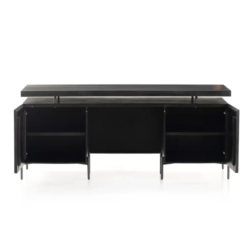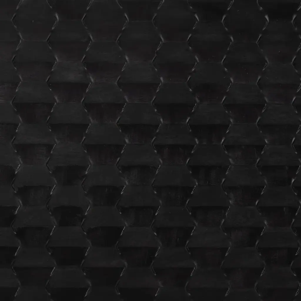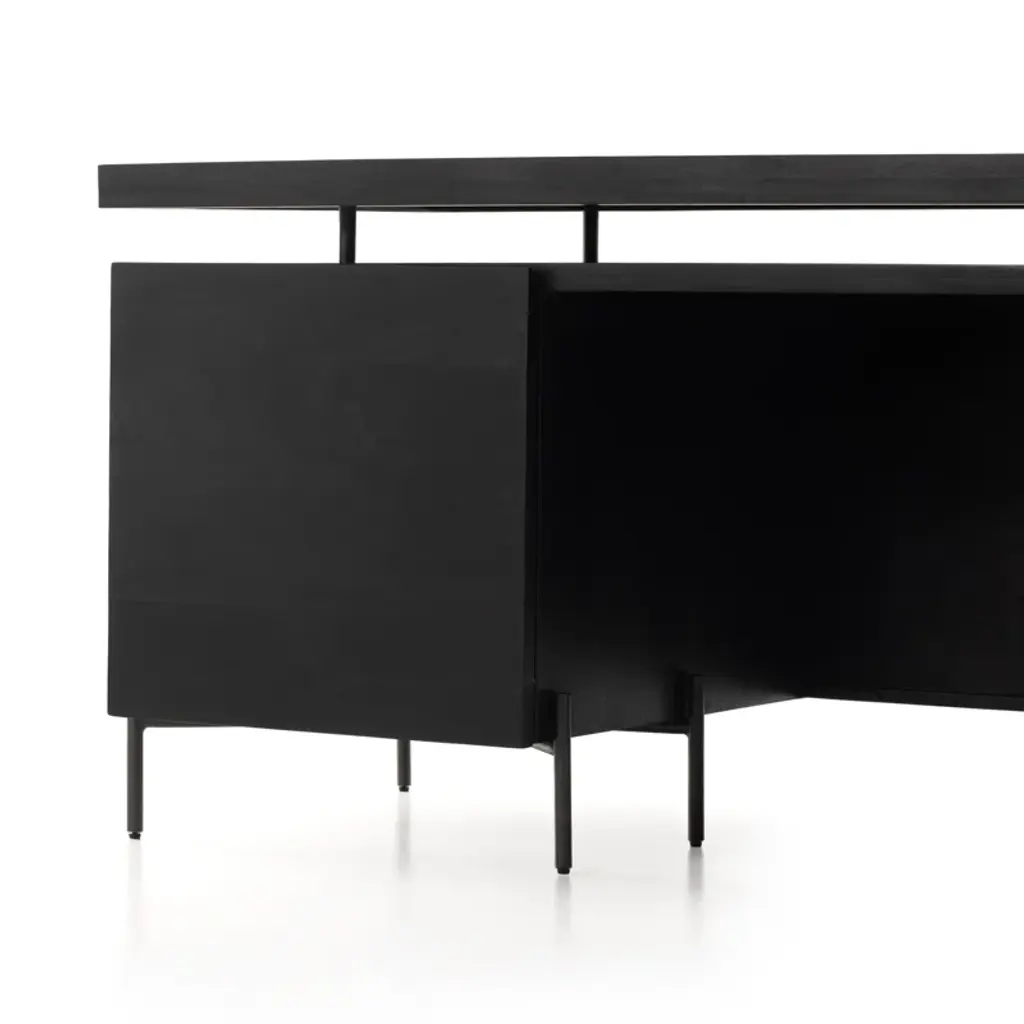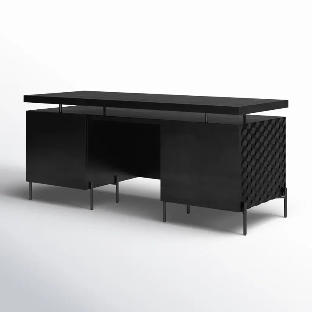 The desk of mango wood features intricate carving for a uniquely textured look and float-like feel. Gunmetal-finished iron legs offer an intriguing material mix with a modern touch.