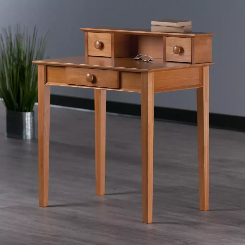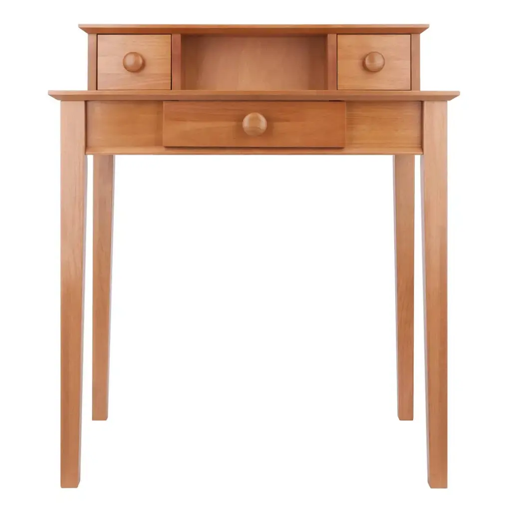 The Studio Writing Desk with Hutch from Winsome is a must-have for your home office or workspace. This honey wood office desk has a built-in hutch with two drawers and a middle compartment for storing and displaying small items. It also features one drawer just underneath the surface where you can easily keep writing utensils, paperwork and other supplies. Small drawer dims 5.51"W x 4.21"D x 4.45"H, Main drawer dims 11.89"W x 11.69"D x 2.44"H. Mix and match with the rest of the studio home office line.
