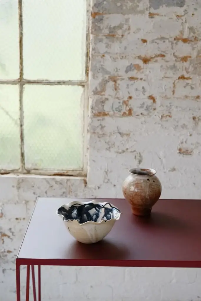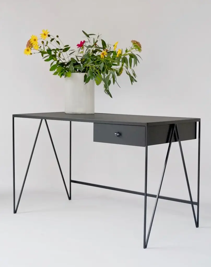 This Study desk is made with a beetroot powder-coated steel frame and a beetroot linoleum top made from all-natural ingredients, such as flax, wood flour and limestone. The furniture linoleum provides a natural satin matt surface with a warm fine texture, a look that is very tactile. This modern minimal desk has one steel drawer suspended underneath the tabletop with our Loop handle. The burgundy Study desk looks great against both period details and in modern surroundings. Available in fifteen powder coated colours for the steel and twenty colours for the natural linoleum top. Measurements: 152cm long, 60cm deep, 74cm high. Labeled by Maker