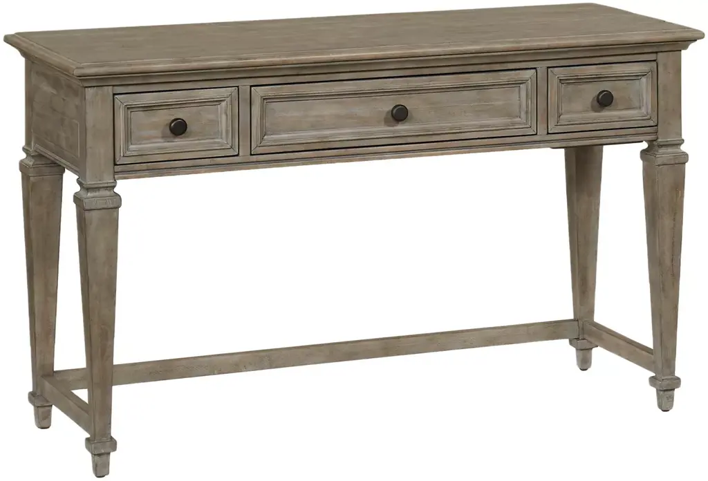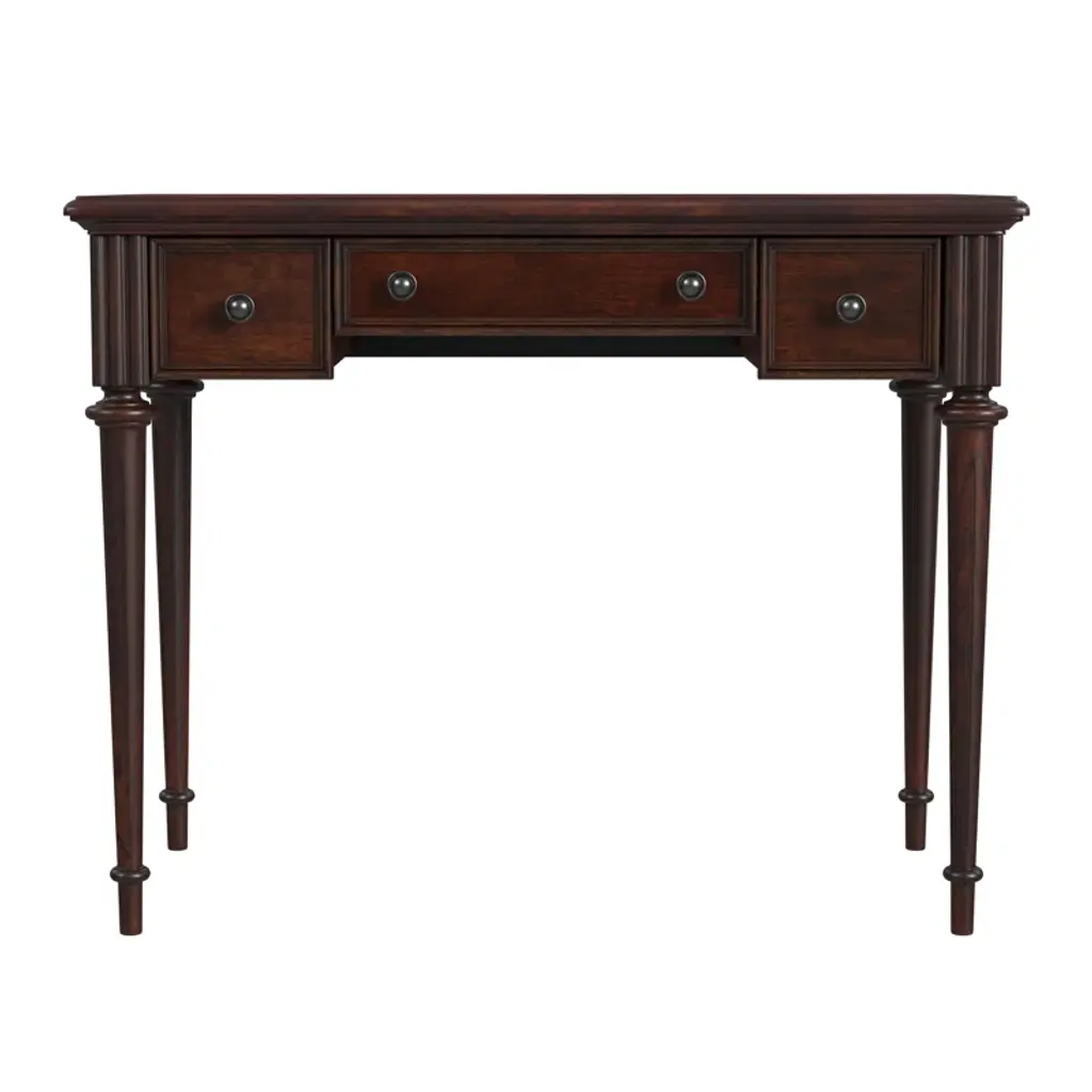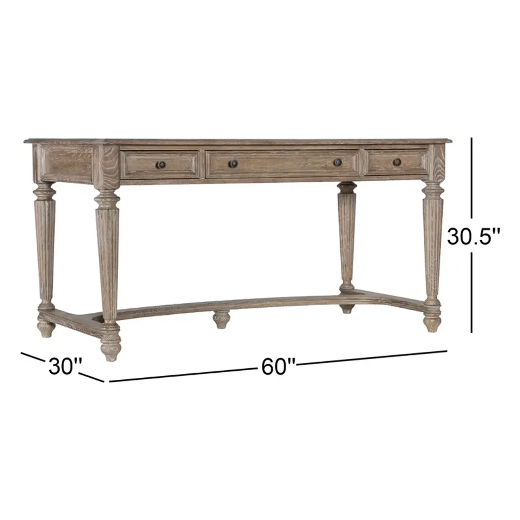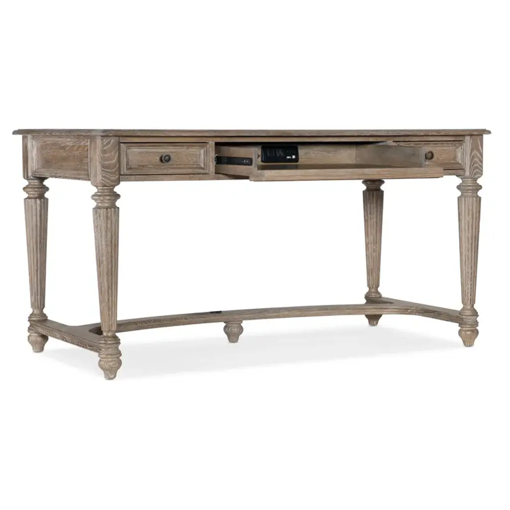 Traditional with a twist, the Sutter Writing Desk is crafted of cathedral oak veneers with a classic silhouette and designer details such as shaped fluted legs, spool feet, and a curved stretcher. The finish is a casual clear oak revealing the tactile veneer pattern for a reclaimed look, with champagne-colored pulls and knobs. Featuring 3 drawers, the left and right drawers have a removable pencil tray and a writing slide that can be used in either drawer. The center drawer has a drop-front for keyboard use. An FC620 power bar is located in the back of the keyboard drawer with 2 electrical outlets, a phone jack, high-speed data ports, and a USB upstream. The Work Your Way program focuses on the new reality many consumers face as they continue to do much of their work from their homes.