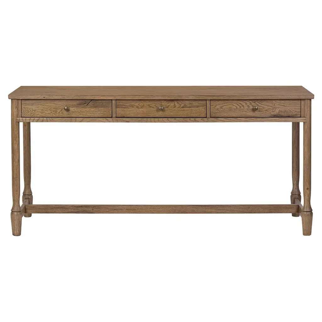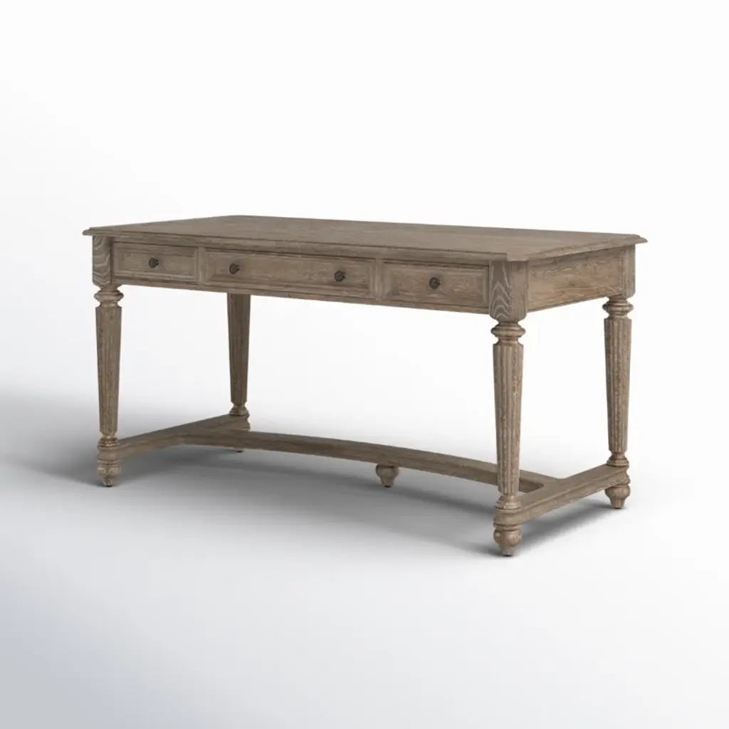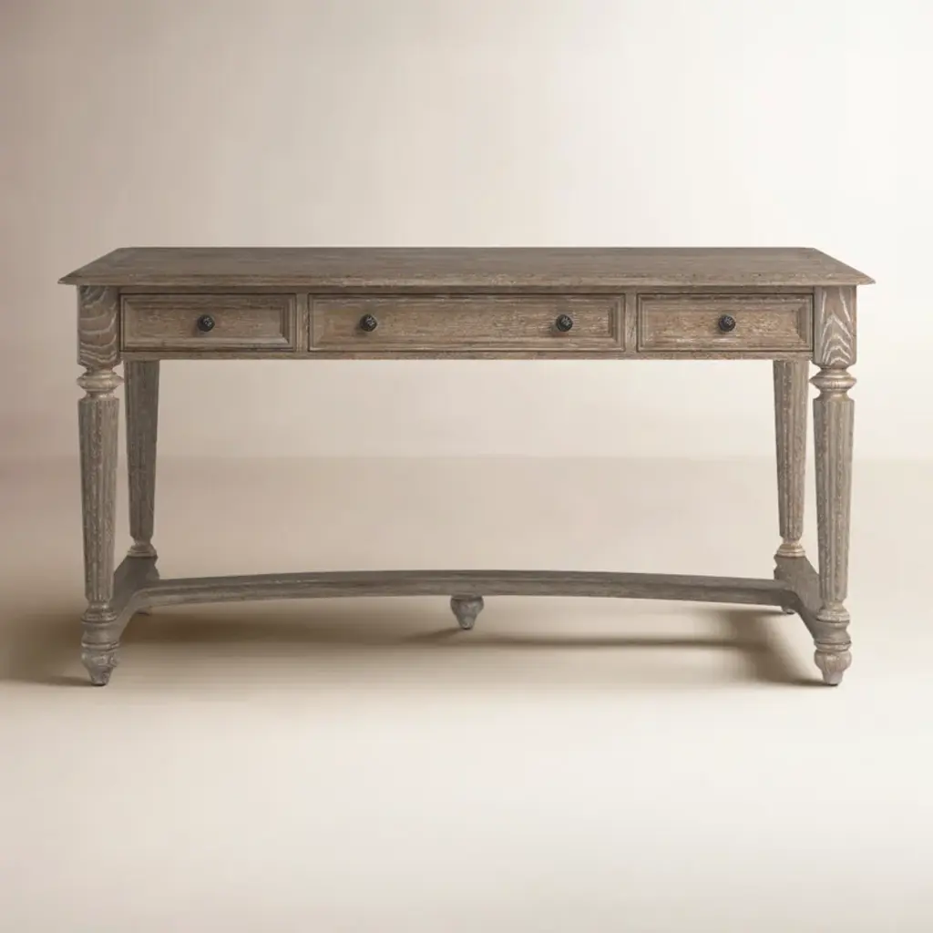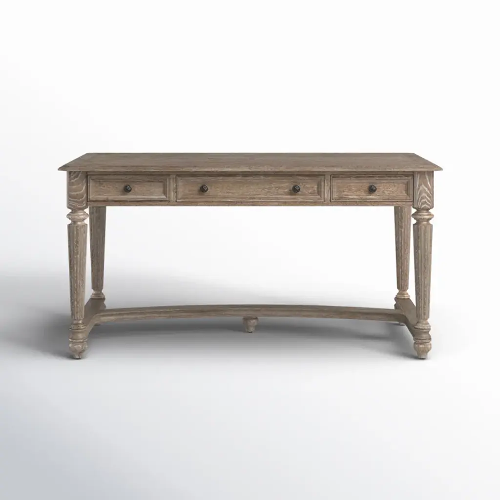 Traditional with a twist, the Sutter Writing Desk is crafted of cathedral oak veneers with a classic silhouette and designer details such as shaped fluted legs, spool feet, and a curved stretcher. The finish is a casual clear oak revealing the tactile veneer pattern for a reclaimed look, with champagne-colored pulls and knobs. Featuring 3 drawers, the left and right drawers have a removable pencil tray and a writing slide that can be used in either drawer. The center drawer has a drop-front for keyboard use. An FC620 power bar is located in the back of the keyboard drawer with 2 electrical outlets, a phone jack, high-speed data ports, and a USB upstream. The Work Your Way program focuses on the new reality many consumers face as they continue to do much of their work from their homes.