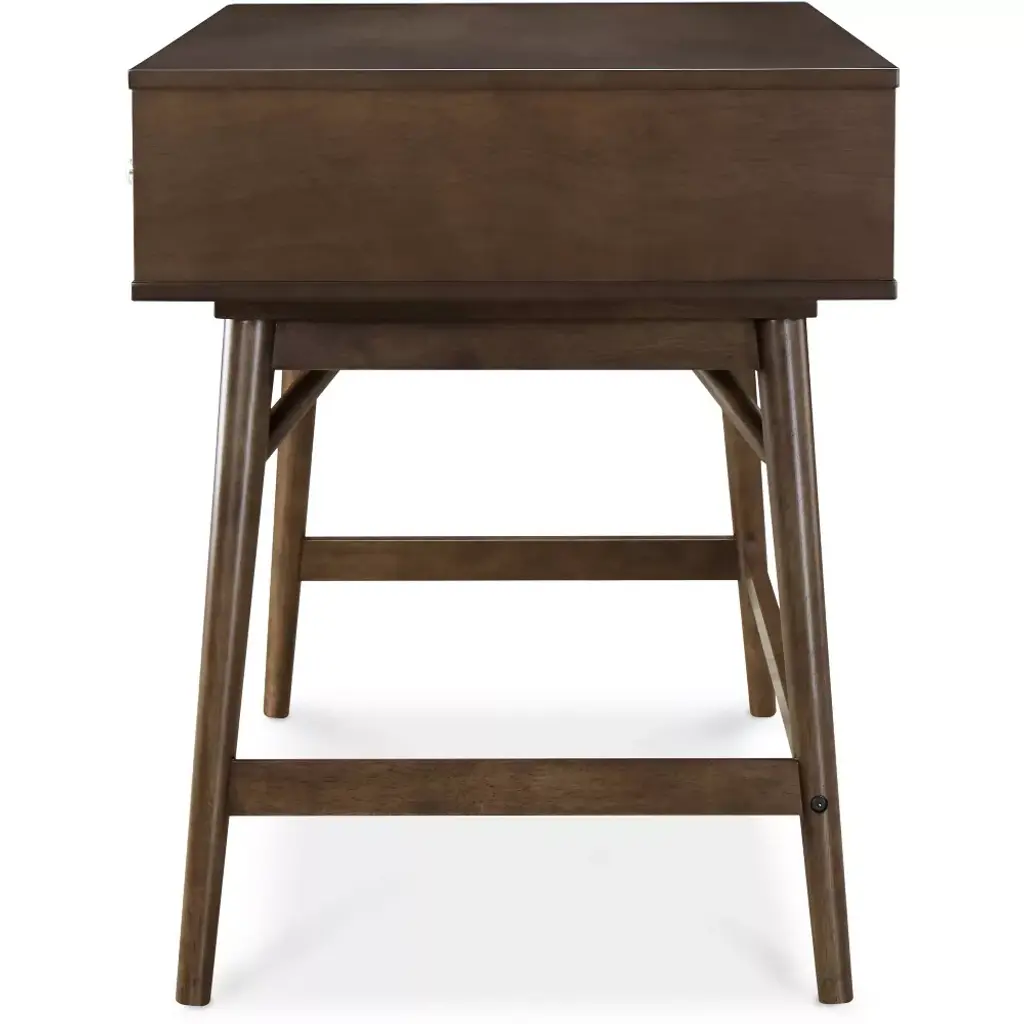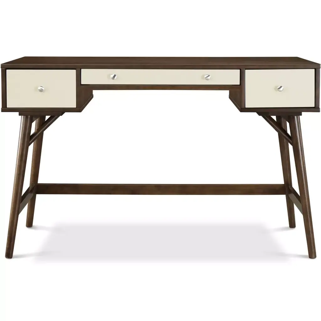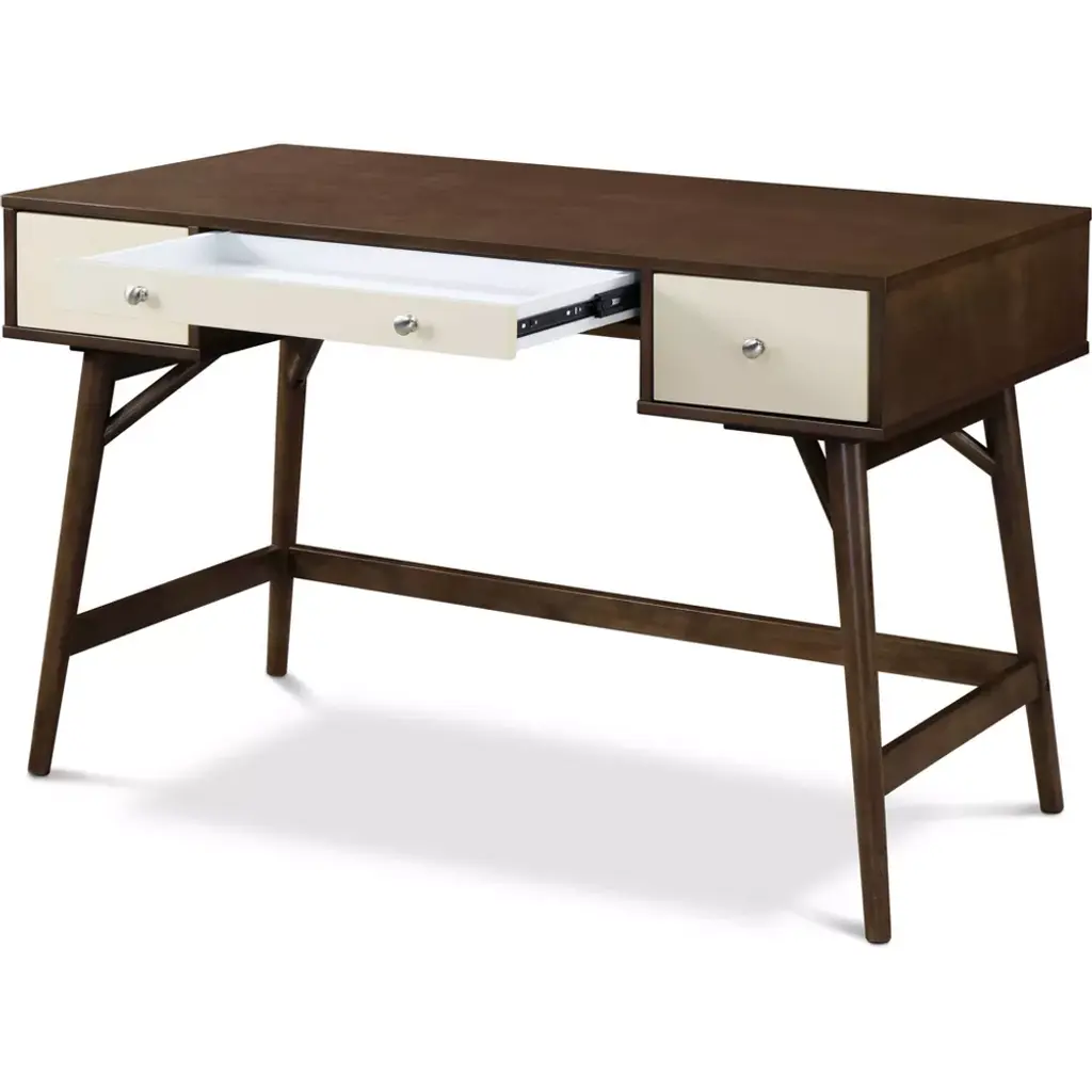 This charming writing desk features midcentury modern style and clean lines to liven up any space. Anchored by tapered, flared legs, this office desk uses two colors and simple architecture to create a perfect base for paperwork, homework, or web browsing. The cream white drawer fronts on the dark wood make for striking eye appeal, accented by a touch of luster with brushed nickel knobs. This contemporary piece works well in a home office, bedroom, kids’ room, or a corner of your living room.DimensionsWidth: 47.25 inchesDepth: 23.75 inchesHeight: 29.5 inches