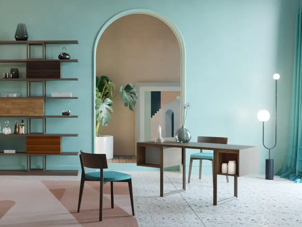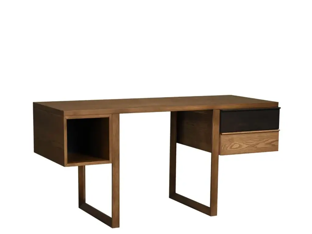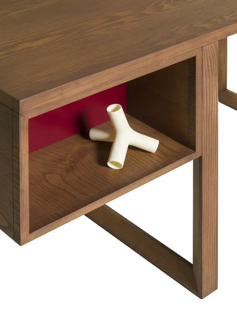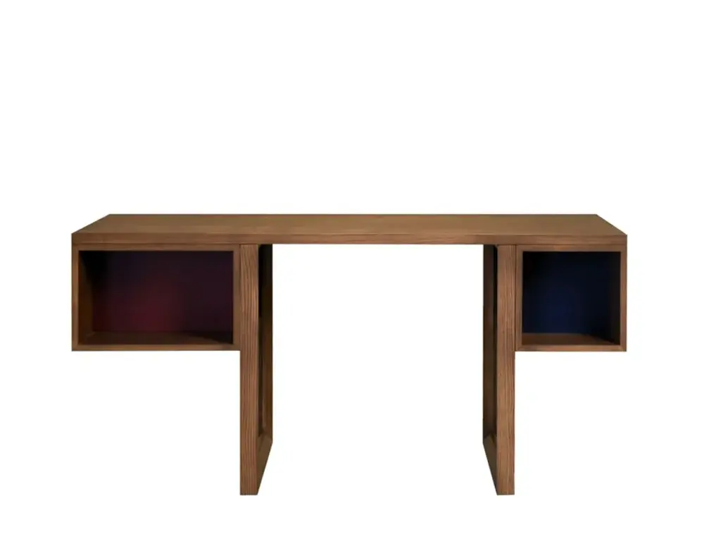 Ash wood desk with 2 drawers placed on the right and 1 open compartment on the left. On the back has 2 open compartments. Open compartments with colored interior.With the SWING collection Morelato presents a new modular system with standing or hanging elements of different sizes, suitable to furnish many different spaces. Each element can be open, or with doors or drawers. The structure is made of ash wood in different color stains to liven up the unit and give a contemporary touch to the room.The shelves are made of glass. It is possible to create an infinite number of compositions according to your own taste by modulating the different SWING elements creating a sideboard, a chest of drawers, a dresser, or a TV stand as well as other customized pieces.