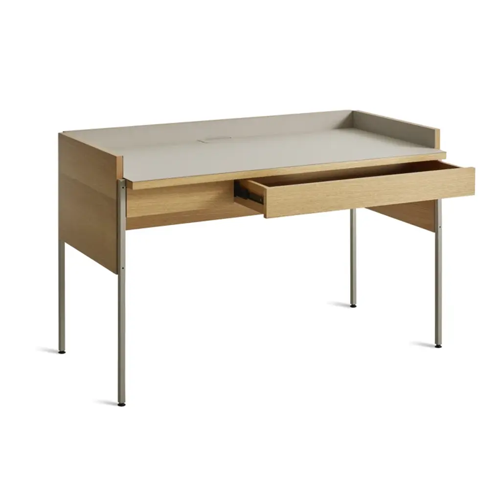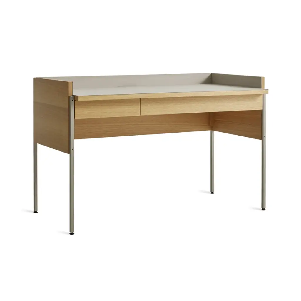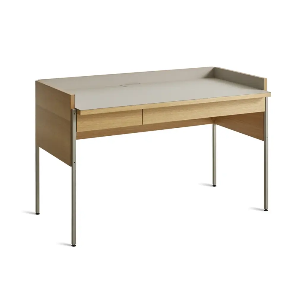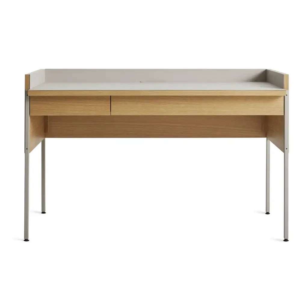 News flash! A solid desk makes the workday easy peasy. Tabloid is happy to check its sources. A wide wood frame cocoons a durable and delightful Forbo linoleum desktop. Color-coordinated steel legs give it all a boost. Hidden cord management and inconspicuous drawers team up to complete the job with brio. Yep, all check out.