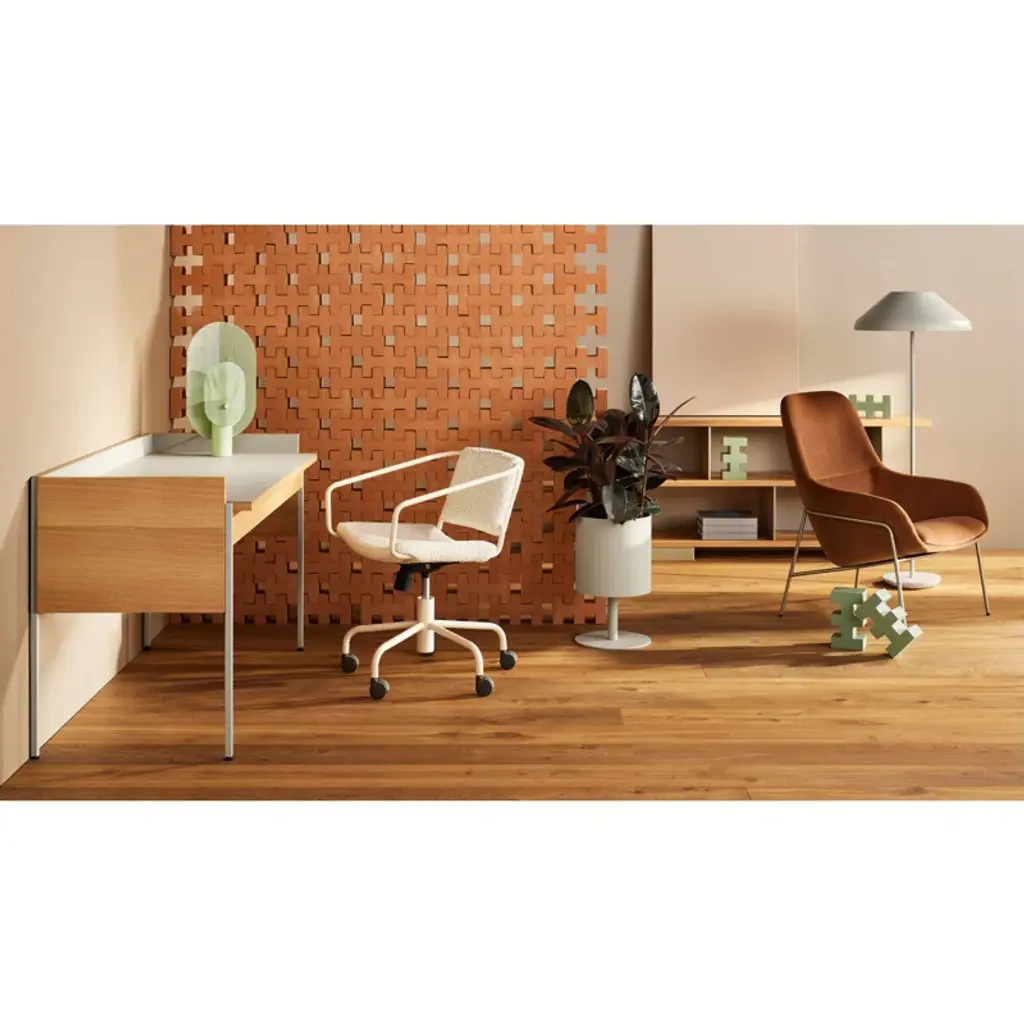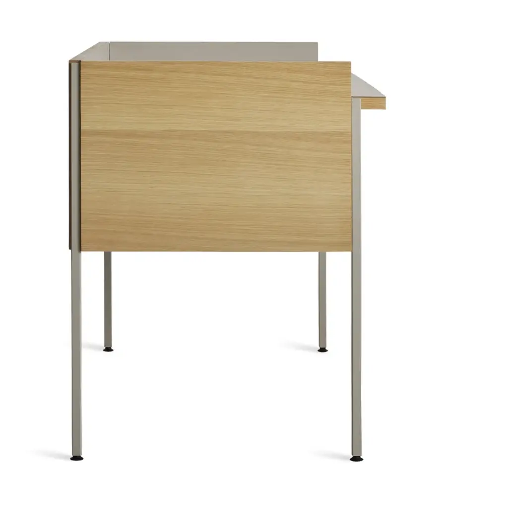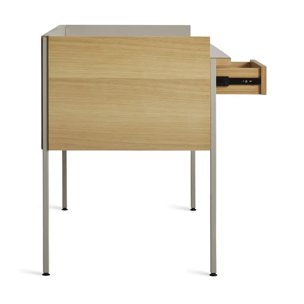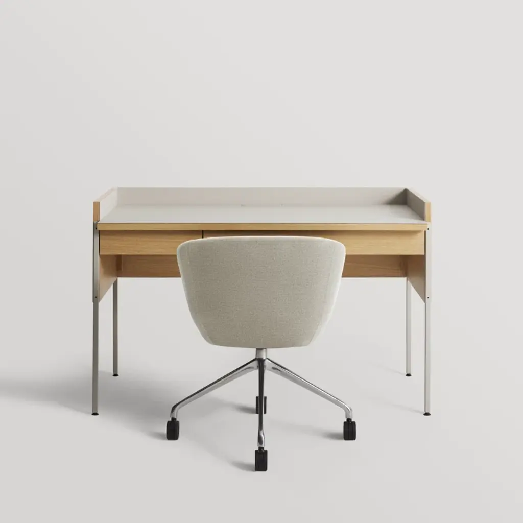 News flash! A solid desk makes the workday easy peasy. Tabloid is happy to check its sources. A wide wood frame cocoons a durable and delightful Forbo linoleum desktop. Color-coordinated steel legs give it all a boost. Hidden cord management and inconspicuous drawers team up to complete the job with brio. Yep, all check out.