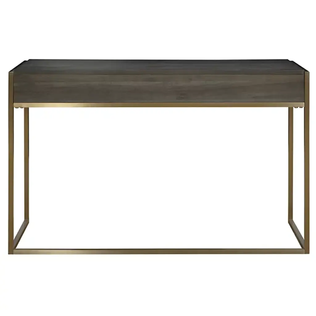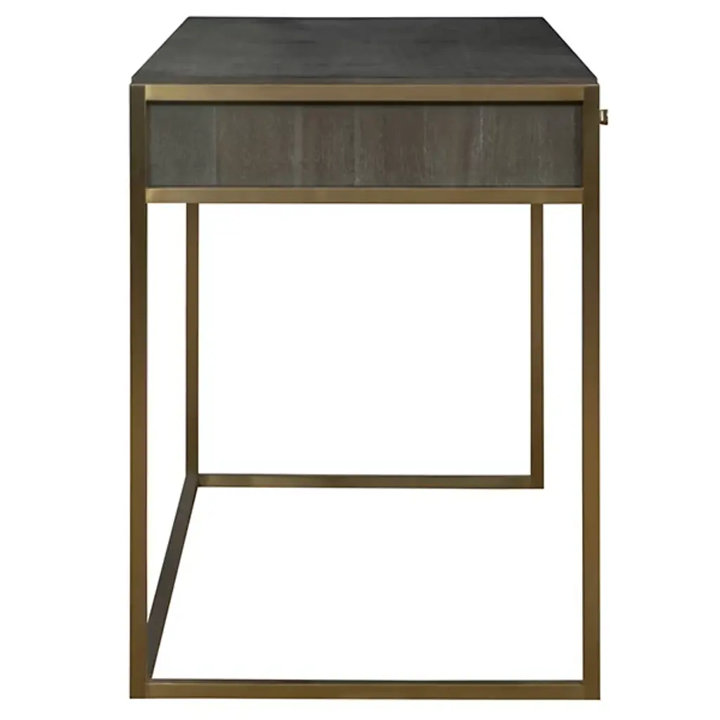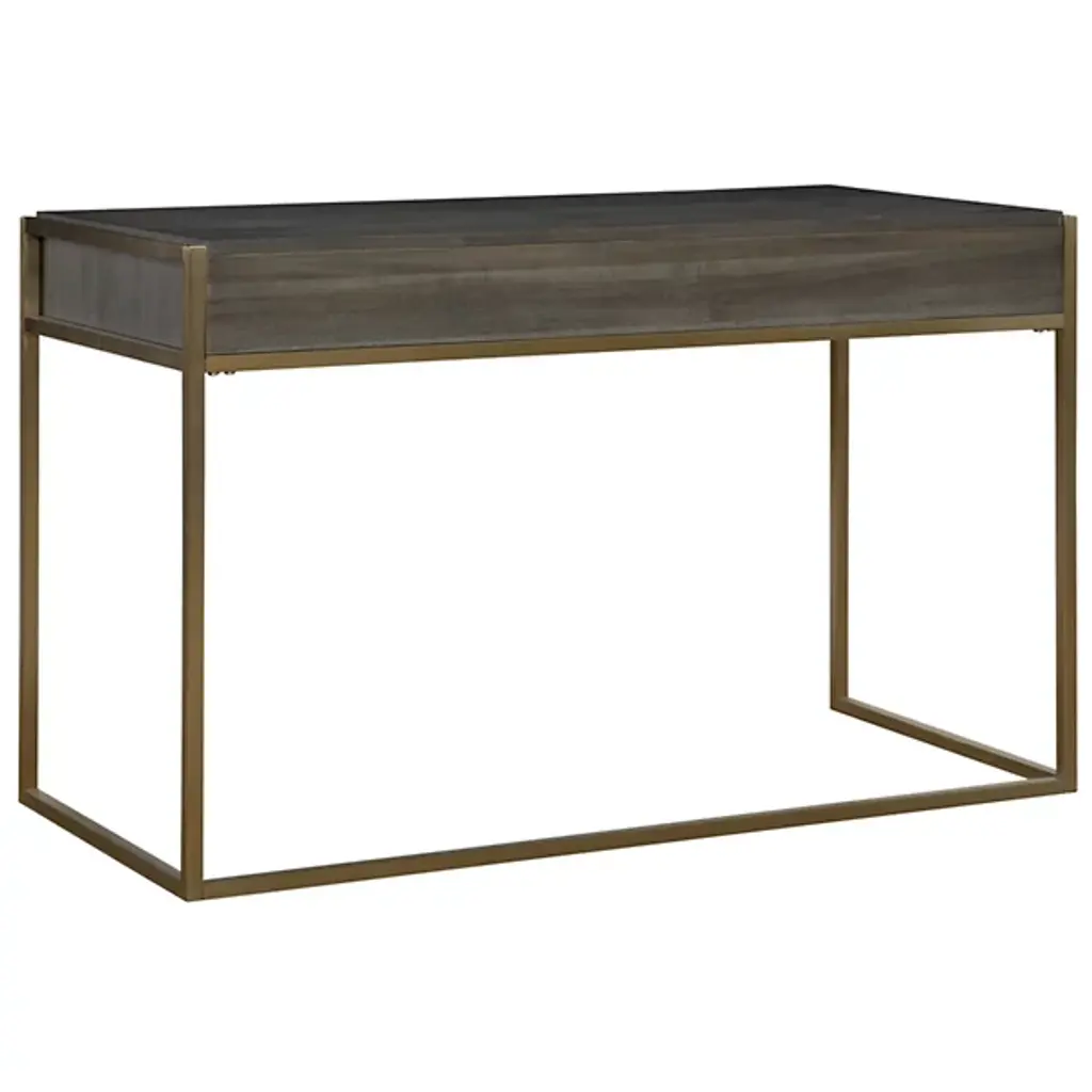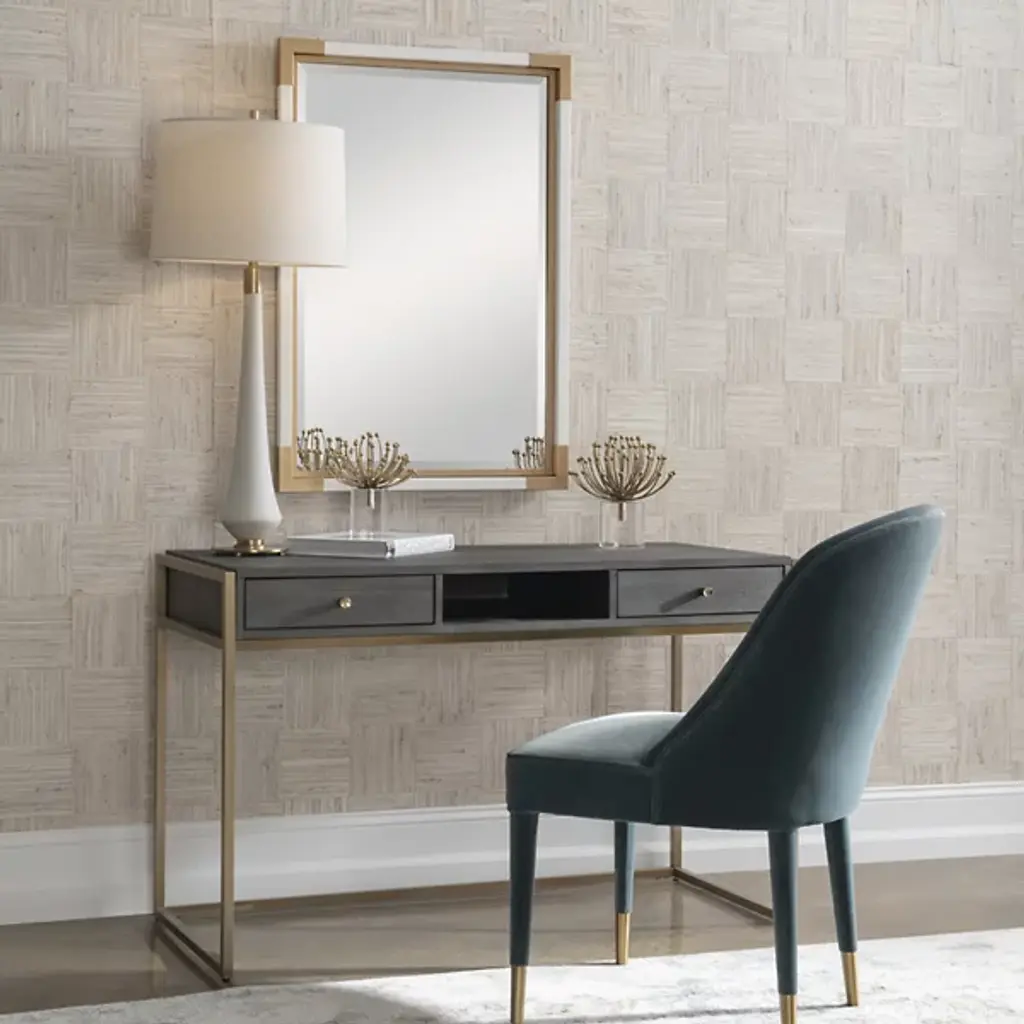 The Taja Writing Desk by Uttermost emerges as an enticing addition to indoor living spaces. Designed by Matthew Williams, it's crafted with a stainless steel framework finished in brushed brass, creating an inspired mix of elegance and sophistication. Its acacia veneer top, featuring a dark walnut stain washed with a light gray glaze, infuses warmth and character into the refined design. At the same time, its central storage alcove, flanked by a drawer on each side, enhances its functionality and practicality. Clean lines and an engaging silhouette complement contemporary interiors while incorporating the charm of mid-century modern aesthetics.