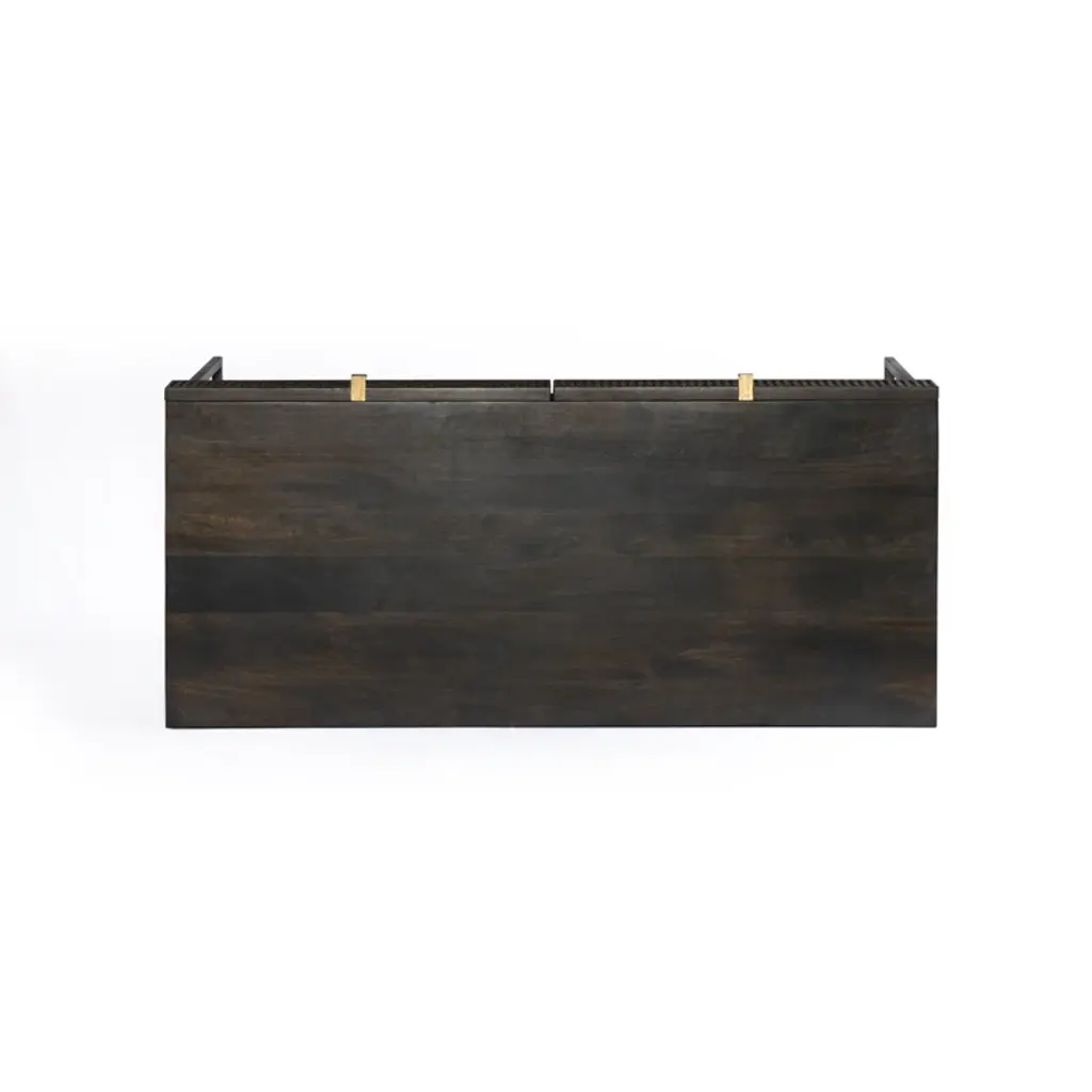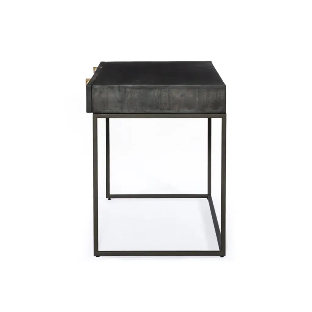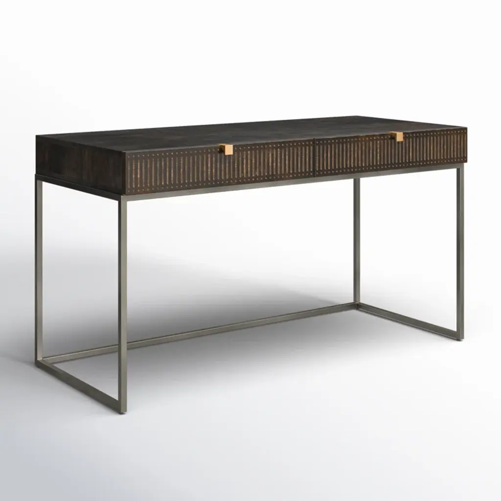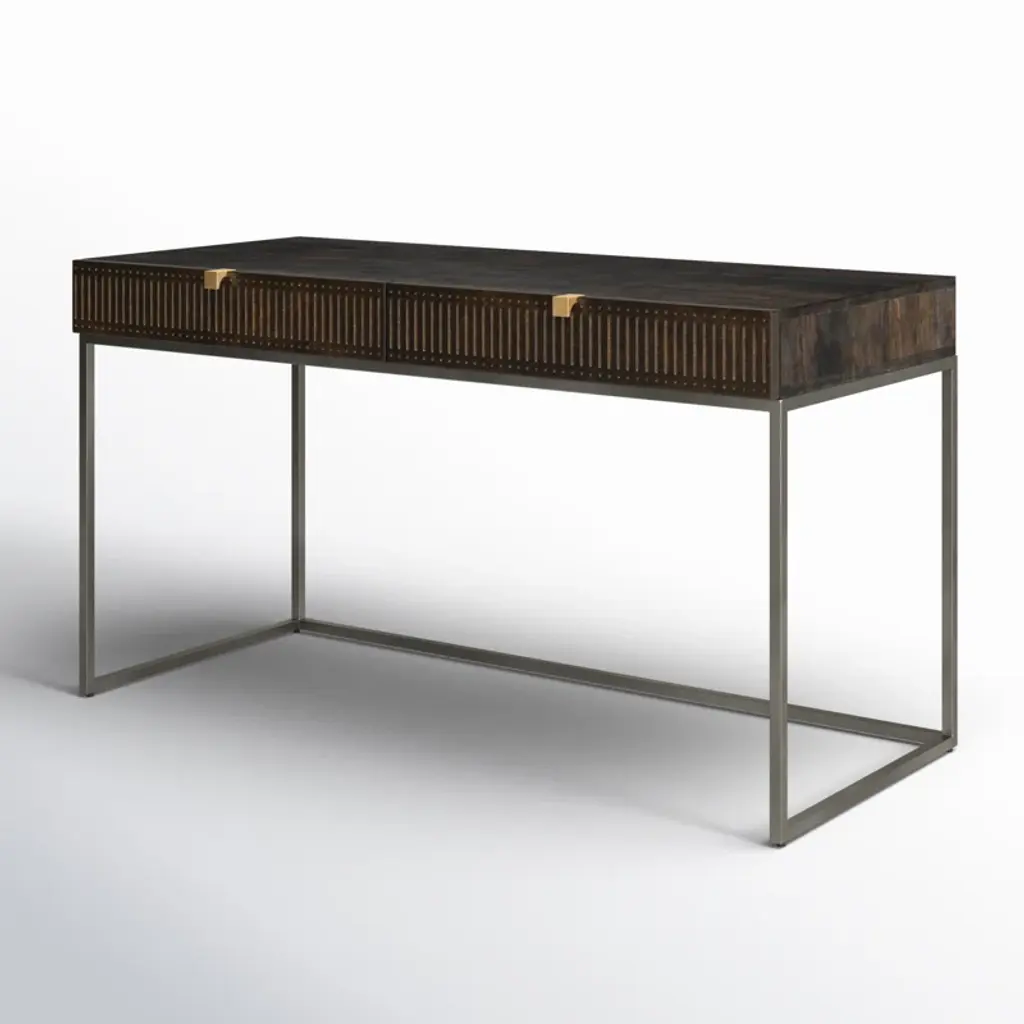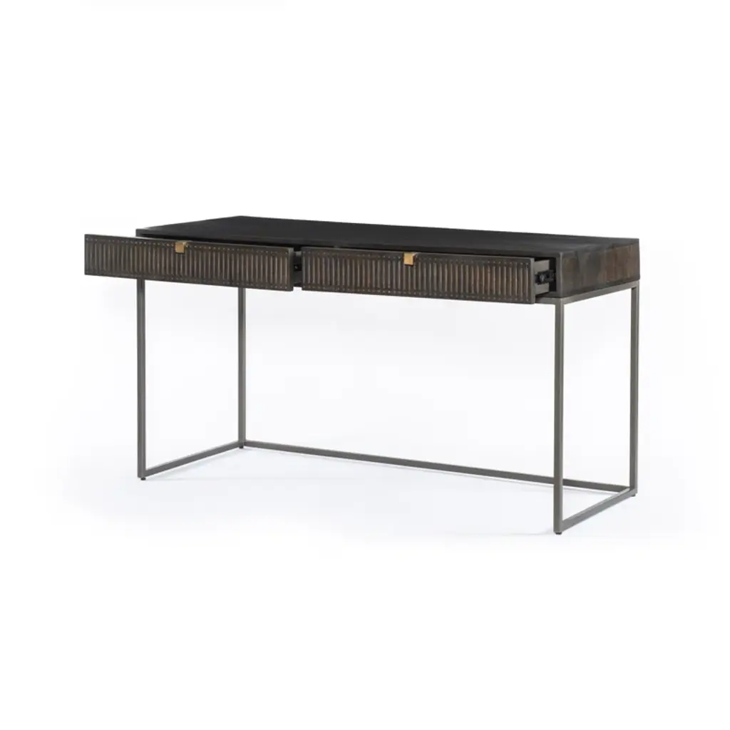 Unique linear carving meets fresh dimensions with an artisan slant. Mango wood casing is finished in a vintage, highlighting texture and high craftsmanship. A slim iron base adds a long, airy look, while dual drawers keep desk necessities on hand.