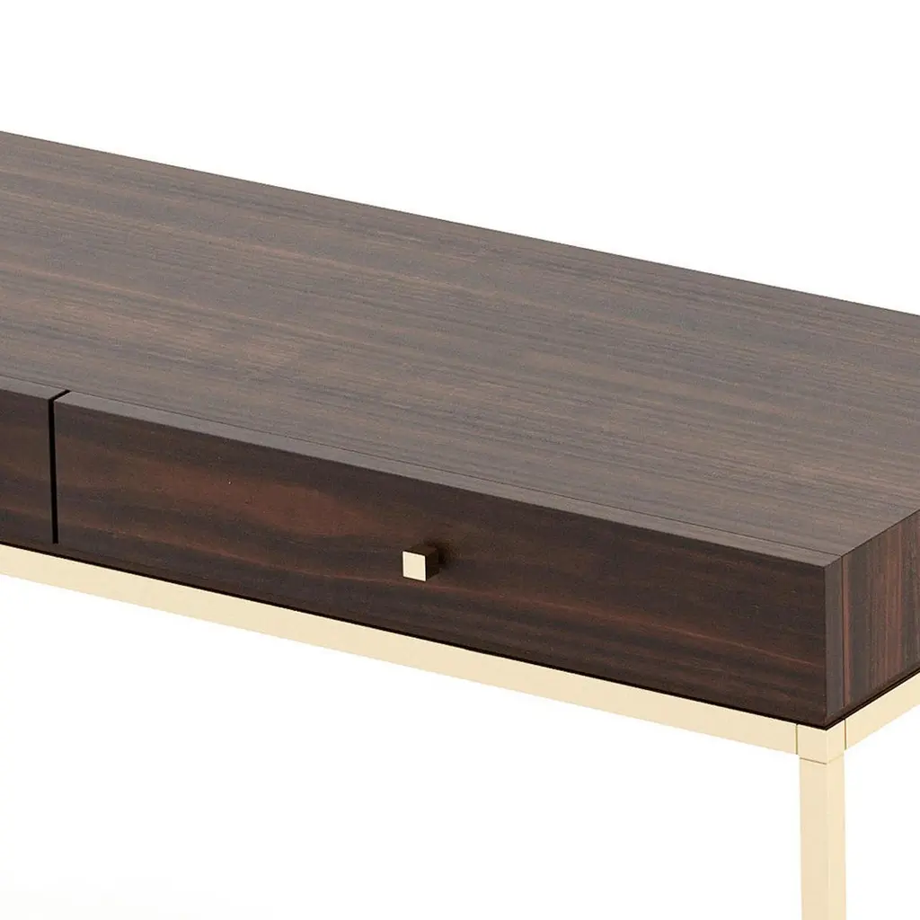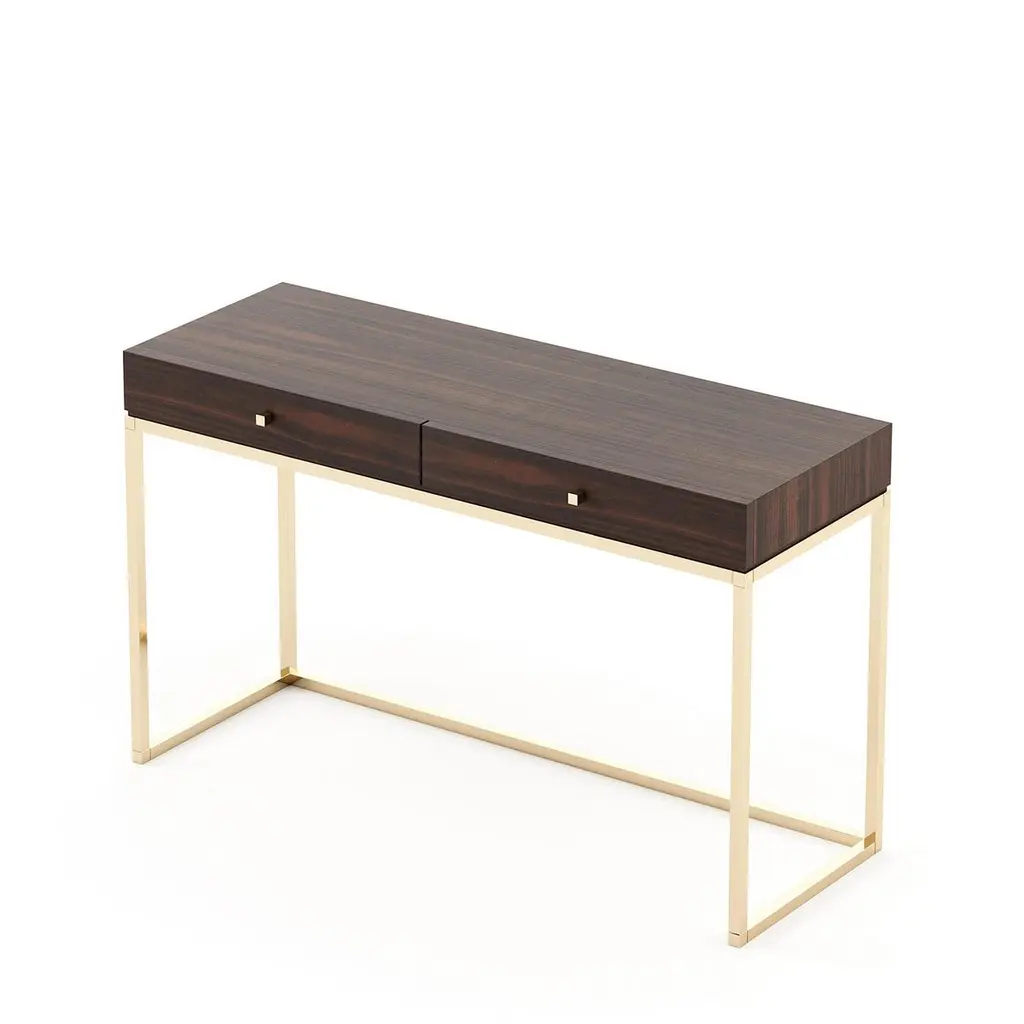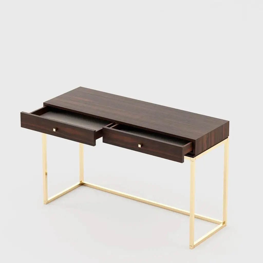 Desk Tanka with structure in smocked eucalyptus wood in matte finish, with 2 drawers with easy glide system. With basein polished stainless steel in gold finish.Also available in ebony matte finish, or grey oak matte finish,or natural oak finish, or rosewood matte finish, or in walnutmatte finish, on request.
