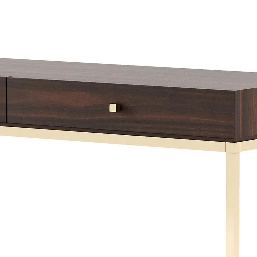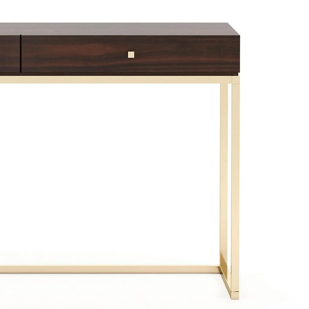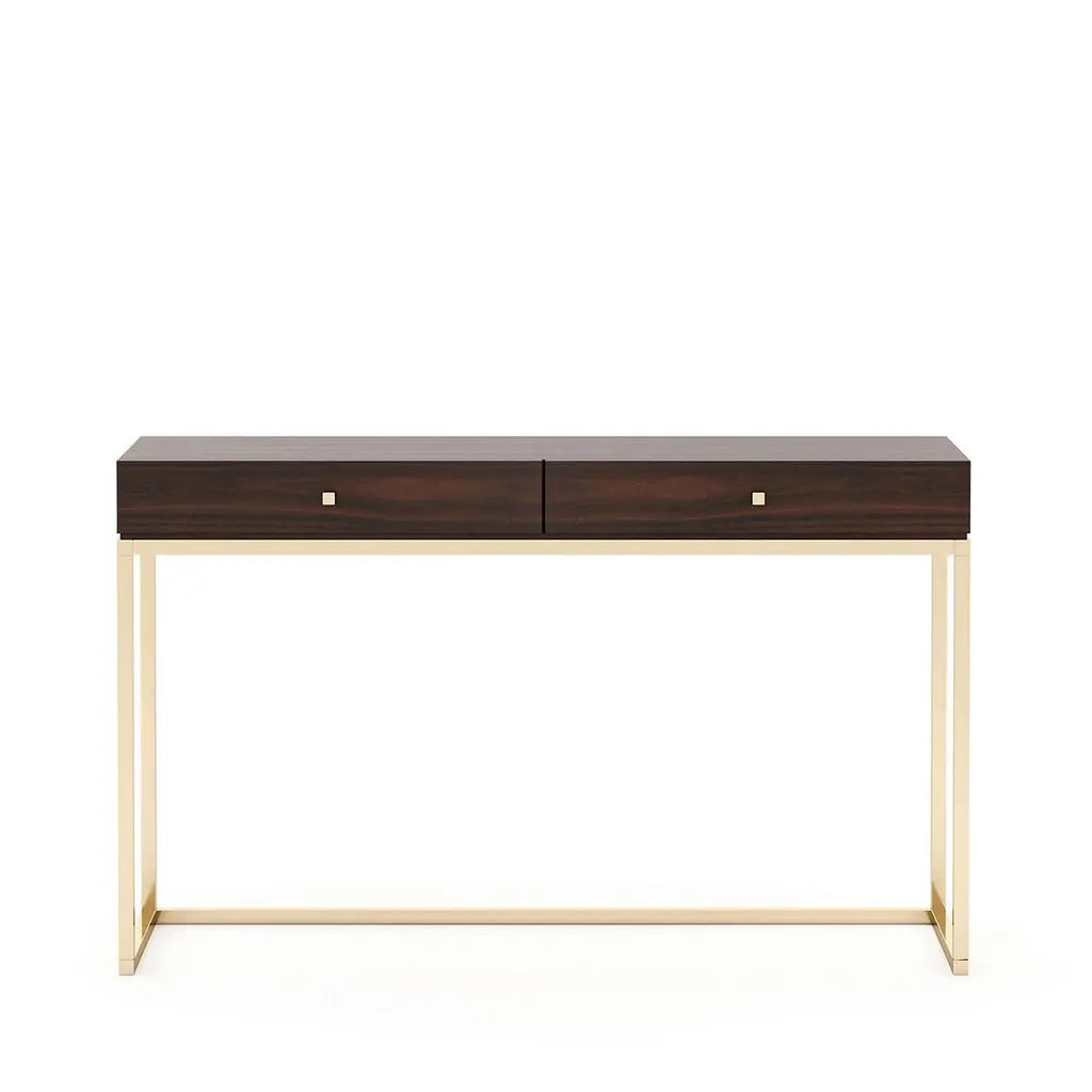 Desk Tanka with structure in smocked eucalyptus wood in matte finish, with 2 drawers with easy glide system. With basein polished stainless steel in gold finish.Also available in ebony matte finish, or grey oak matte finish,or natural oak finish, or rosewood matte finish, or in walnutmatte finish, on request.