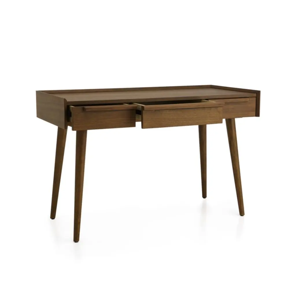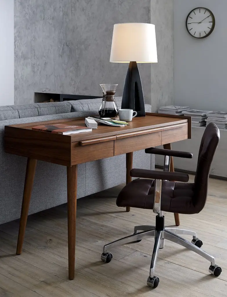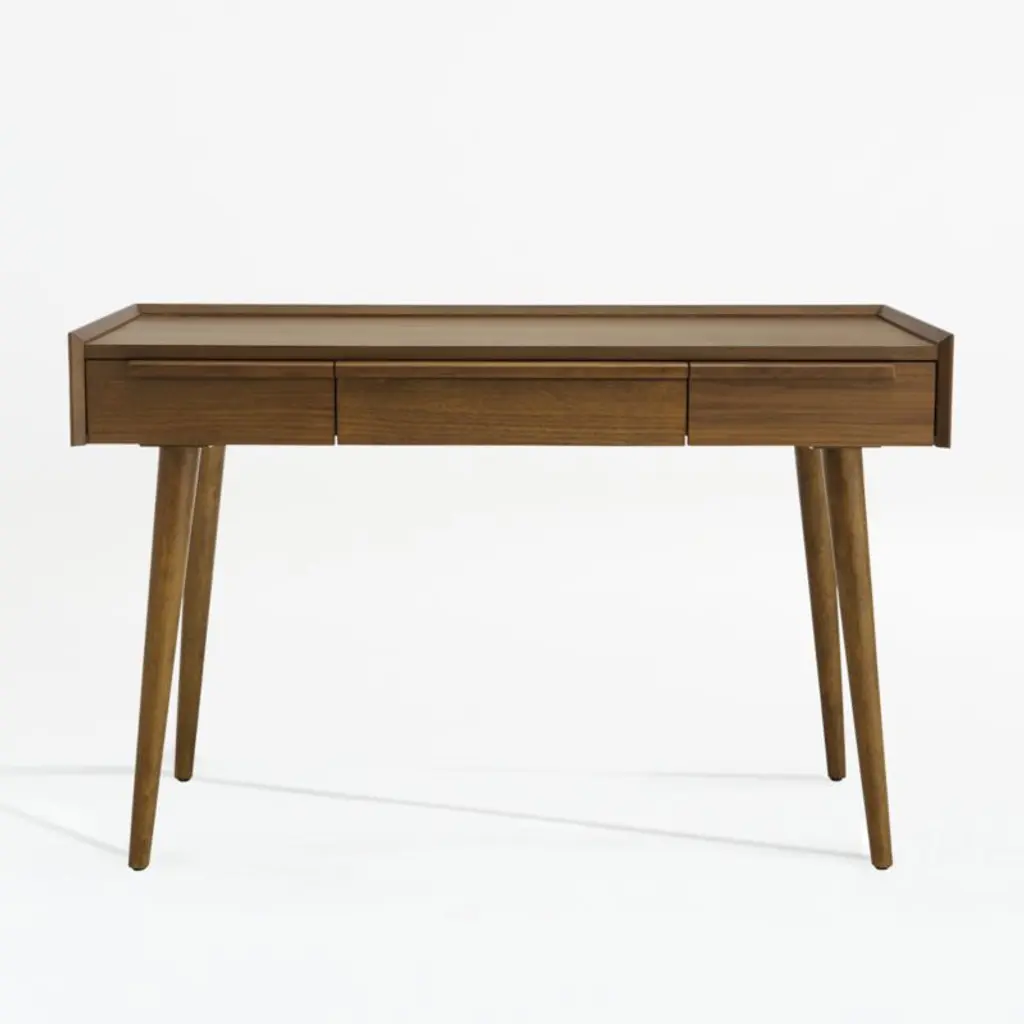 Our 1960s-inspired Tate desk recalls the timelessness of mid-century design with a tailored profile and streamlined shape. Crafted of solid walnut and walnut veneer, the desk showcases three drawers united by linear undercut drawer pulls that run the length of the desk.