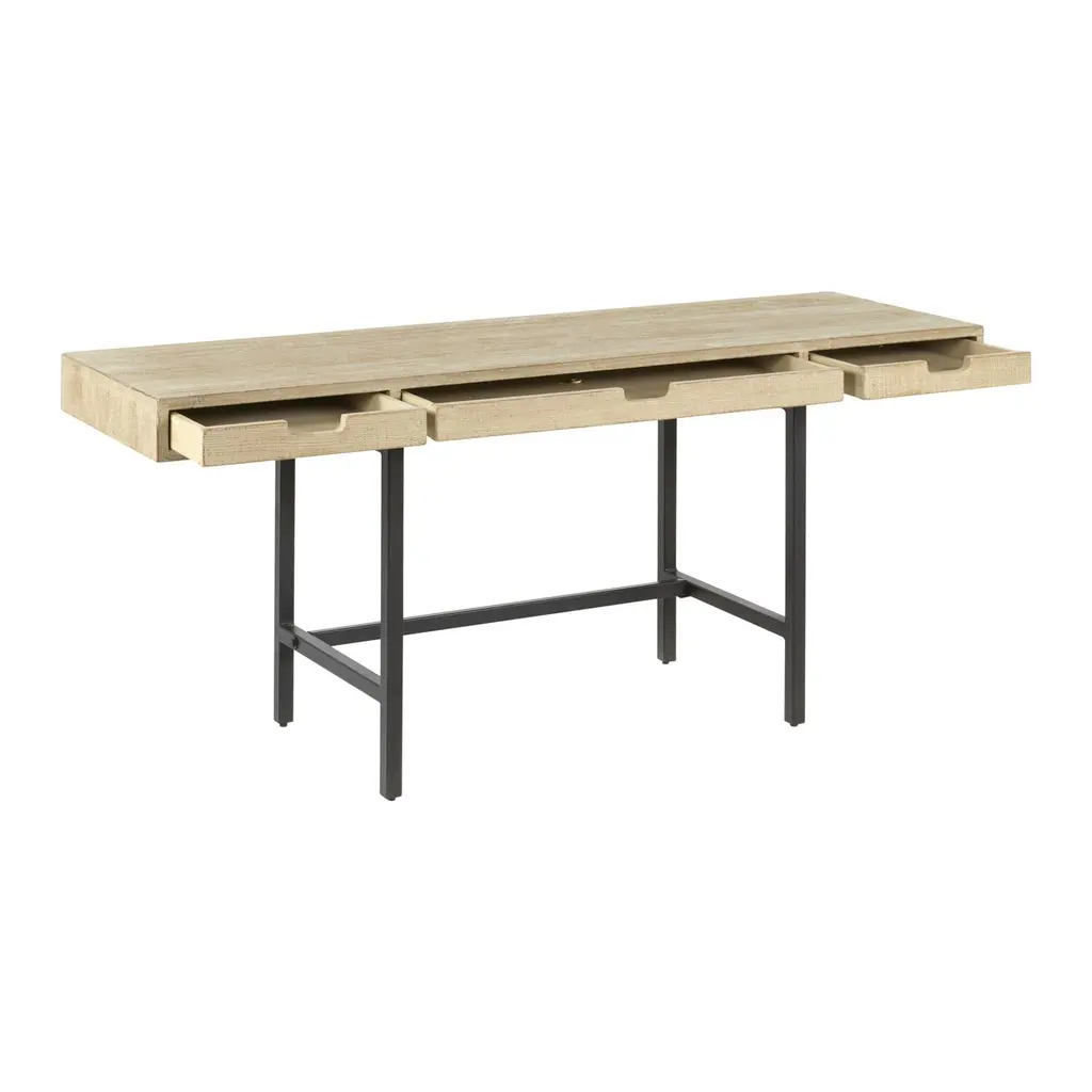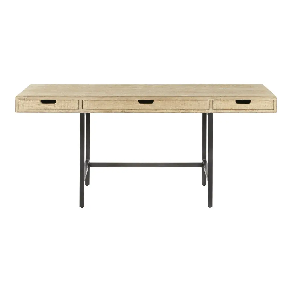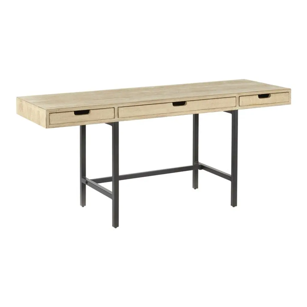 A one-of-a-kind work of natural art with unique variations in color and grain pattern, the Tate desk's reclaimed-wood construction guarantees that no two pieces are alike. With a chic graywash finish and a stable black-metal base, this compact piece features three drawers with cutout handles. Its spacious work surface and convenient storage make this versatile desk a handy computer station, writing table or for art and crafts.