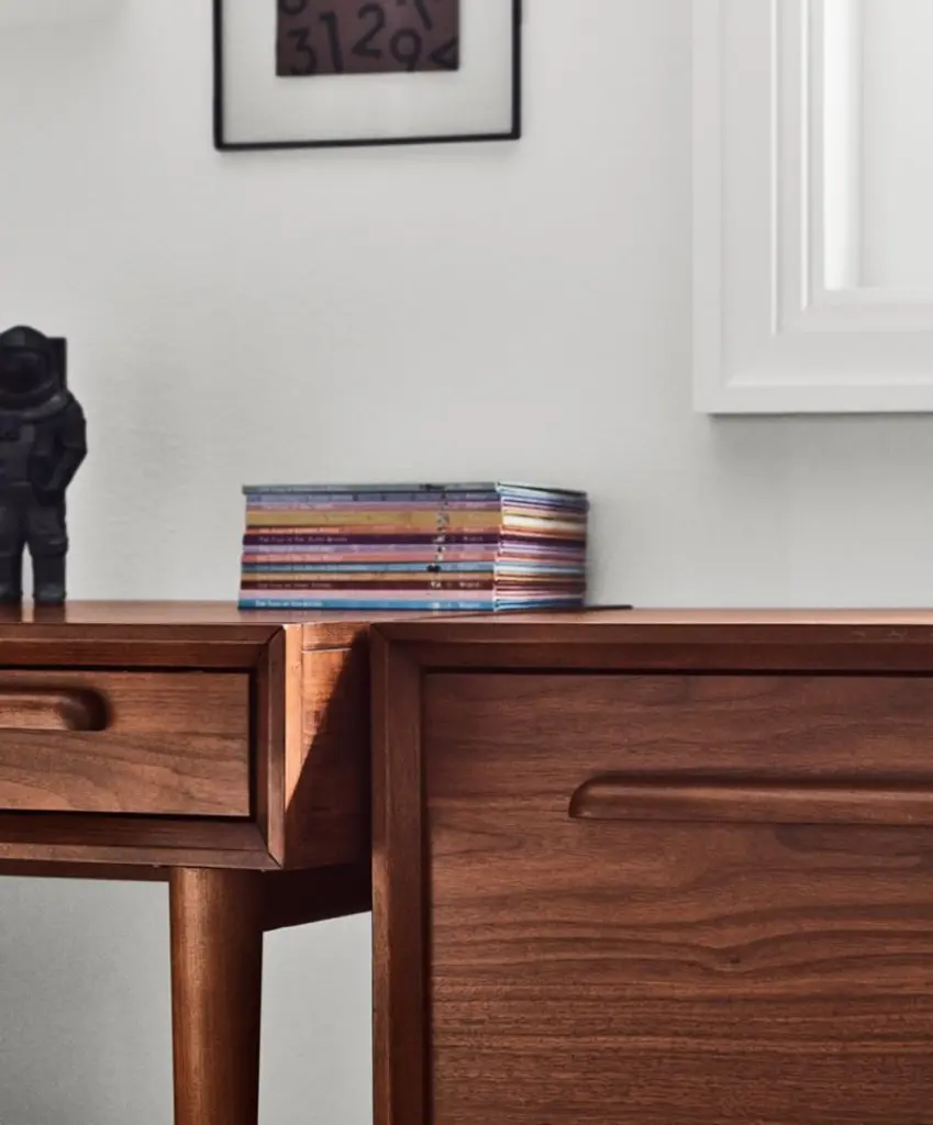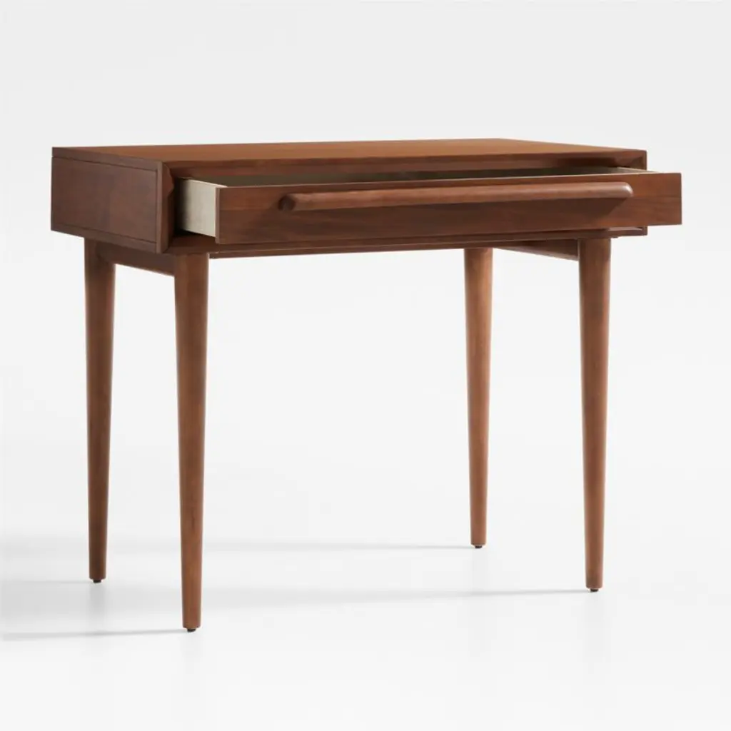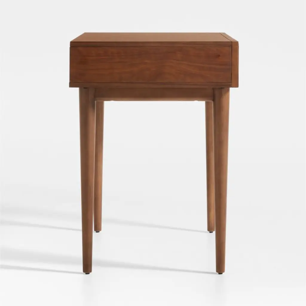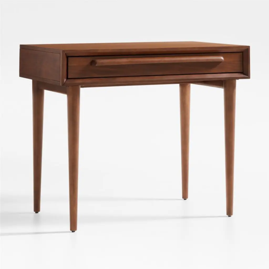 Meet Tatum. Crate & Kids' quintessential mid-century furniture collection for today's modern family. Tailored lines and tapered legs are expertly crafted in solid poplar and walnut veneer with a natural walnut finish to highlight the gorgeous grain pattern. Our Tatum Desk features one smooth-gliding drawer with a linear undercut drawer pull, perfect for tucking away school and art supplies. Create a timeless design with coordinating pieces from our Tatum collection.