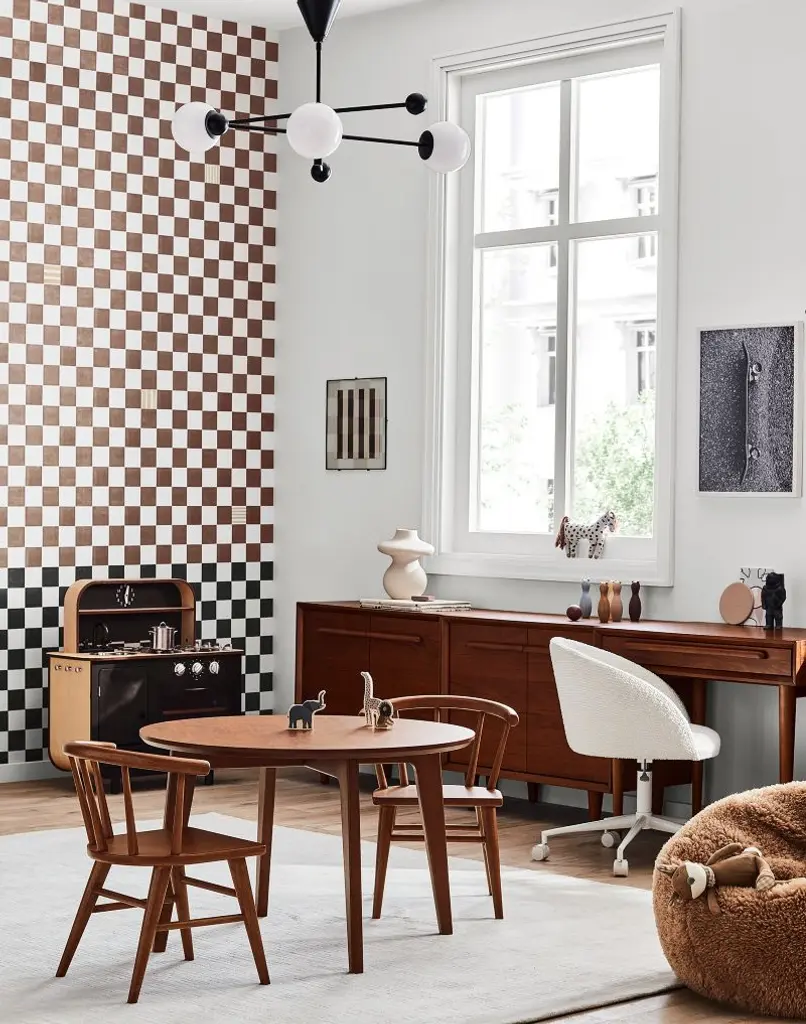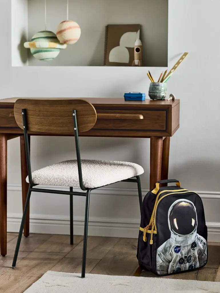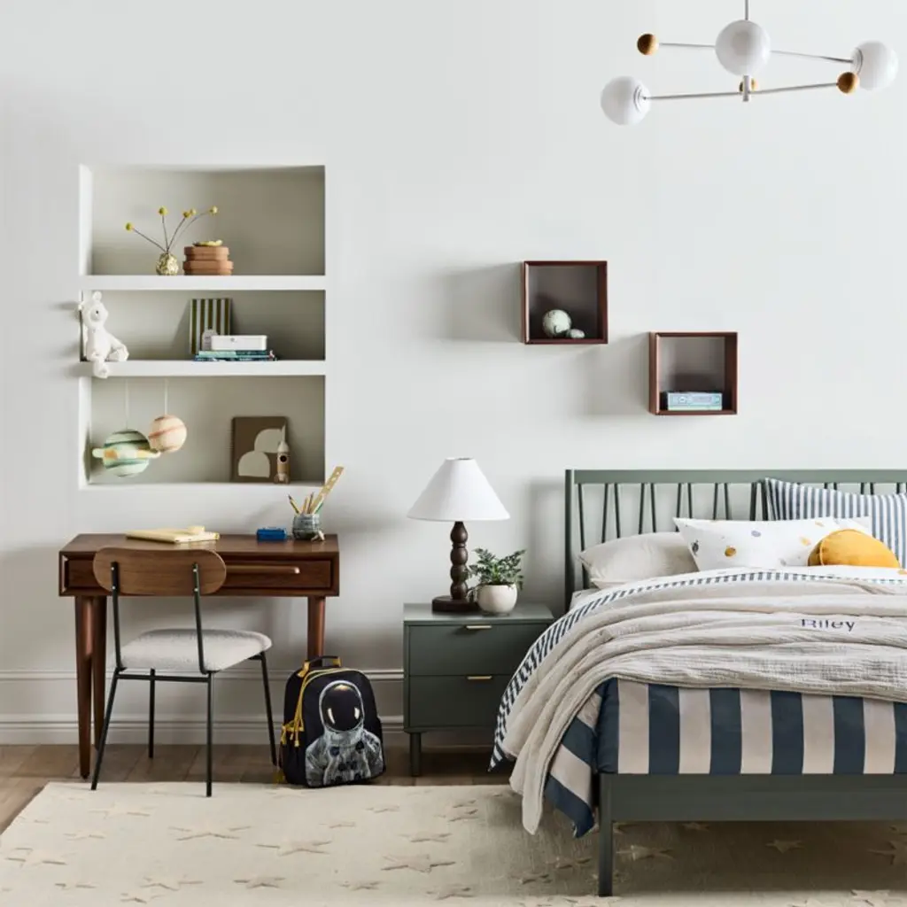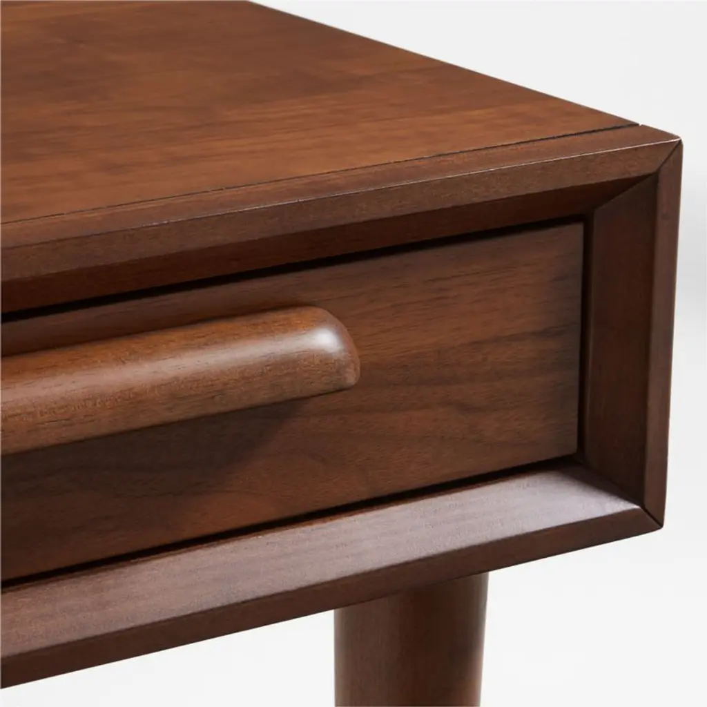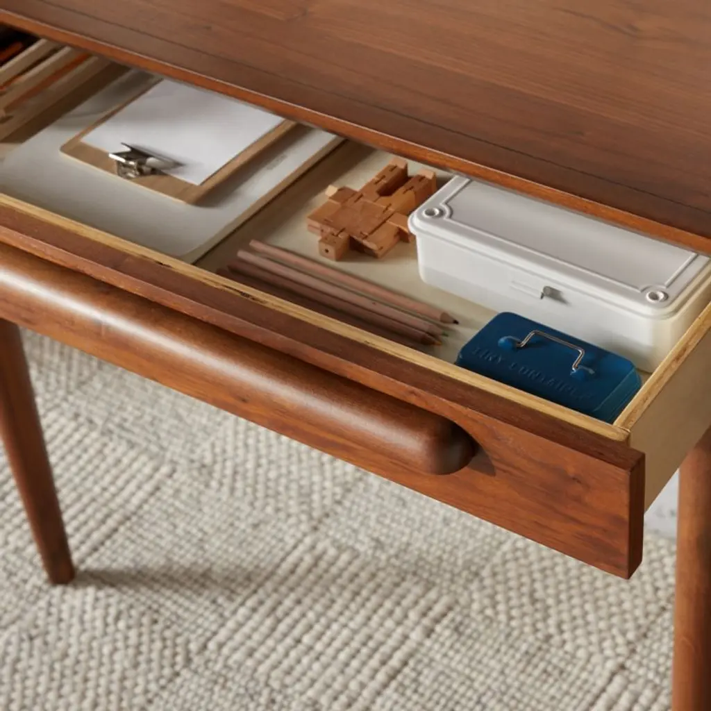 Meet Tatum. Crate & Kids' quintessential mid-century furniture collection for today's modern family. Tailored lines and tapered legs are expertly crafted in solid poplar and walnut veneer with a natural walnut finish to highlight the gorgeous grain pattern. Our Tatum Desk features one smooth-gliding drawer with a linear undercut drawer pull, perfect for tucking away school and art supplies. Create a timeless design with coordinating pieces from our Tatum collection.