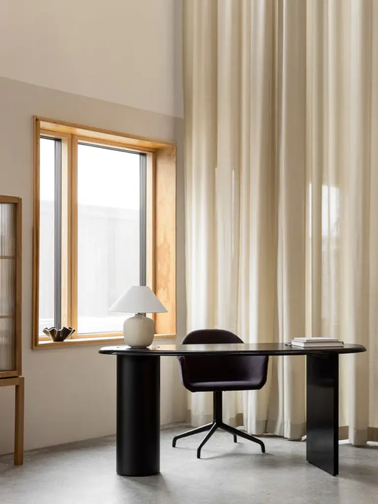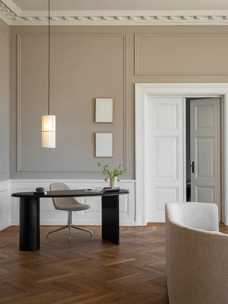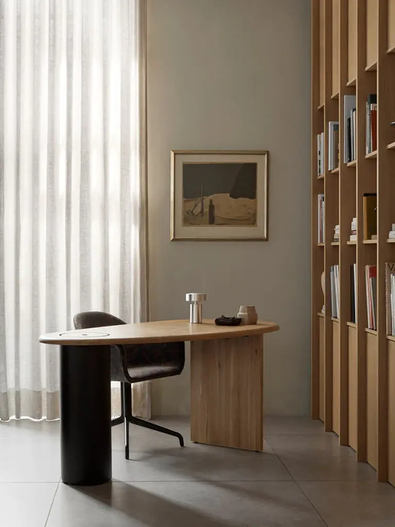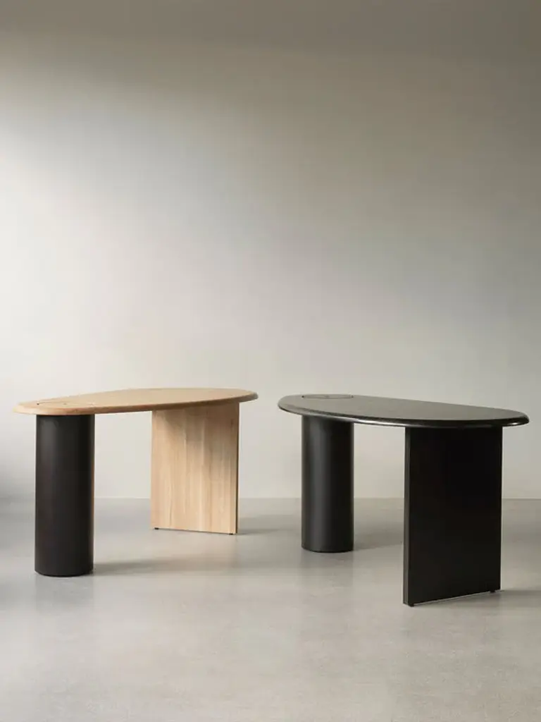 The Eclipse Desk is a celebration of materials and form. Named after its concave and convex form that resembles the illuminated passage of celestial bodies in the sky, the Fred Rigby design has a distinctive, asymmetrical silhouette that invites to touch. Available in solid oak, dark-oiled oak and oiled natural oak with a black painted leg, the tabletop is fitted with a lid that lifts to reveal hidden storage within the supportive steel column, ensuring desk space remains free of clutter. Designed to stand alone as a centerpiece in the middle of a room or for placement up against a wall as a more conventional piece of home office furniture, its intriguing form draws the eye.