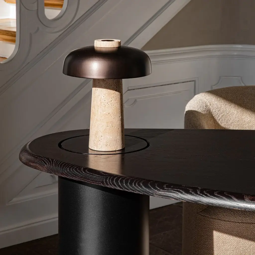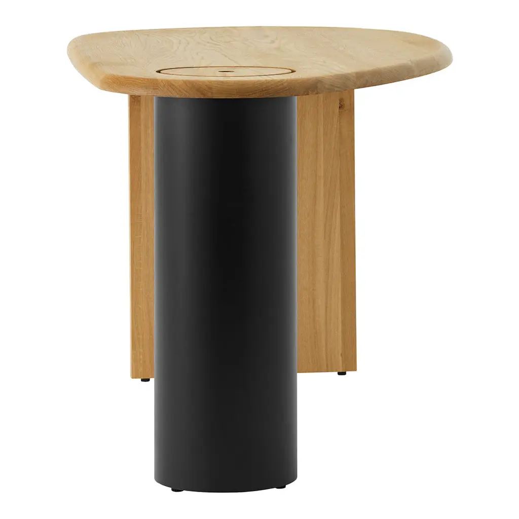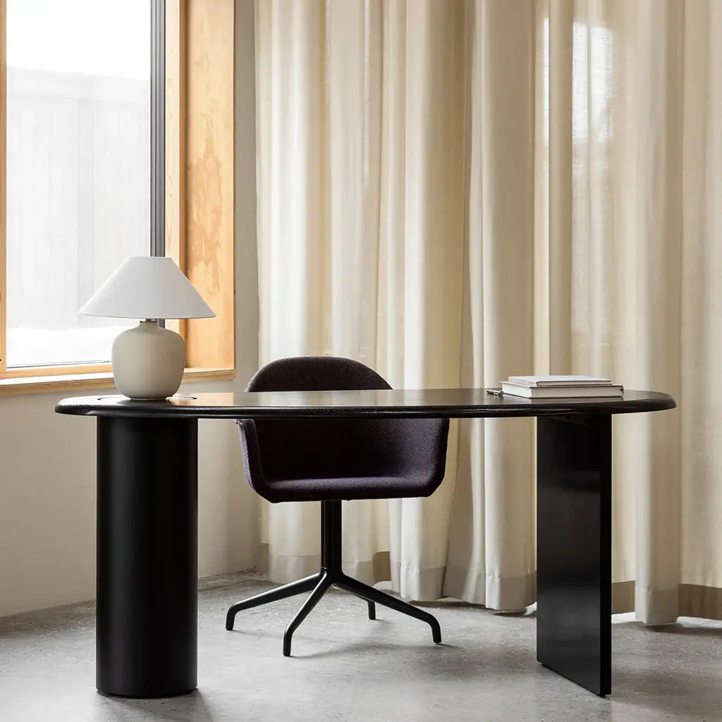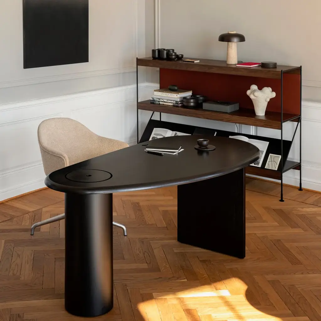 A celebration of materials and form, the asymmetrical The Eclipse Desk is based on a hand-drawn line, shaped from solid, dark oiled oak into a sweeping tabletop with a convex and a concave edge. Polished to a shine, it rests on a sturdy, flat leg, and a round steel column, for a distinctive silhouette that adds a sense of drama to the organic piece. Additional storage and cable management hidden in the steel column provides a clean and neat working space.