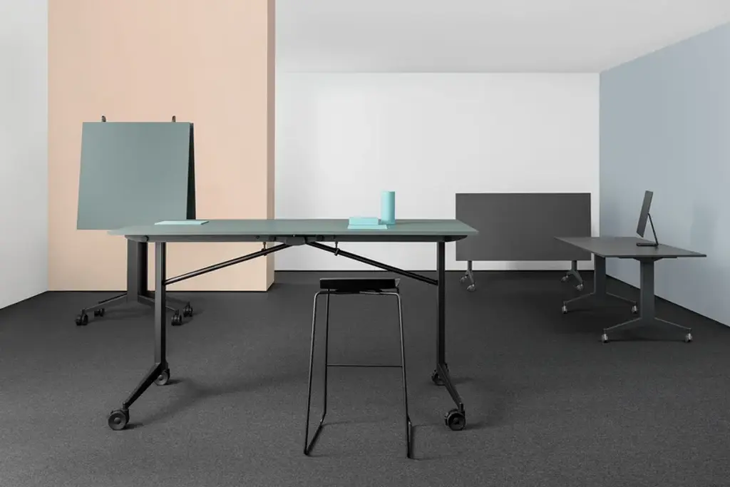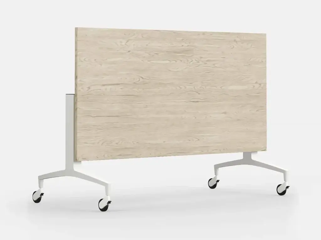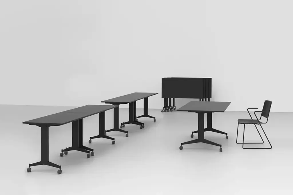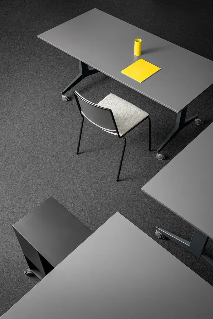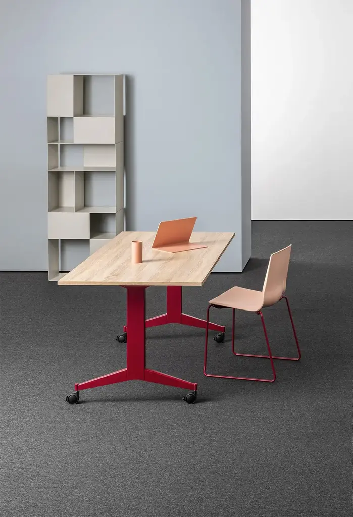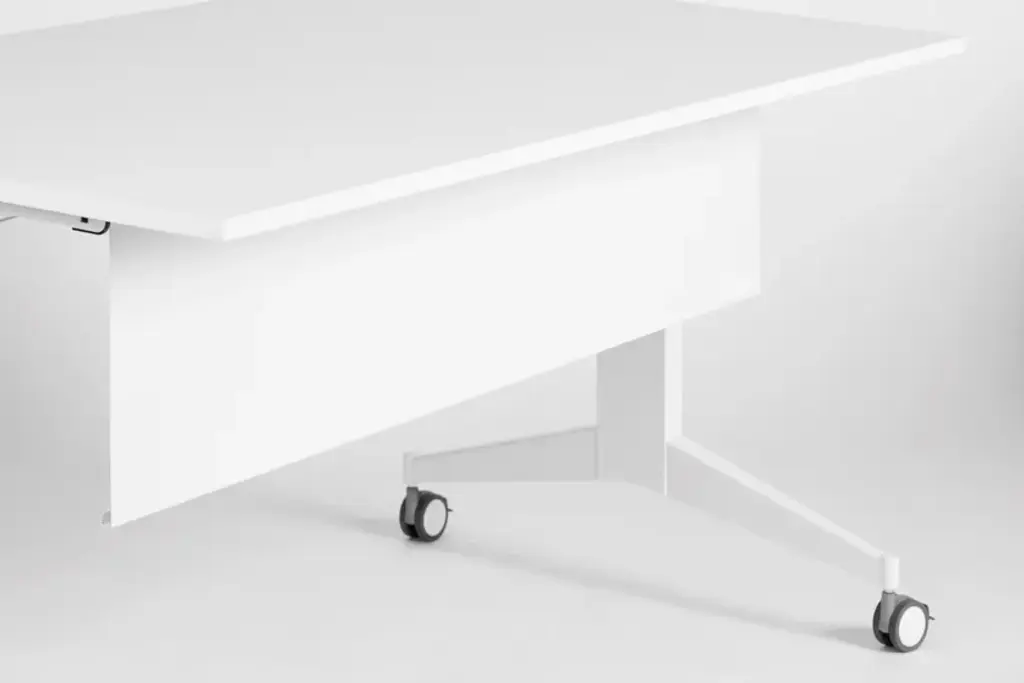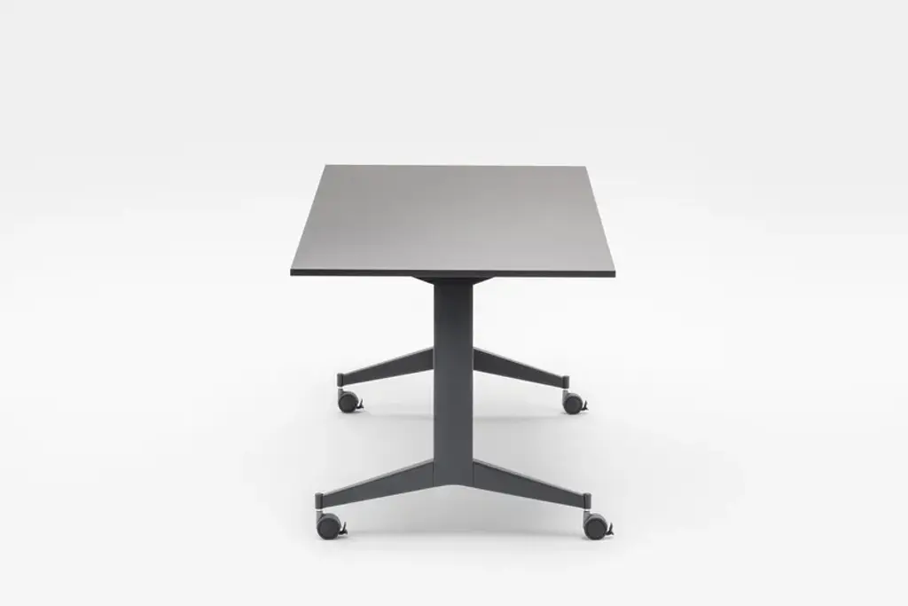 Sturdy and safe table characterized by a space saving tilting-top system. When the table top is in vertical position, thanks to its reduced dimensions it is possible to stack 9 tables in approx. 2 meters. The innovative opening mechanism of the top, a single control to unlock the movement, allows even one person to easily move the table in total security.Top thickness:Colored or wood-effect melamine: 19mm thick.Colored or textured laminate/fenix: 20mm thick.