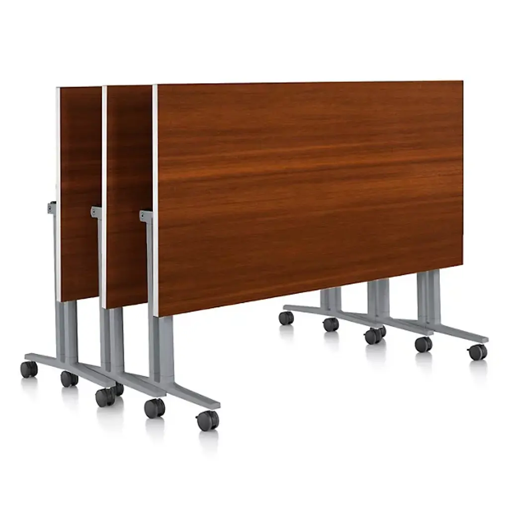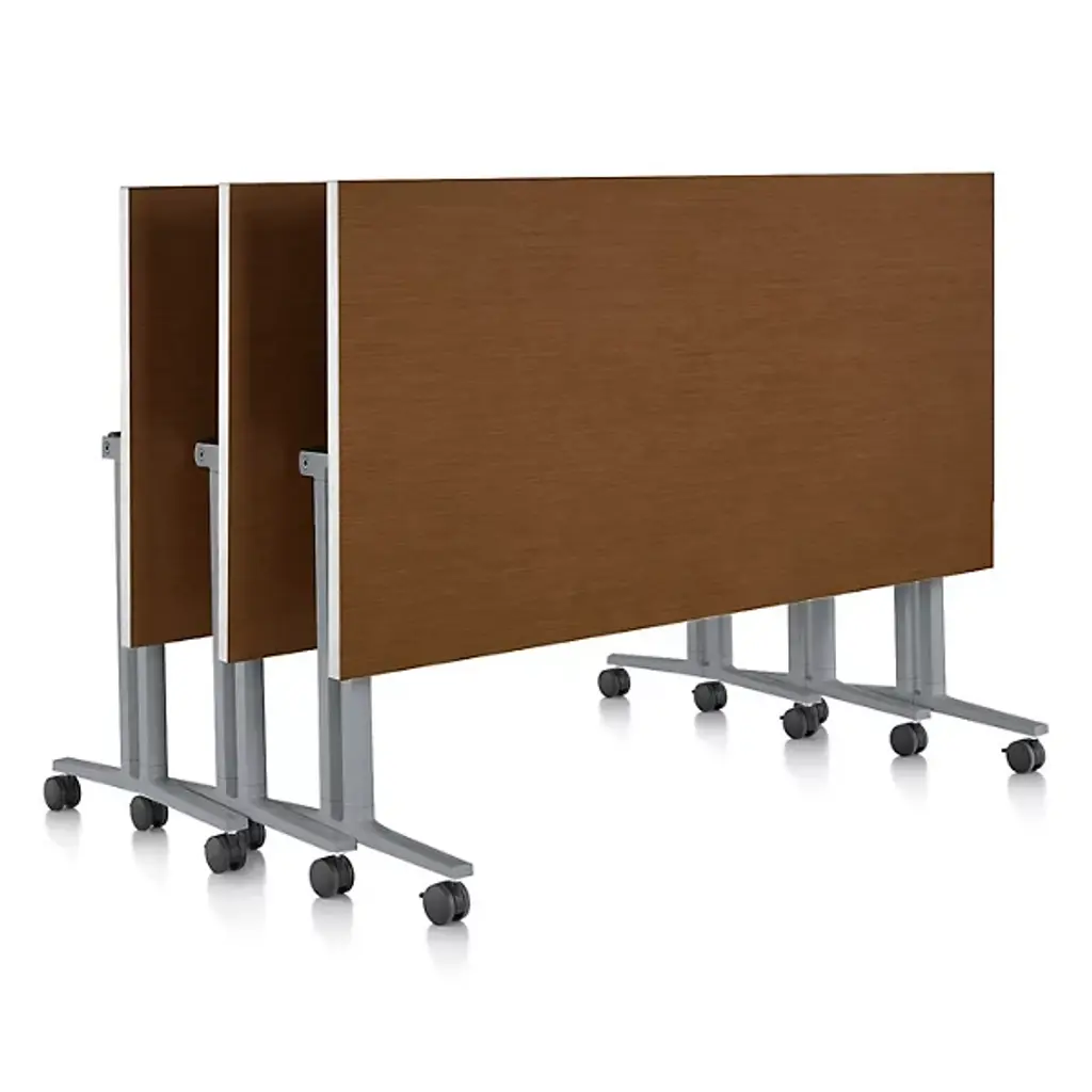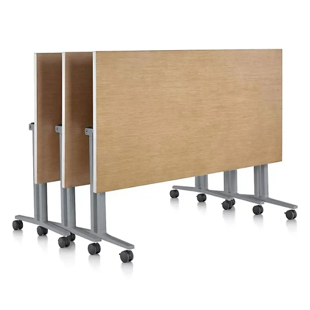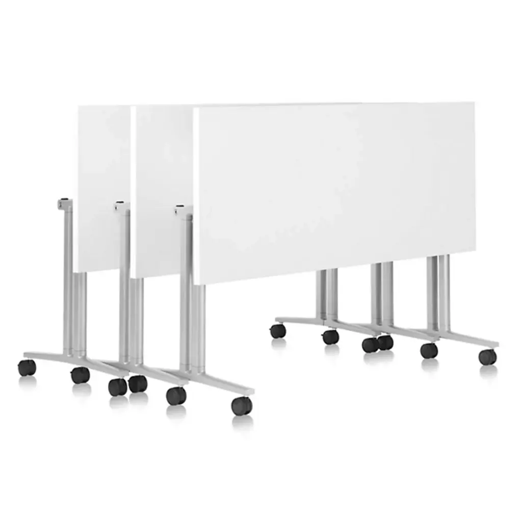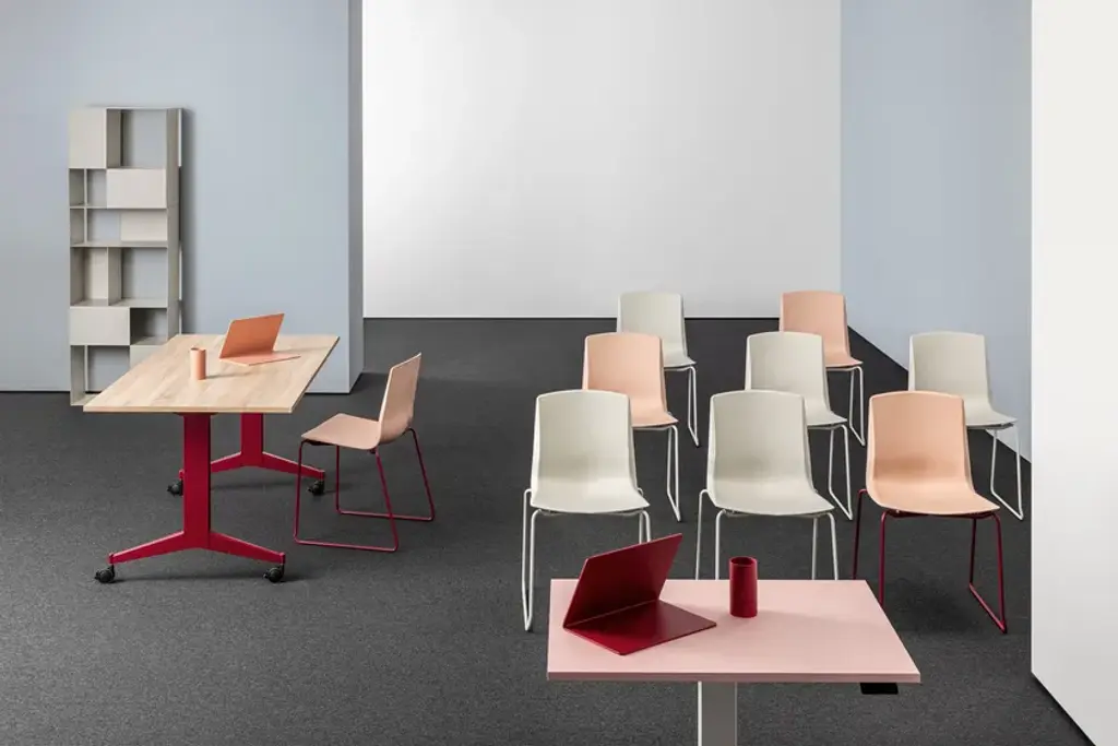 Sturdy and safe table characterized by a space saving tilting-top system. When the table top is in vertical position, thanks to its reduced dimensions it is possible to stack 9 tables in approx. 2 meters. The innovative opening mechanism of the top, a single control to unlock the movement, allows even one person to easily move the table in total security.Top thickness:Colored or wood-effect melamine: 19mm thick.Colored or textured laminate/fenix: 20mm thick.