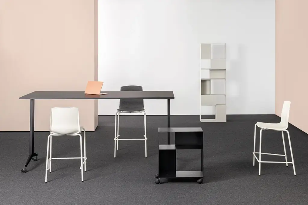Timmy Tilting enlarge with height 1050 mm version: a sturdy and stable tilting table which offers a great space saving. In the tilted top position it is possible to nest 9 tables within 2 meters.The innovative tilting mechanism of the top has a single unlock control device allowing one person to easily move tables bigger than 2 meters in total security.