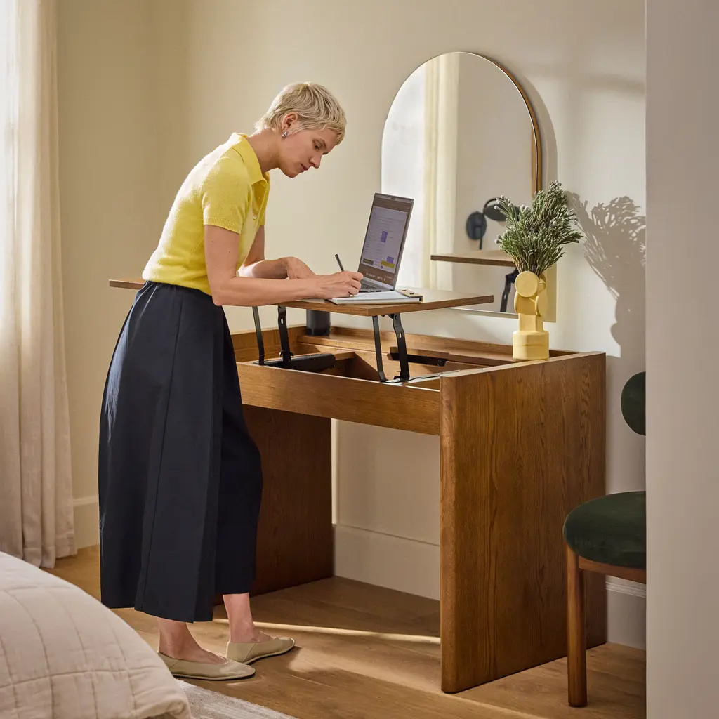 This desk deserves a standing ovation. In fact, it was designed to receive one. Transition seamlessly between sitting and standing by lifting the desktop. Enjoy functional, ergonomic comfort and bring that Scandi-inspired minimalist aesthetic into your home office. Whether you're thinking, typing, or shopping, do it in comfort and style. Your back will thank you.
