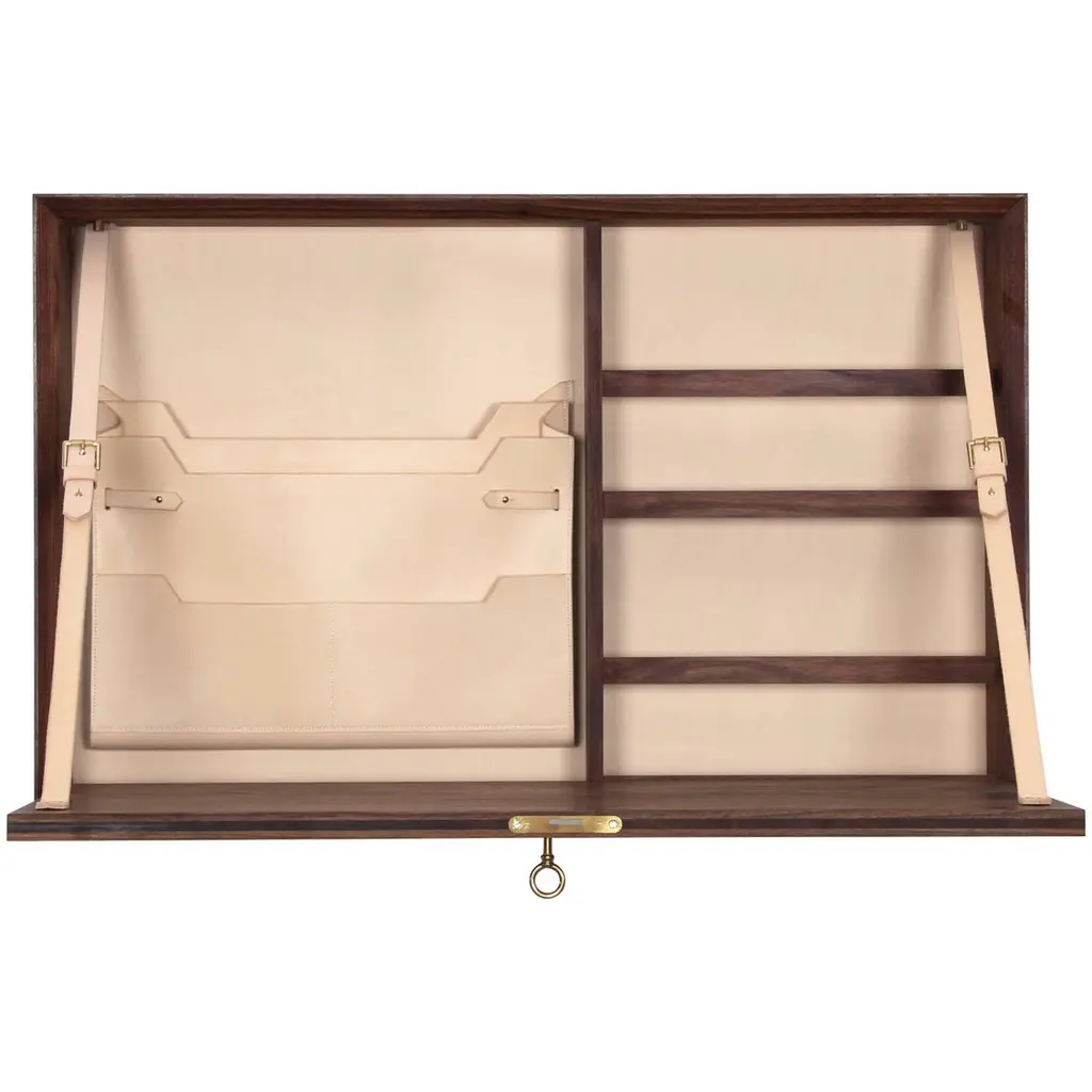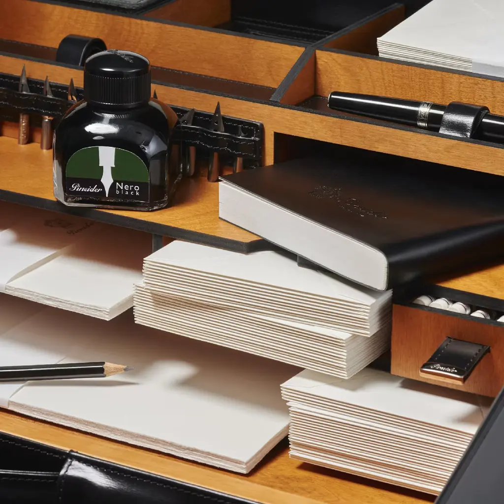 An authentic treasure chest for writing aficionados, this exclusive travel set desk is an absolute gem of Italian craftsmanship. The exterior is entirely covered in prized, smooth calfskin revealing an internal space in precious cherry wood. Compact and functional, the set includes a pad, ink pot (black ink included), 14 black pencils and a notebook with a leather cover. This exclusive item is completed by a stationery set comprising sheets, ivory-colored envelopes and cards (25 pieces per type) in various dimensions.